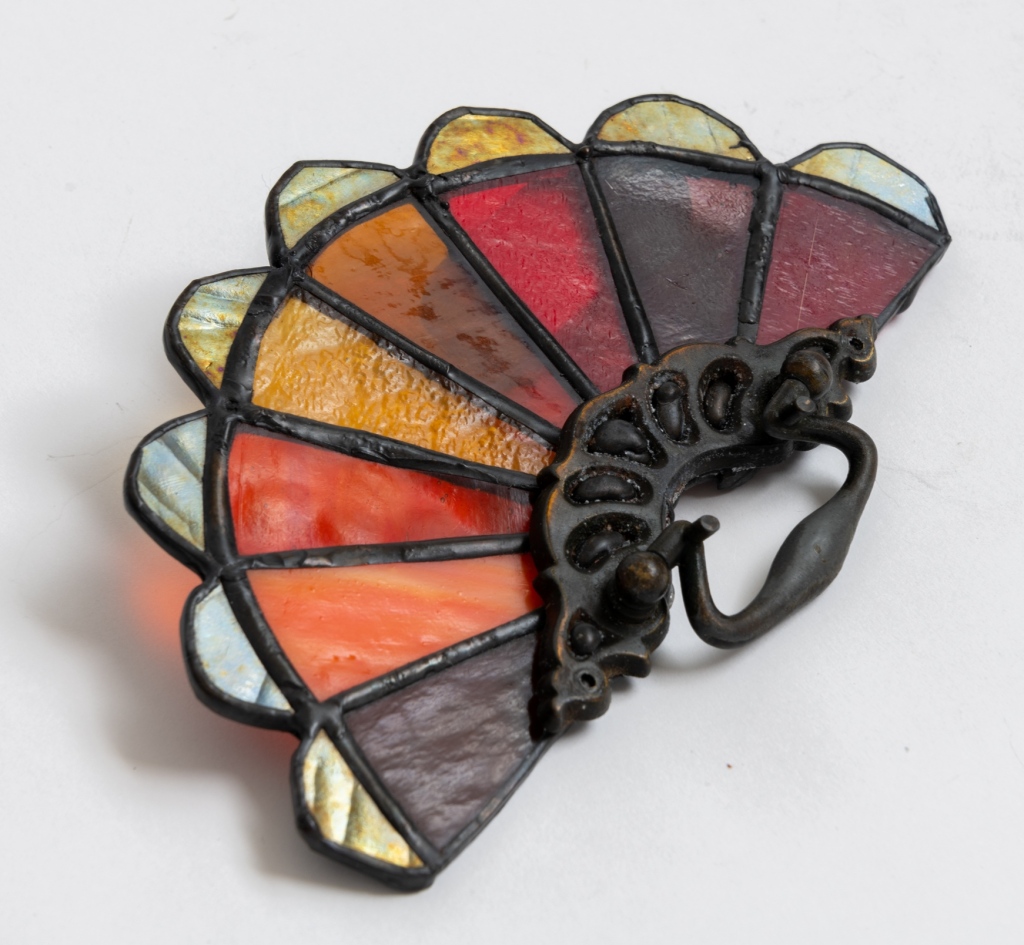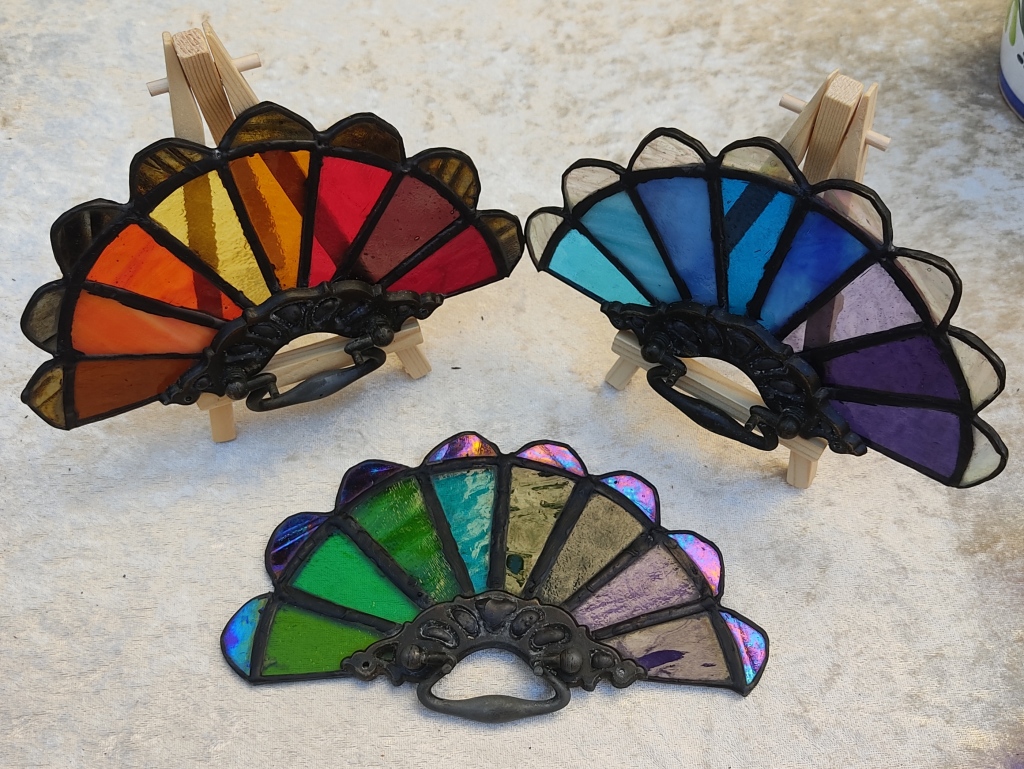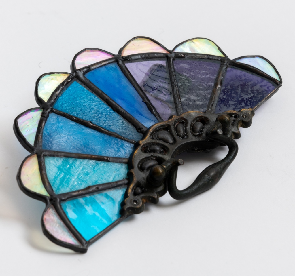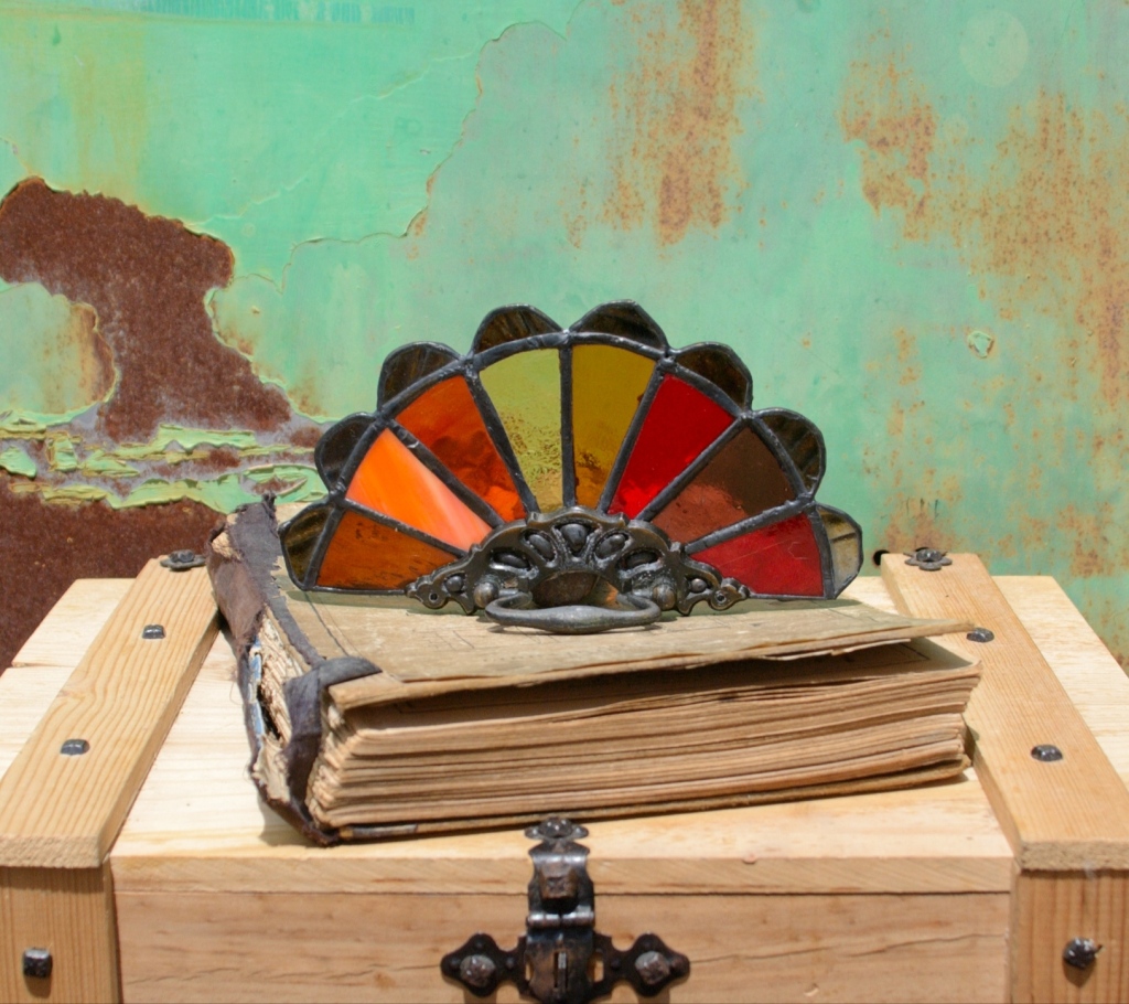 Reutilizando tiradores de cajones de bronce antiguo, creamos estos vitrales en forma de abanicos.