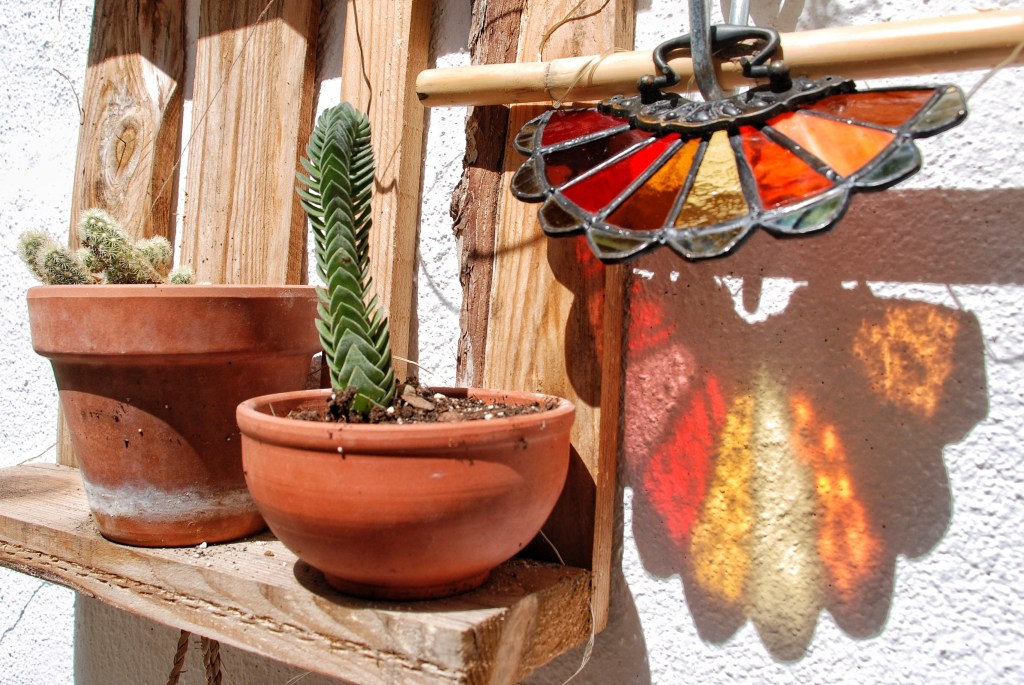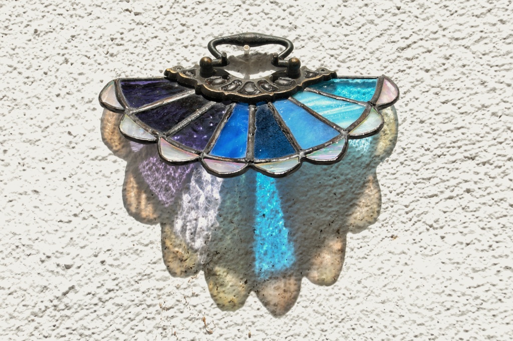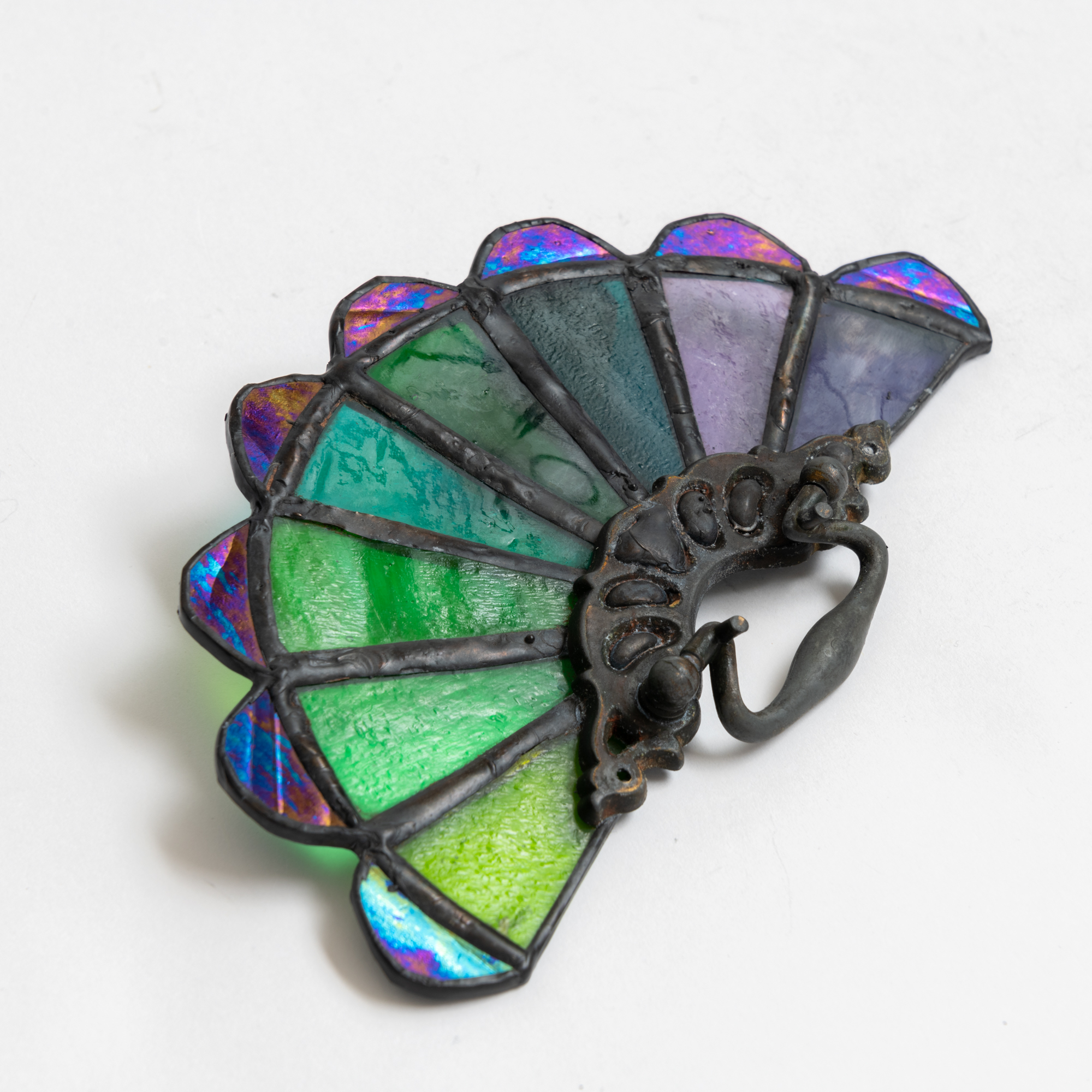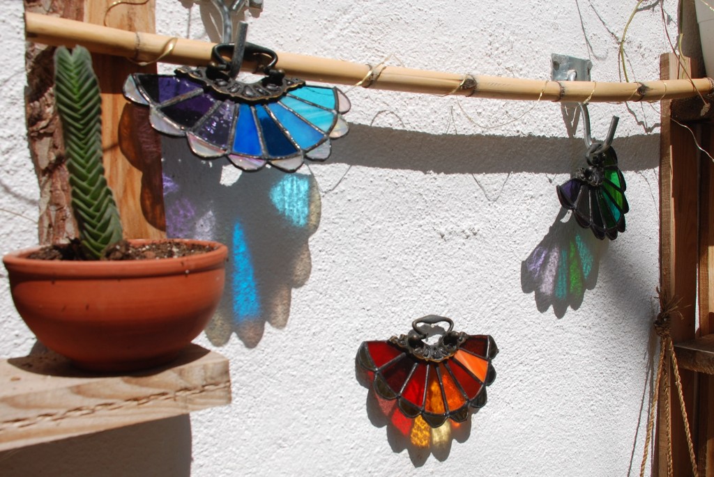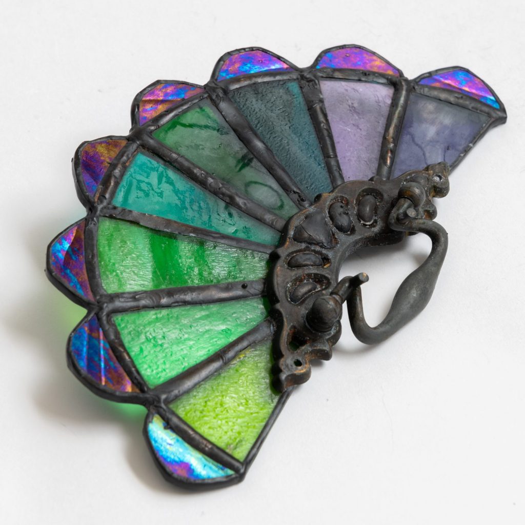 Reutilizando tiradores de cajones de bronce antiguo, creamos estos vitrales en forma de abanicos.