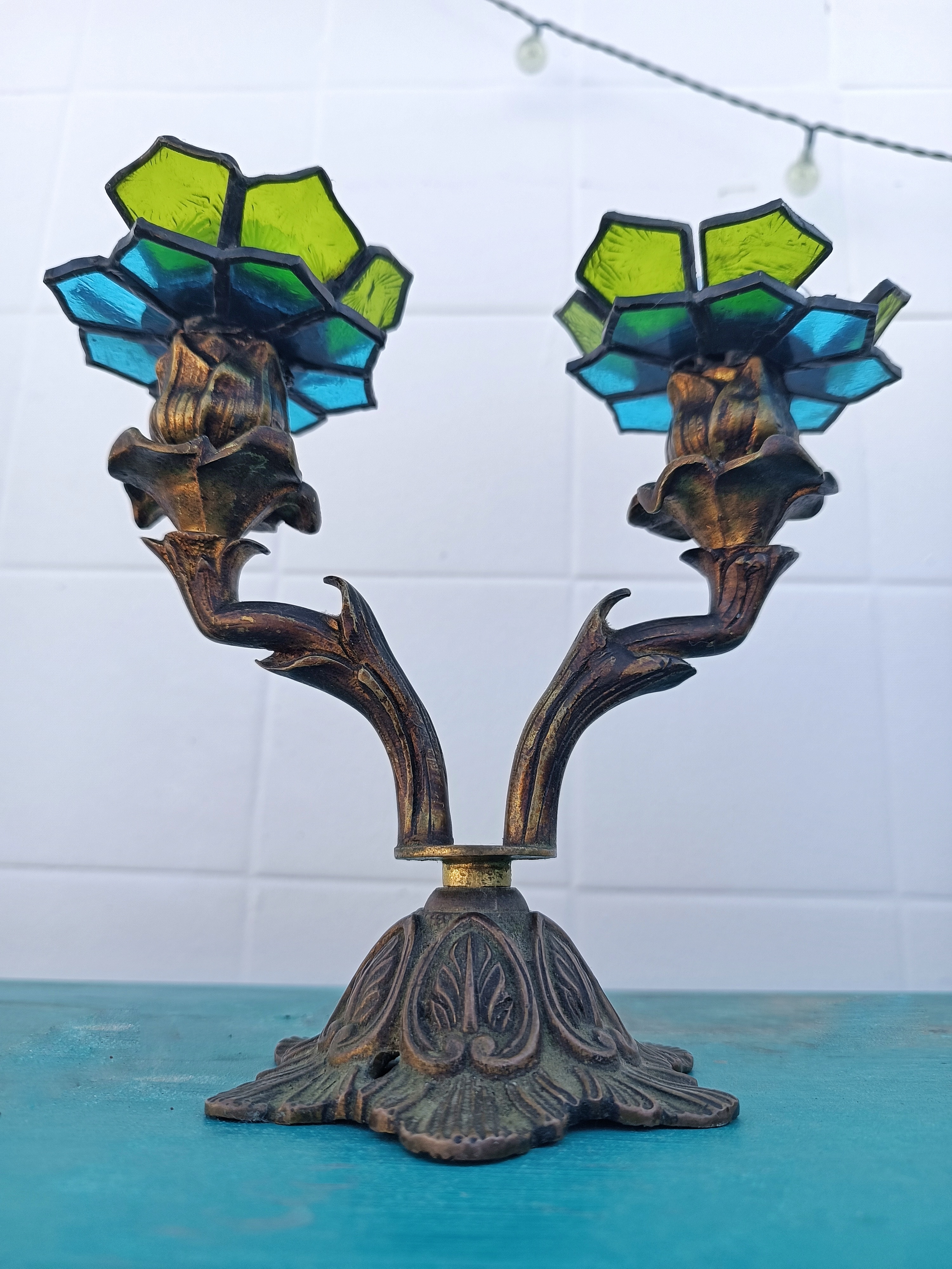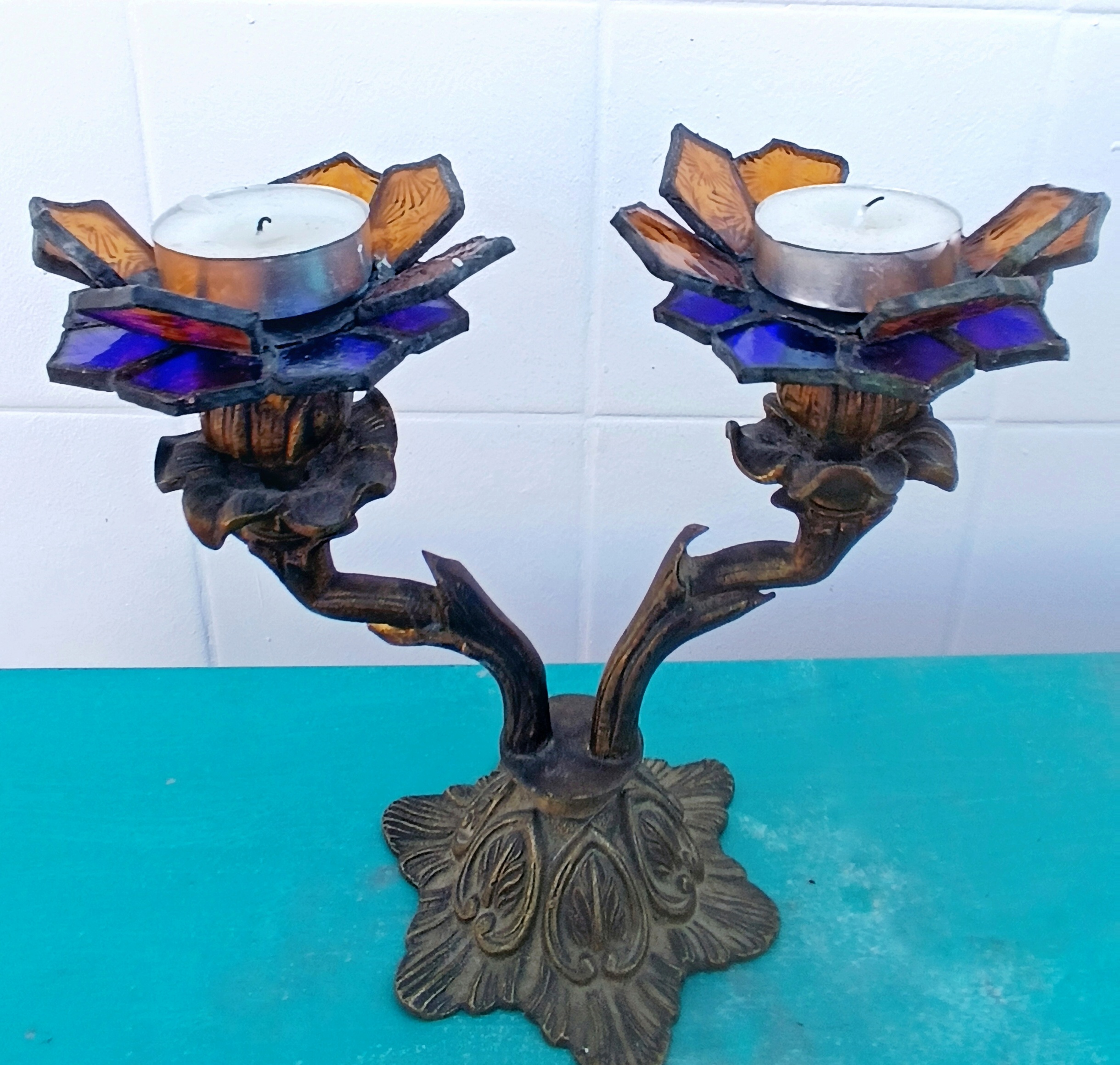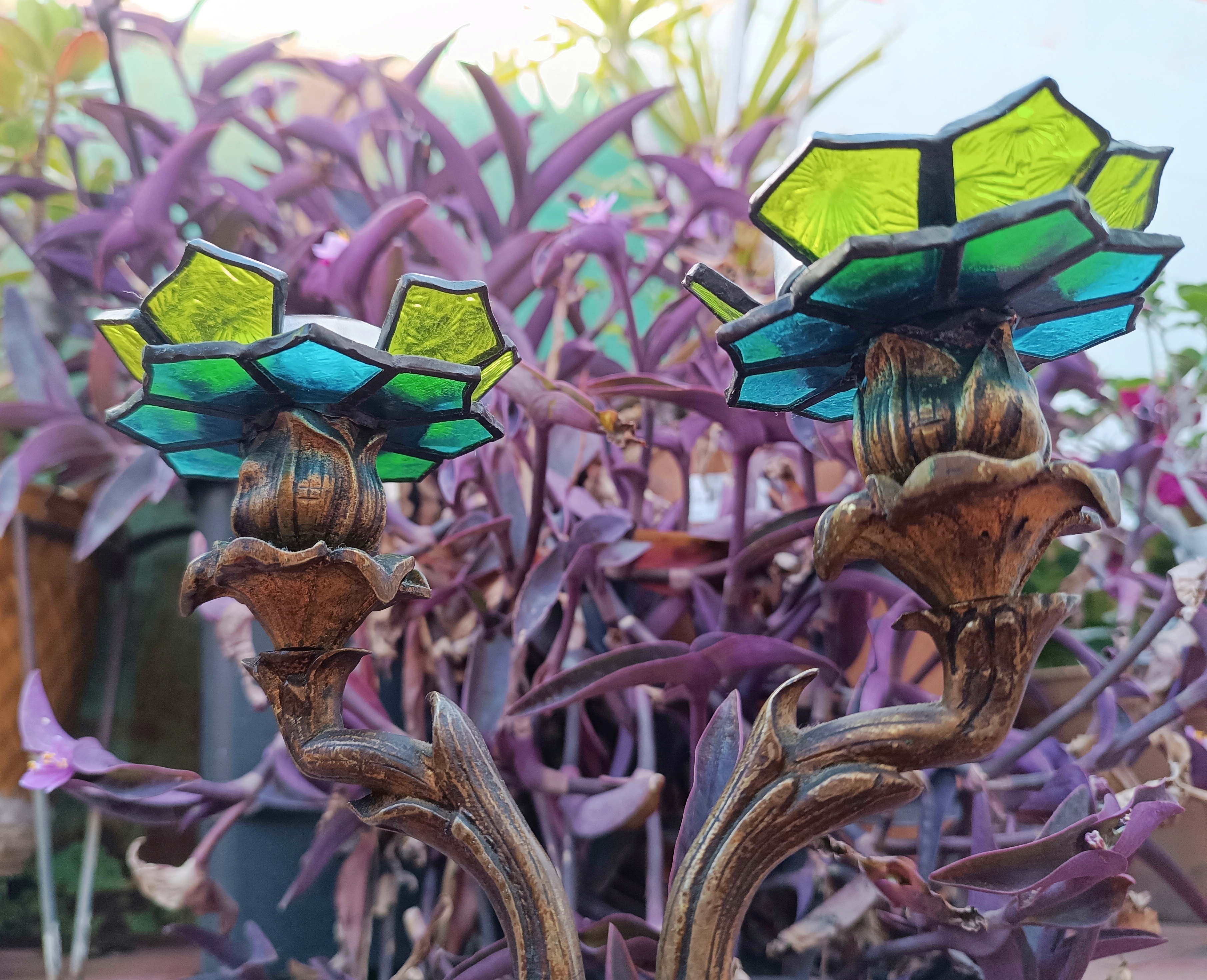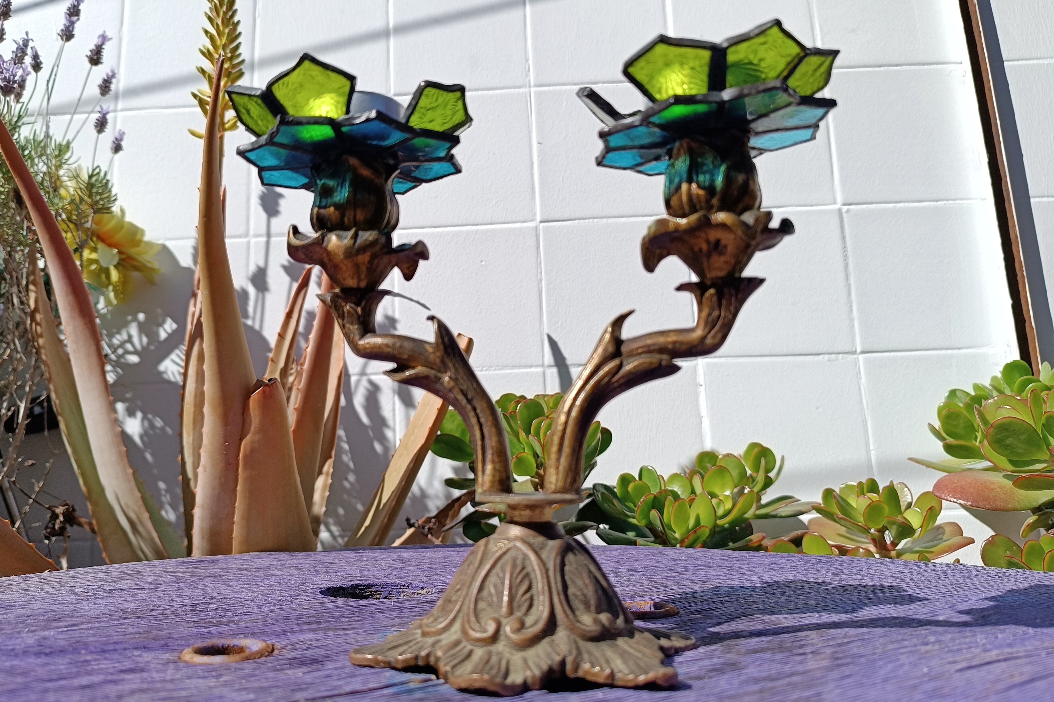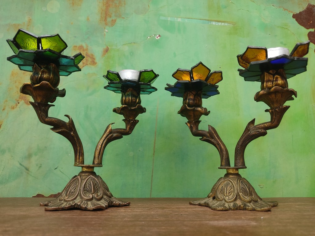 Transformamos dos candelabros de bronce ornamentados en portavelas, creando soportes de vitral en forma de flores.