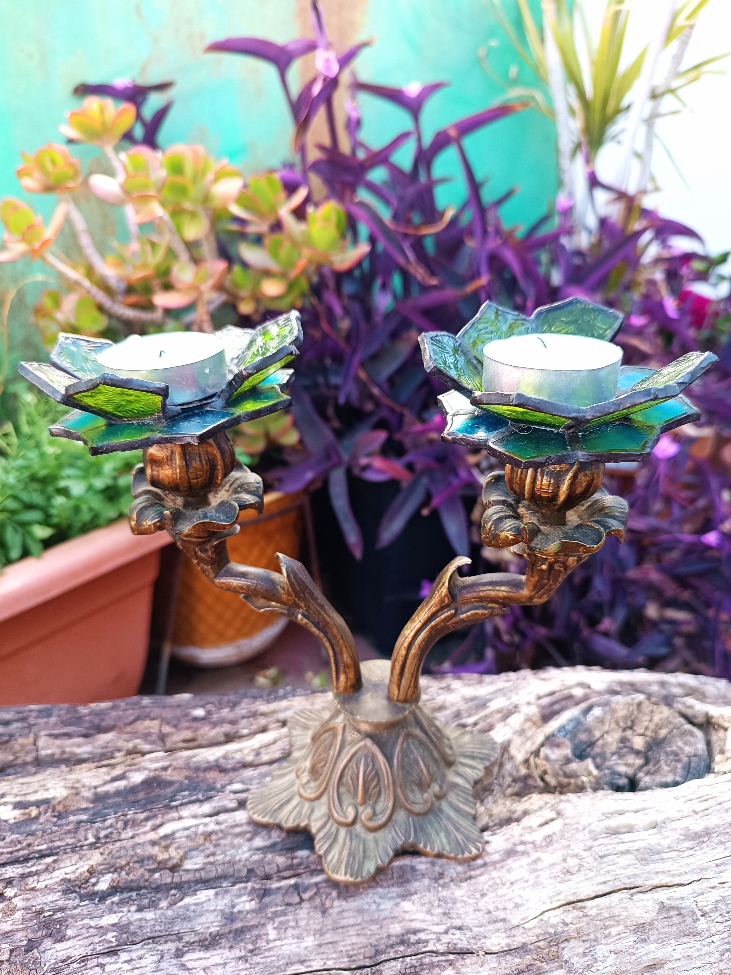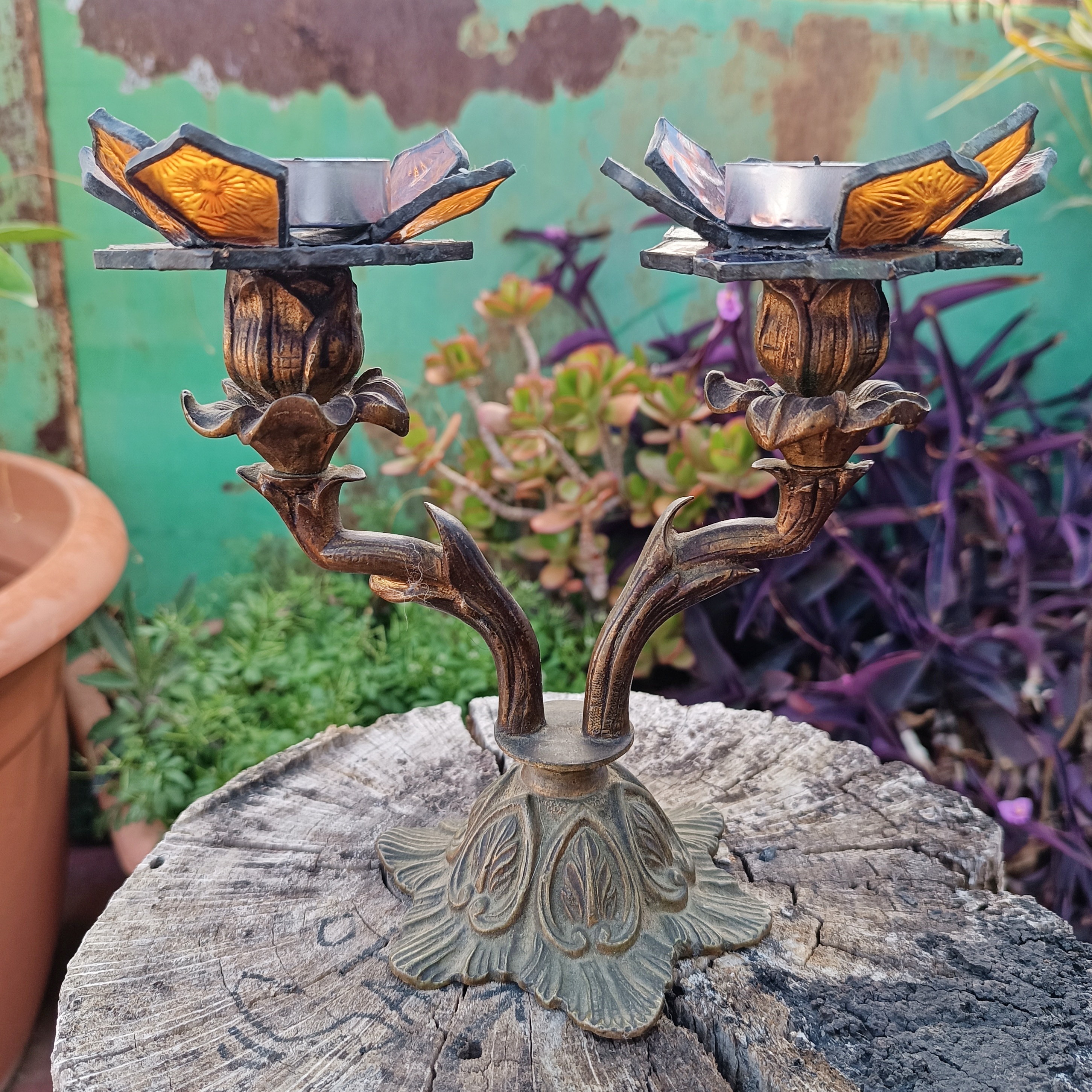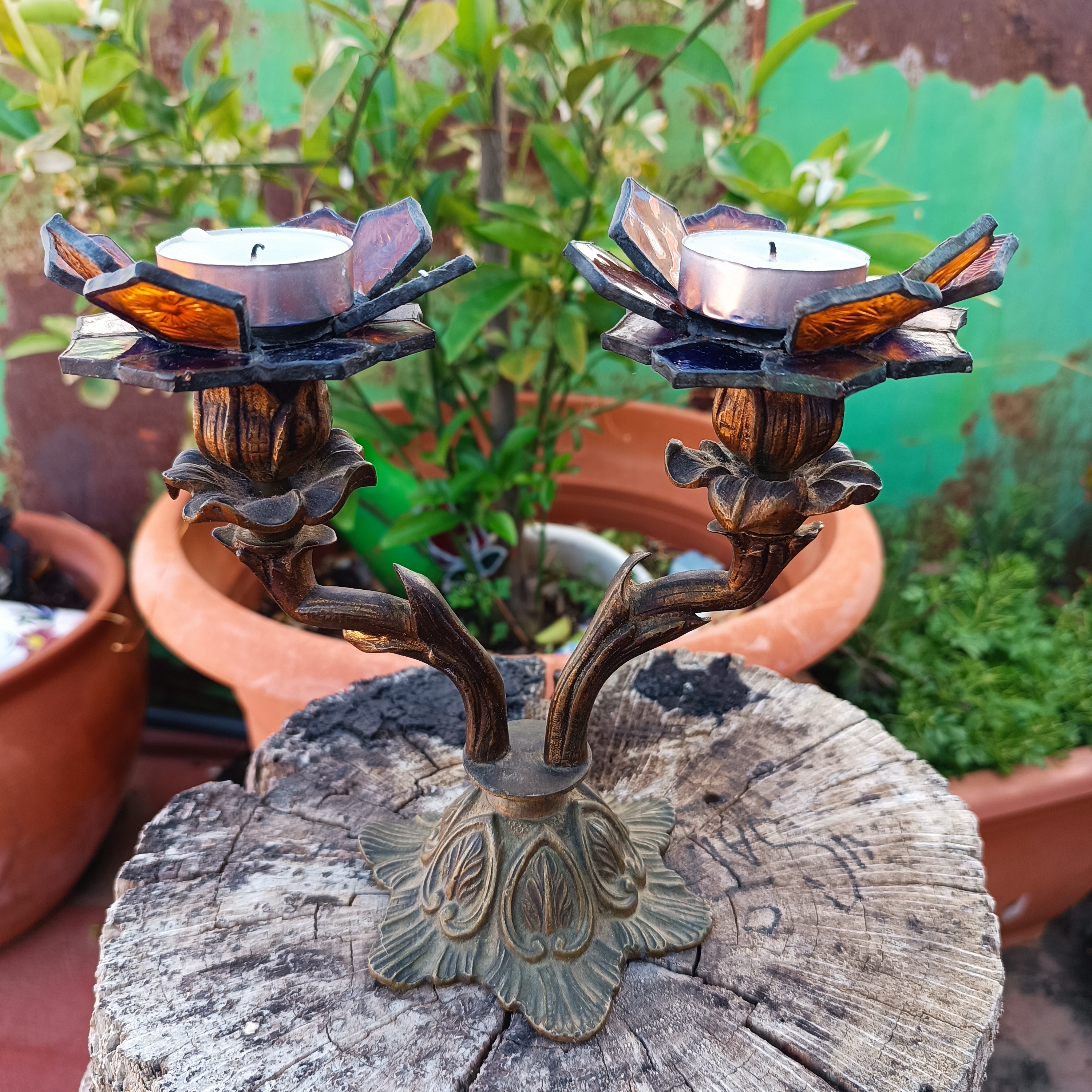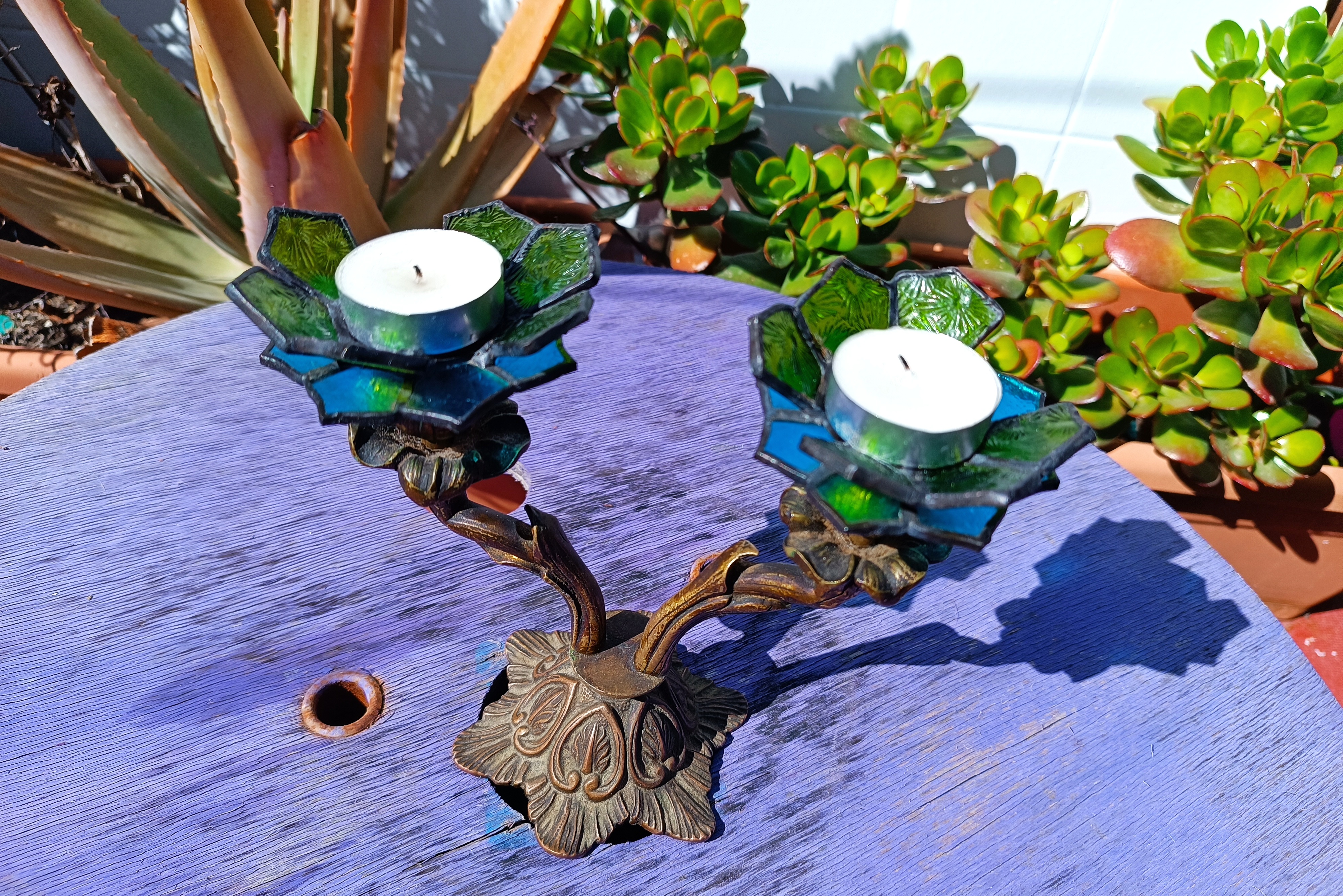 Transformamos dos candelabros de bronce ornamentados en portavelas, creando soportes de vitral en forma de flores.