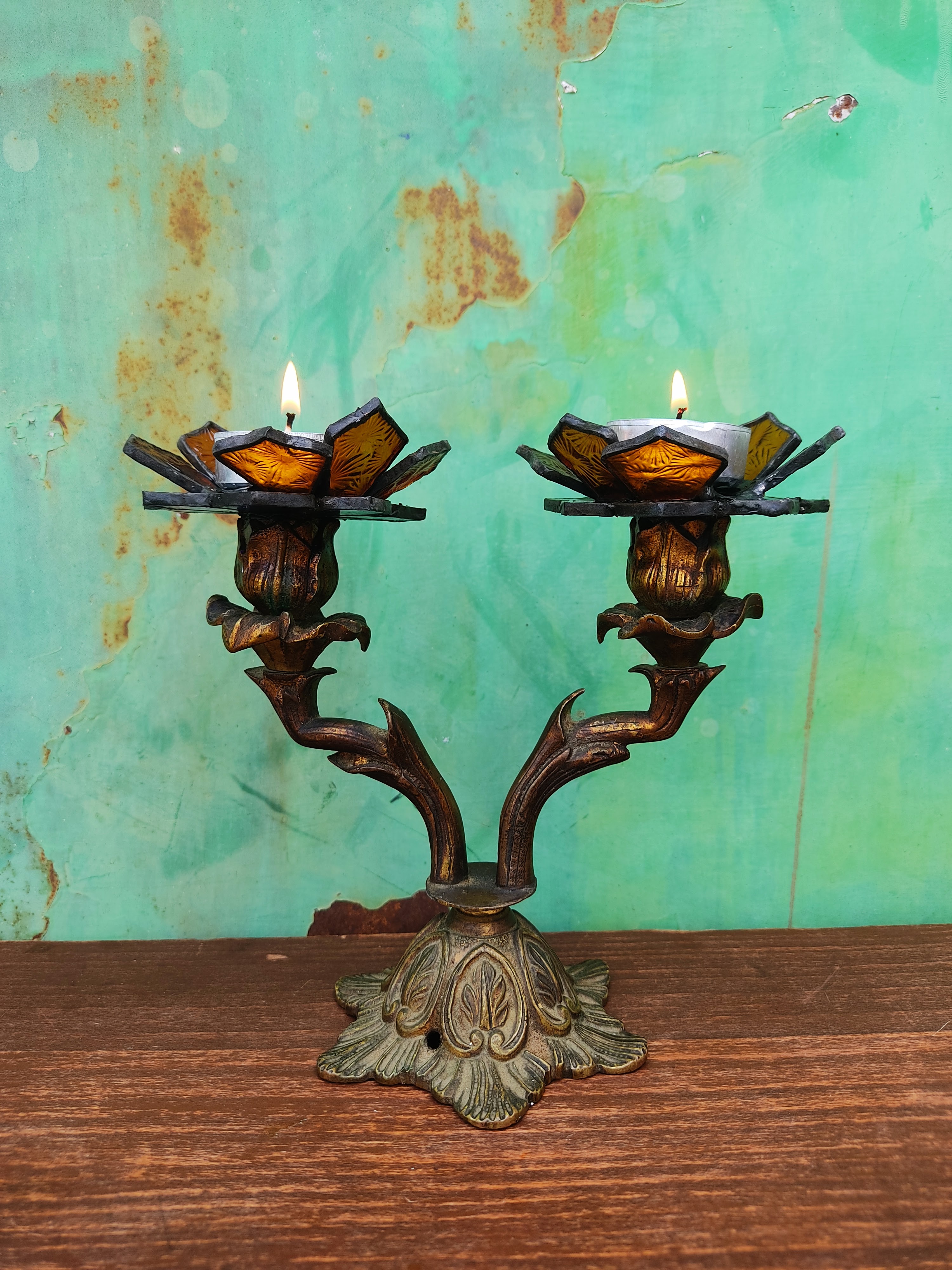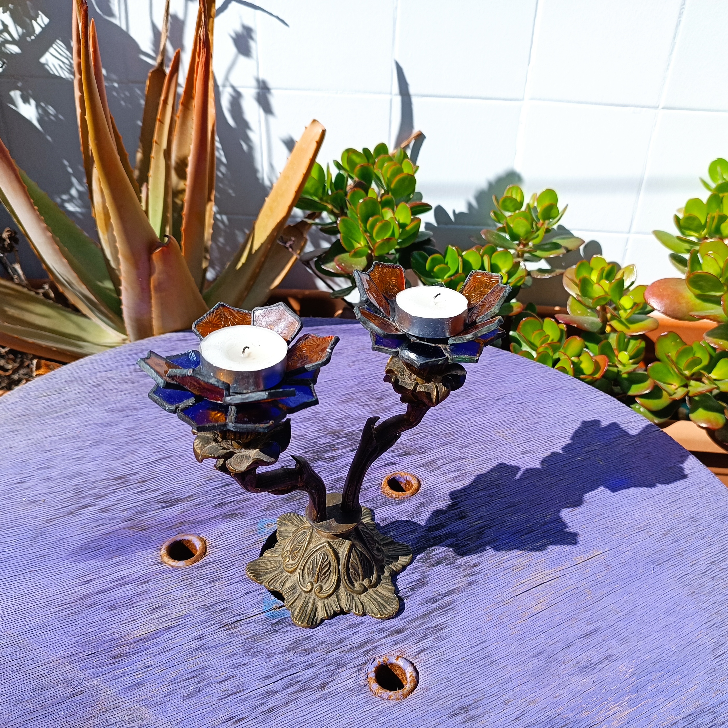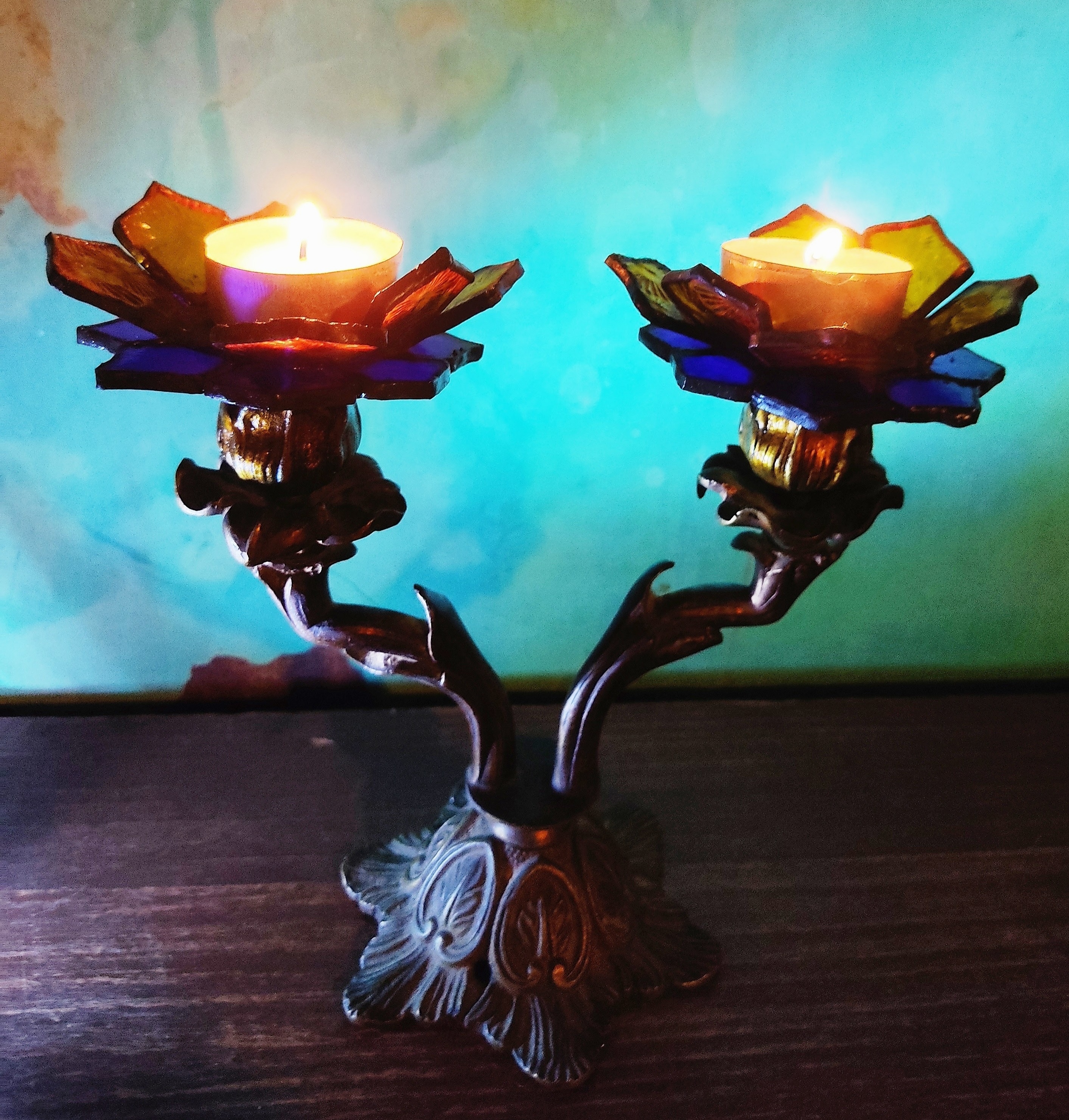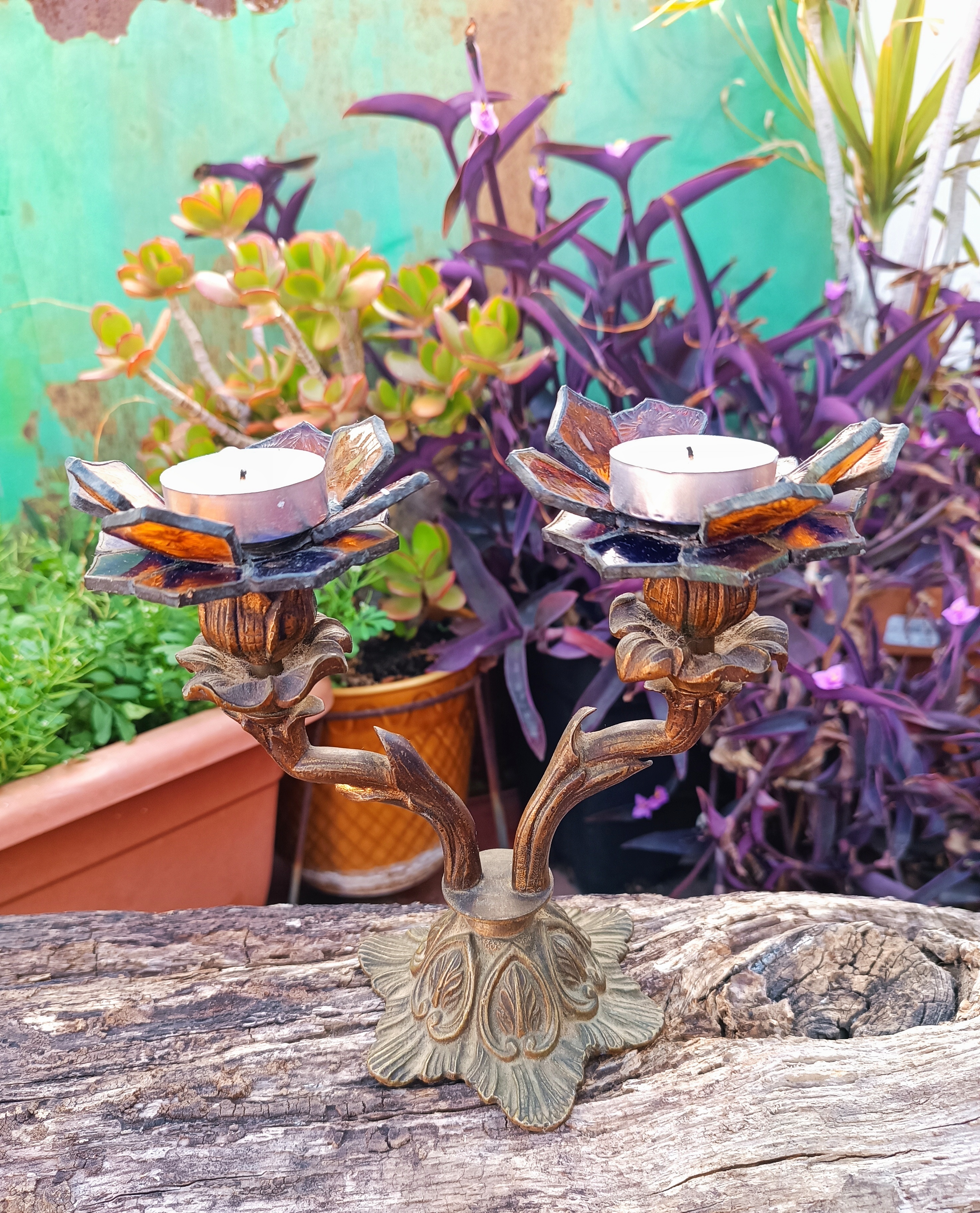 Transformamos dos candelabros de bronce ornamentados en portavelas, creando soportes de vitral en forma de flores.
