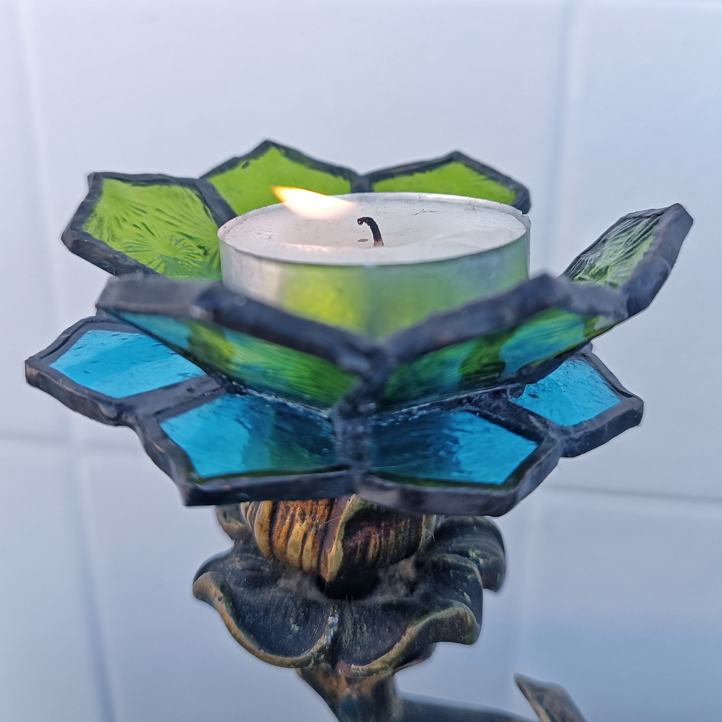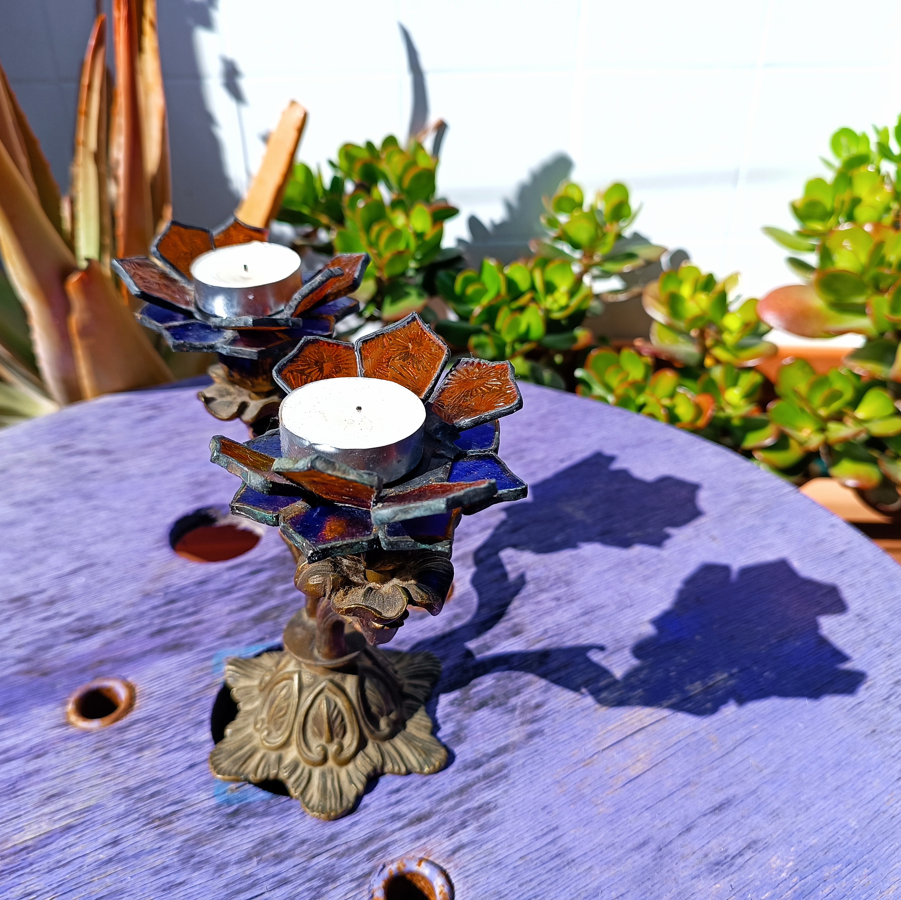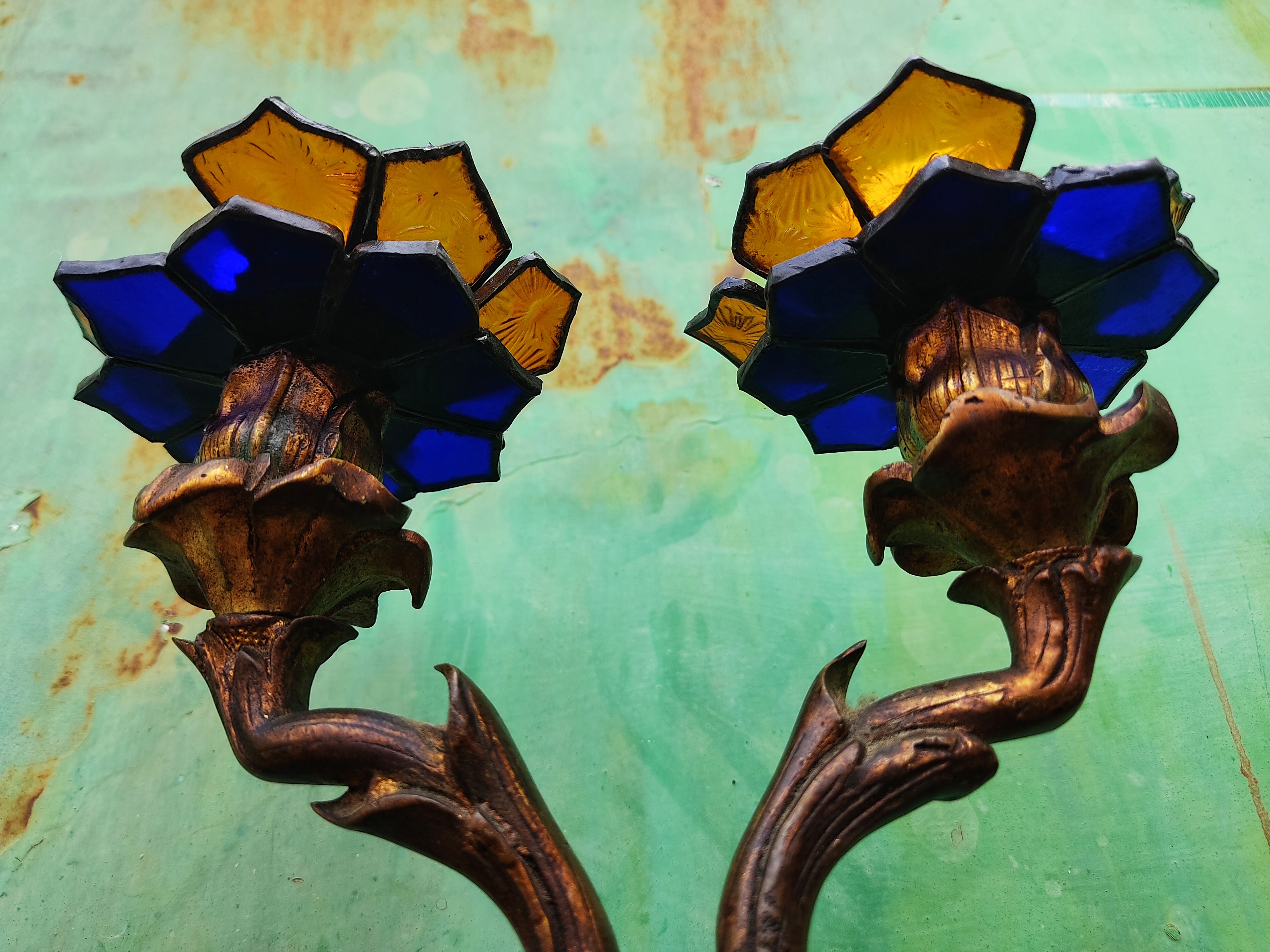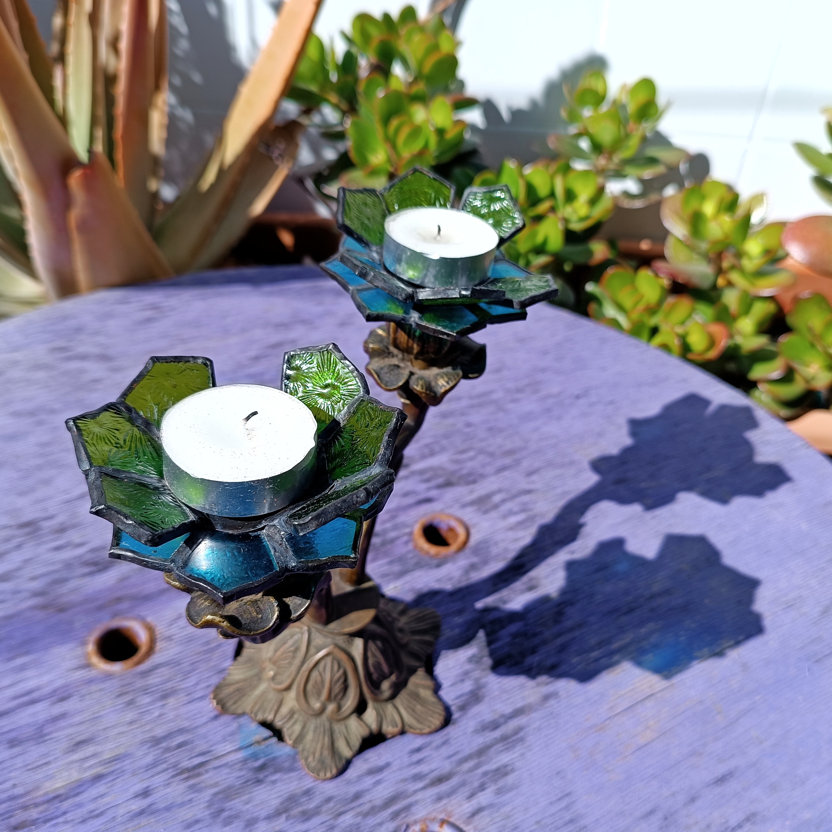 Transformamos dos candelabros de bronce ornamentados en portavelas, creando soportes de vitral en forma de flores.