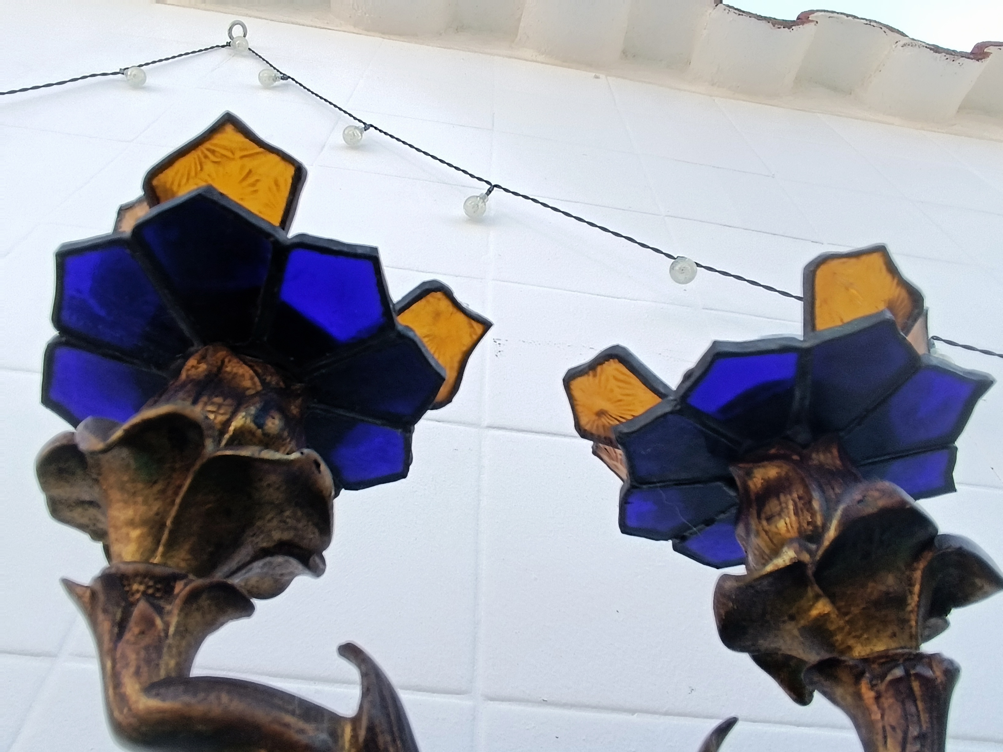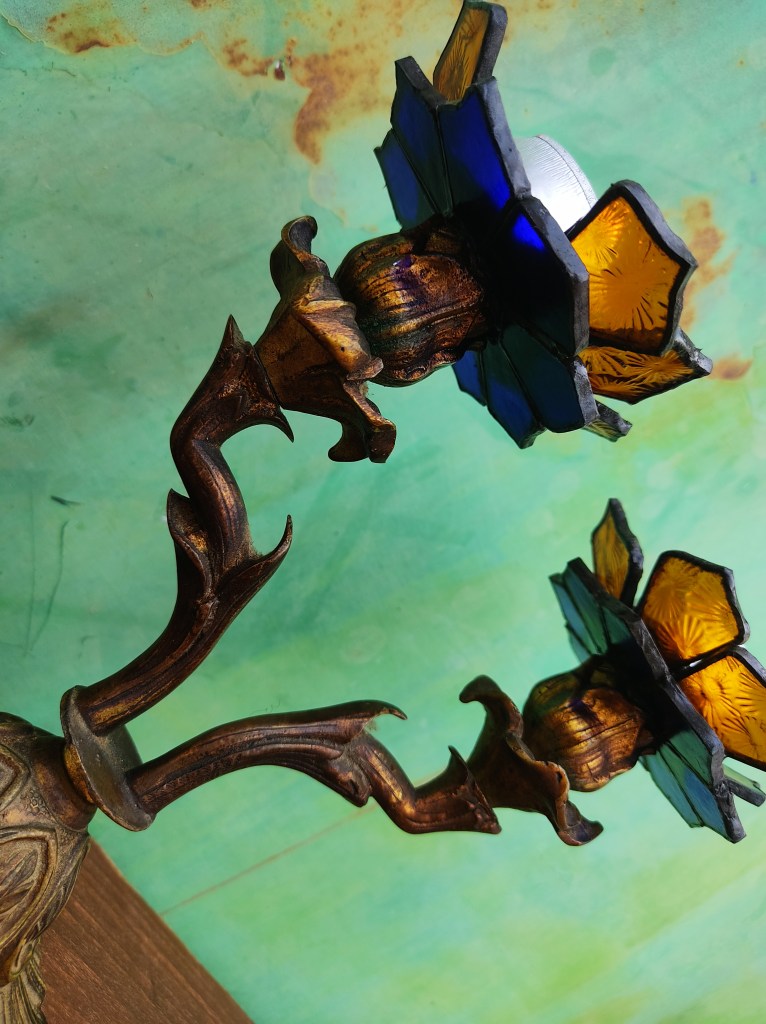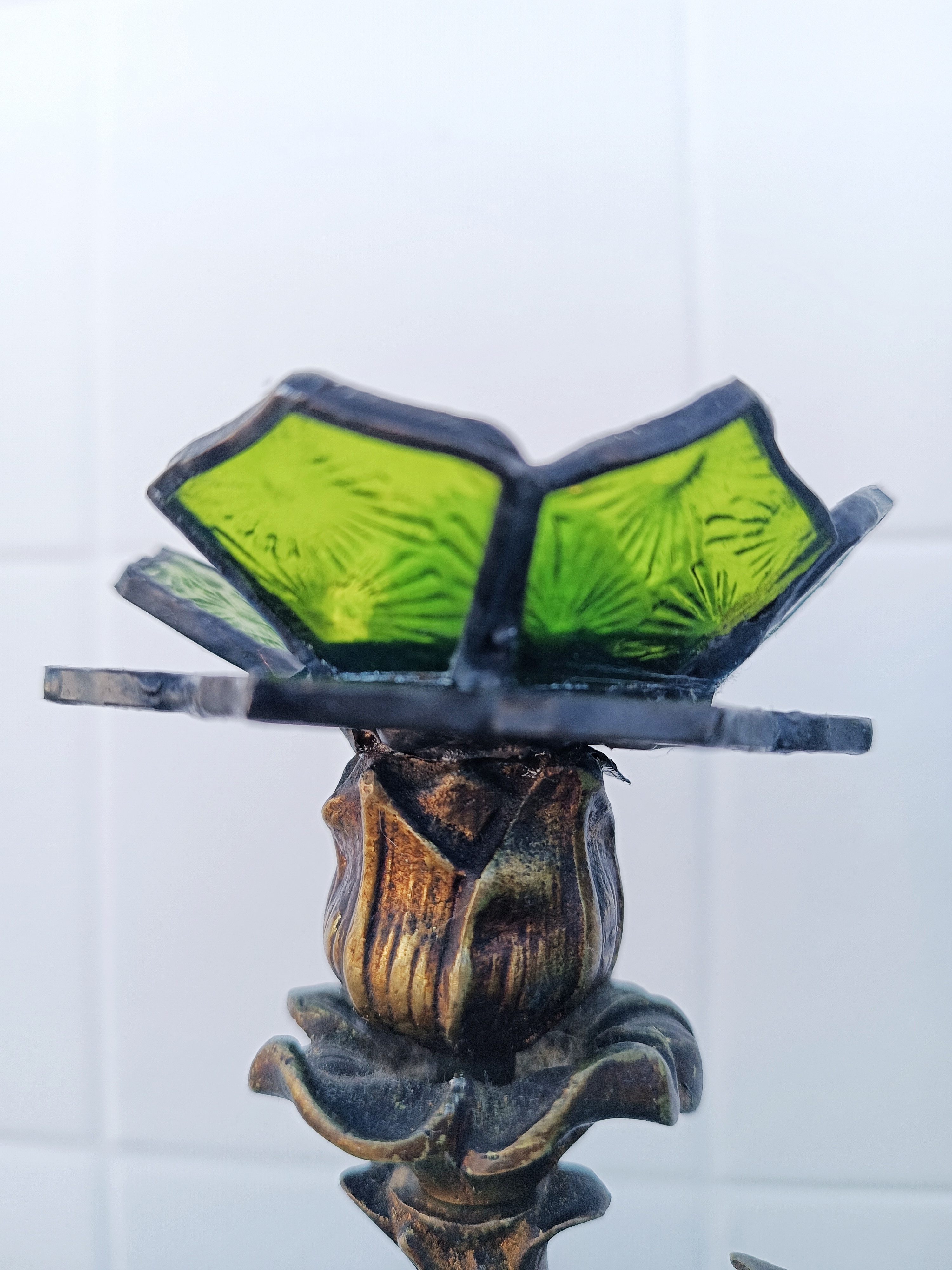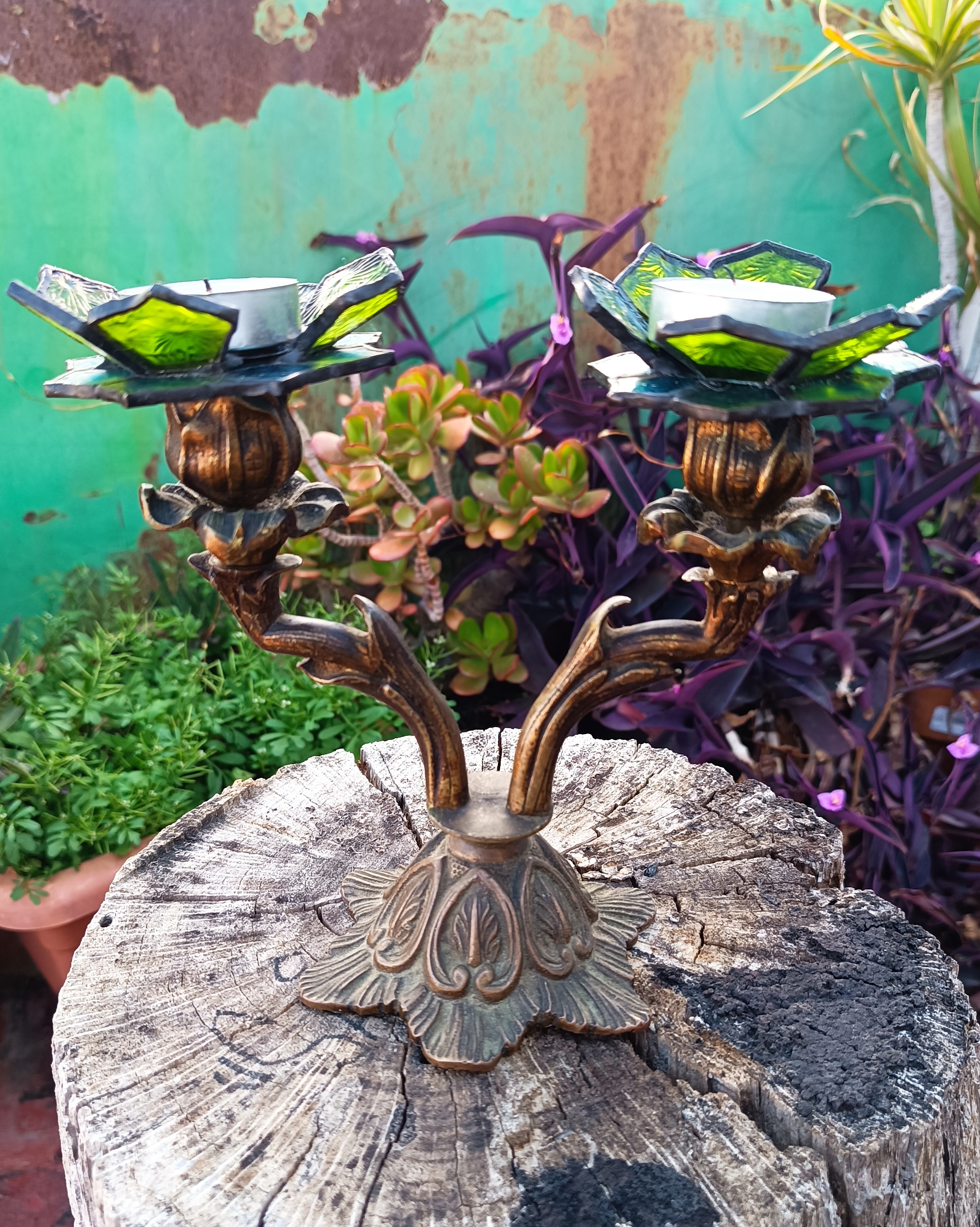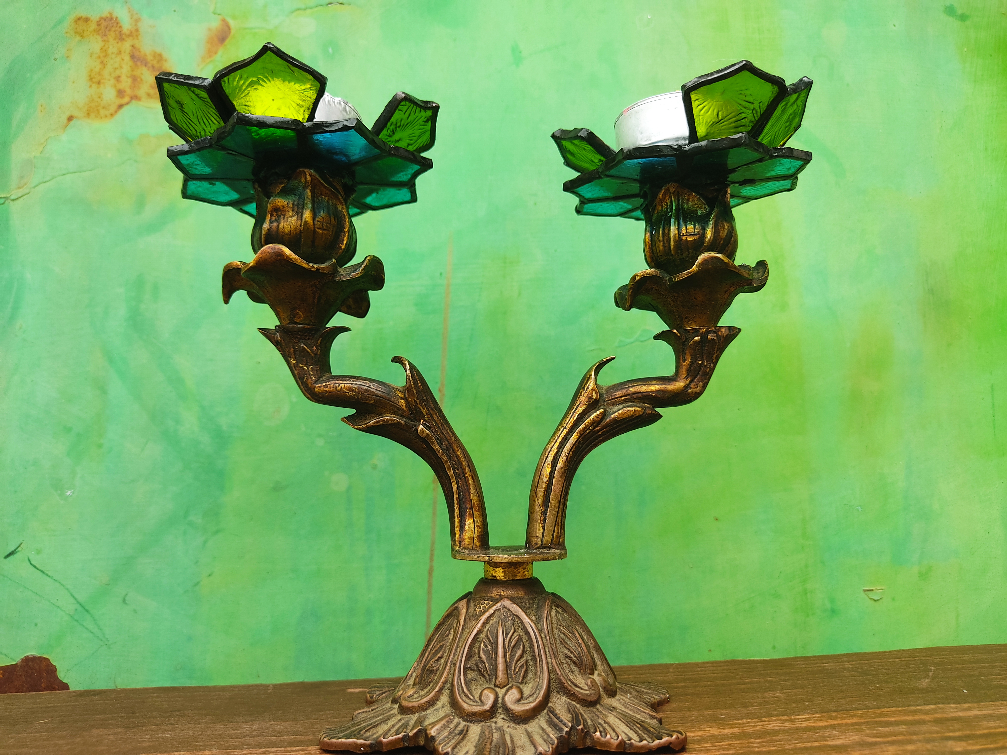 Transformamos dos candelabros de bronce ornamentados en portavelas, creando soportes de vitral en forma de flores.