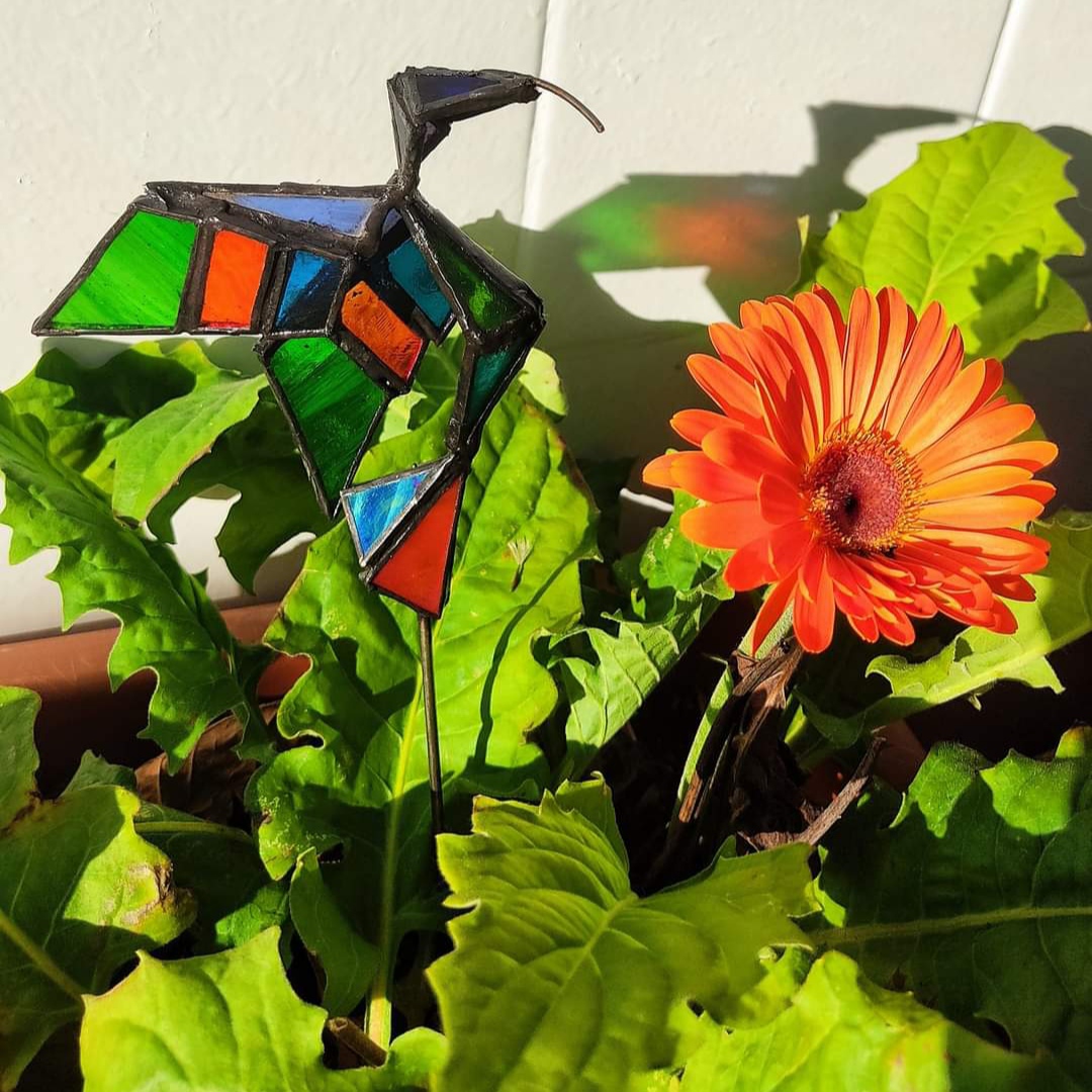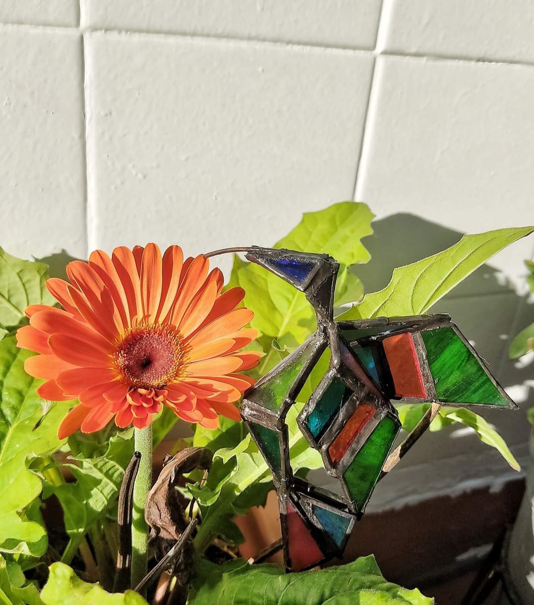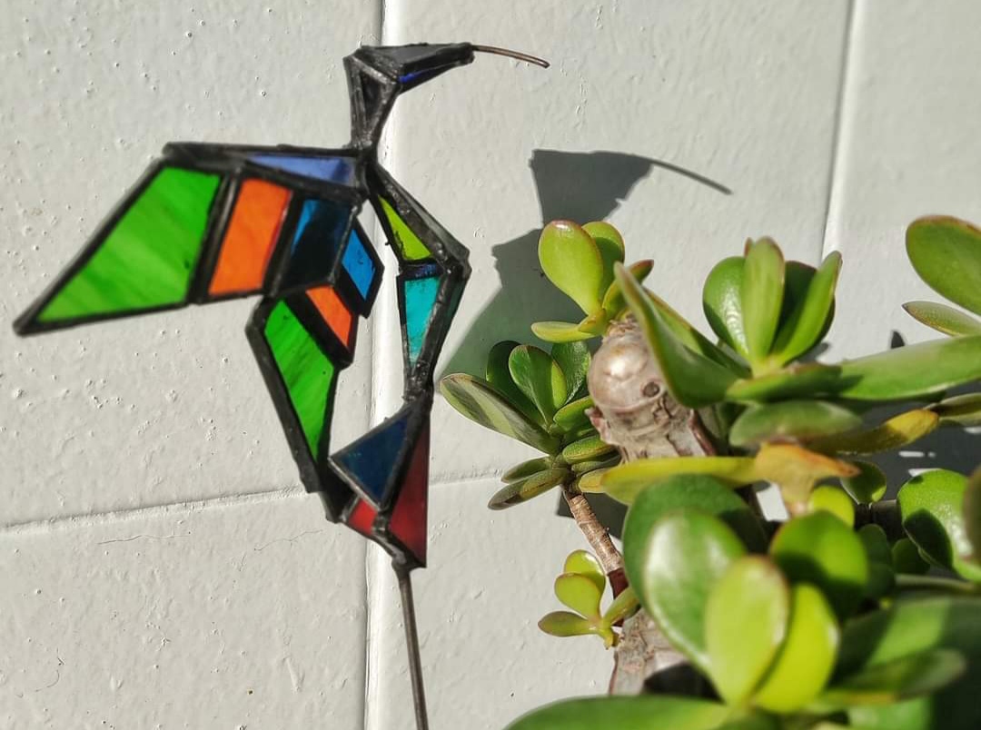 El colibrí está realizado ensamblando las piezas de vidrios de colores, mediante la técnica Tiffany, conocida por su uso en vitrales.