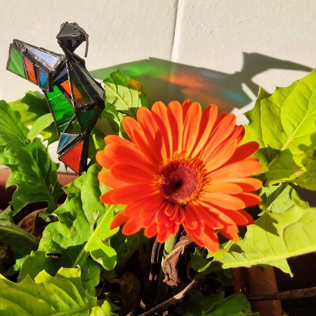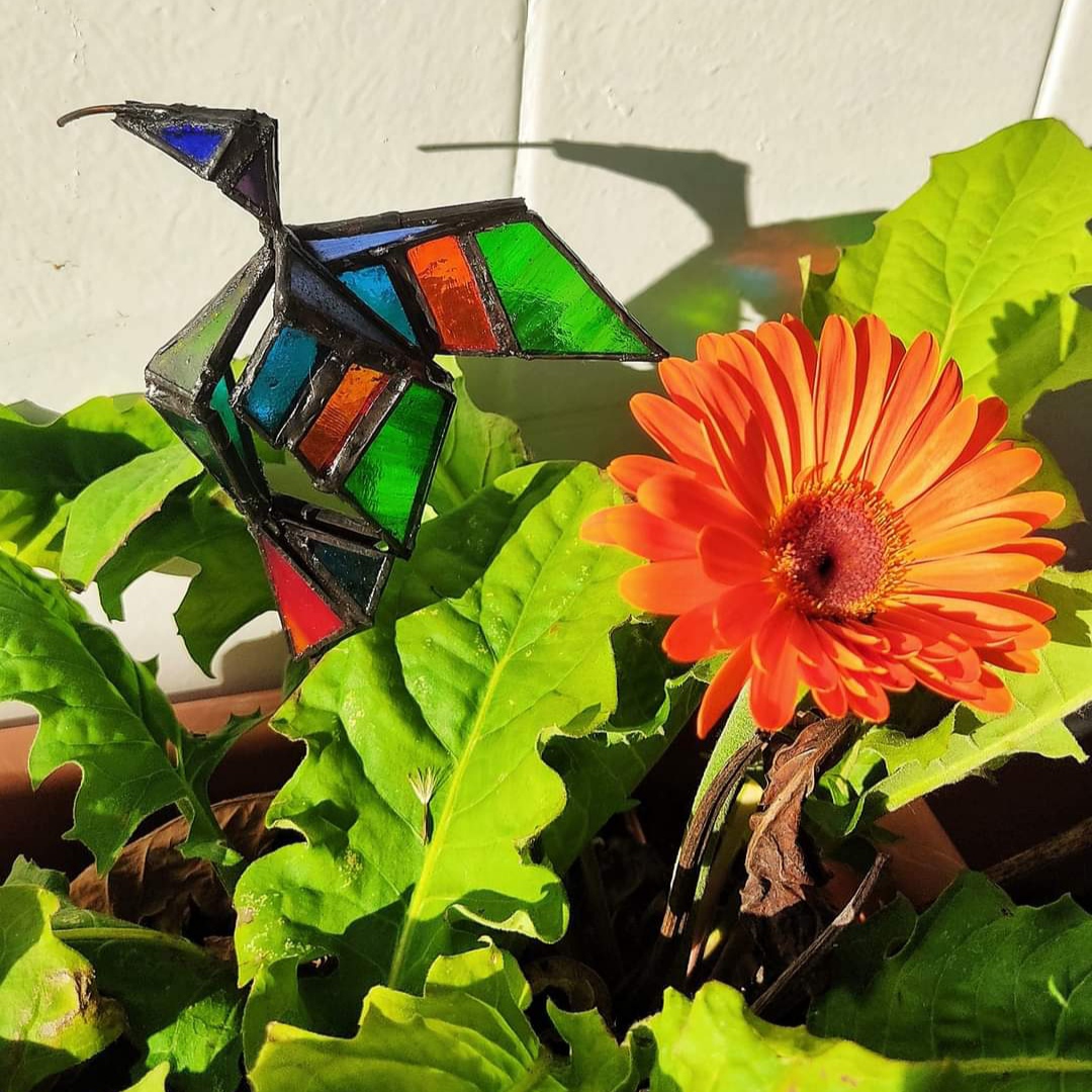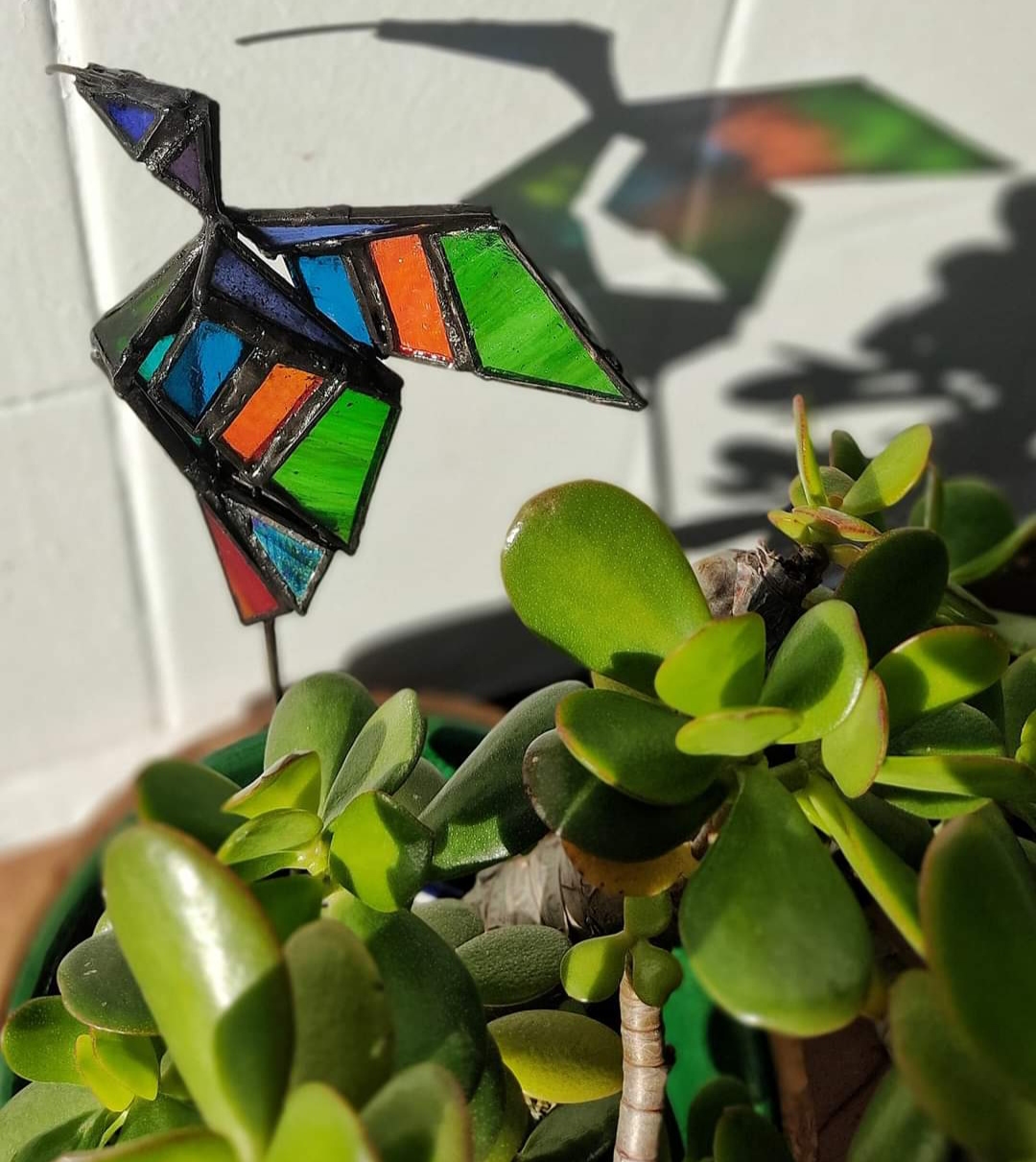 El colibrí está realizado ensamblando las piezas de vidrios de colores, mediante la técnica Tiffany, conocida por su uso en vitrales.