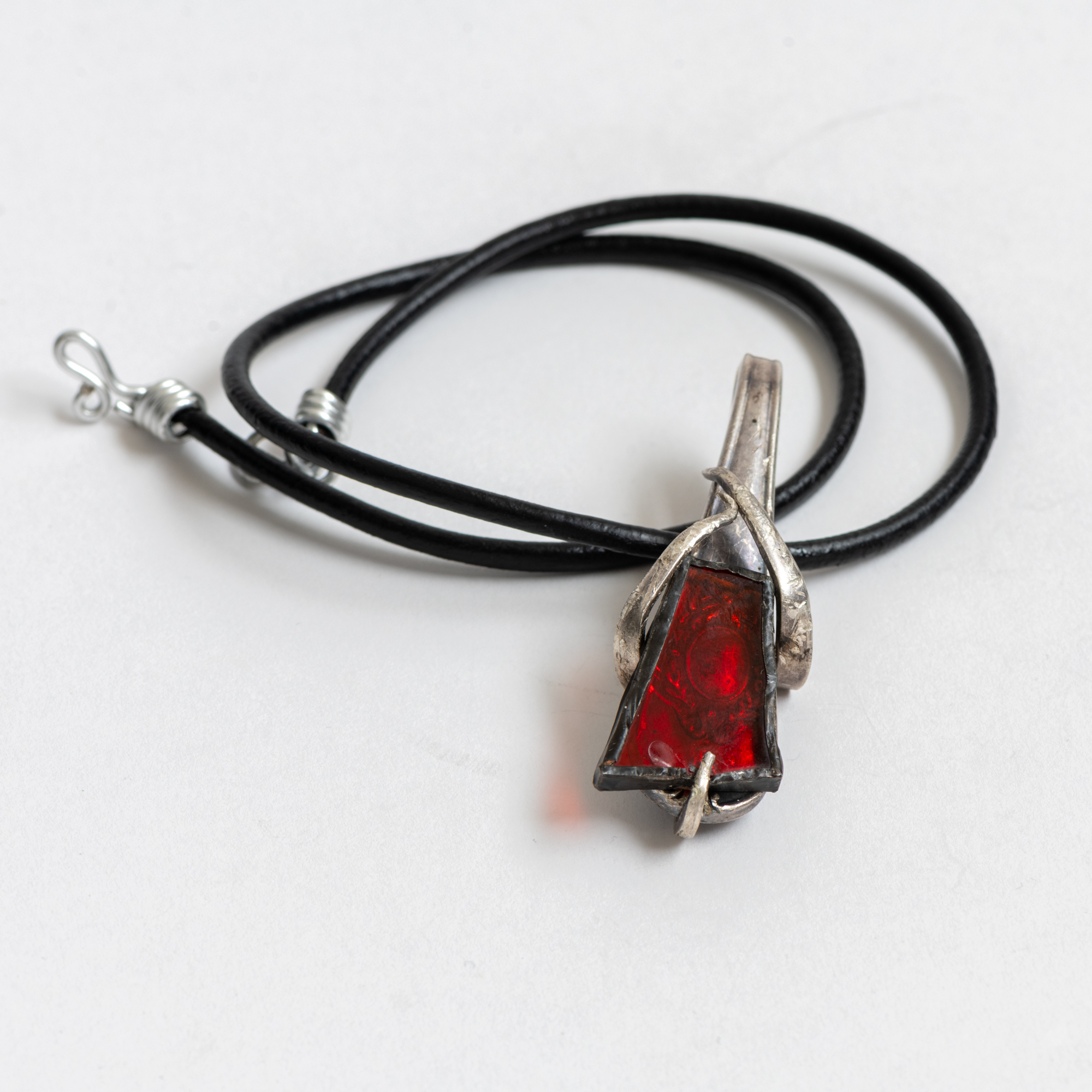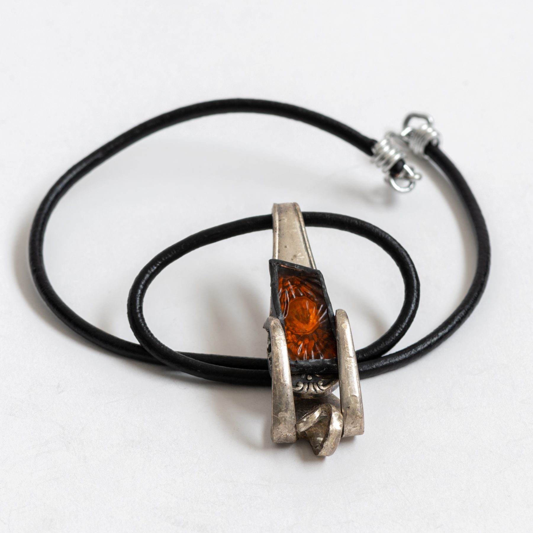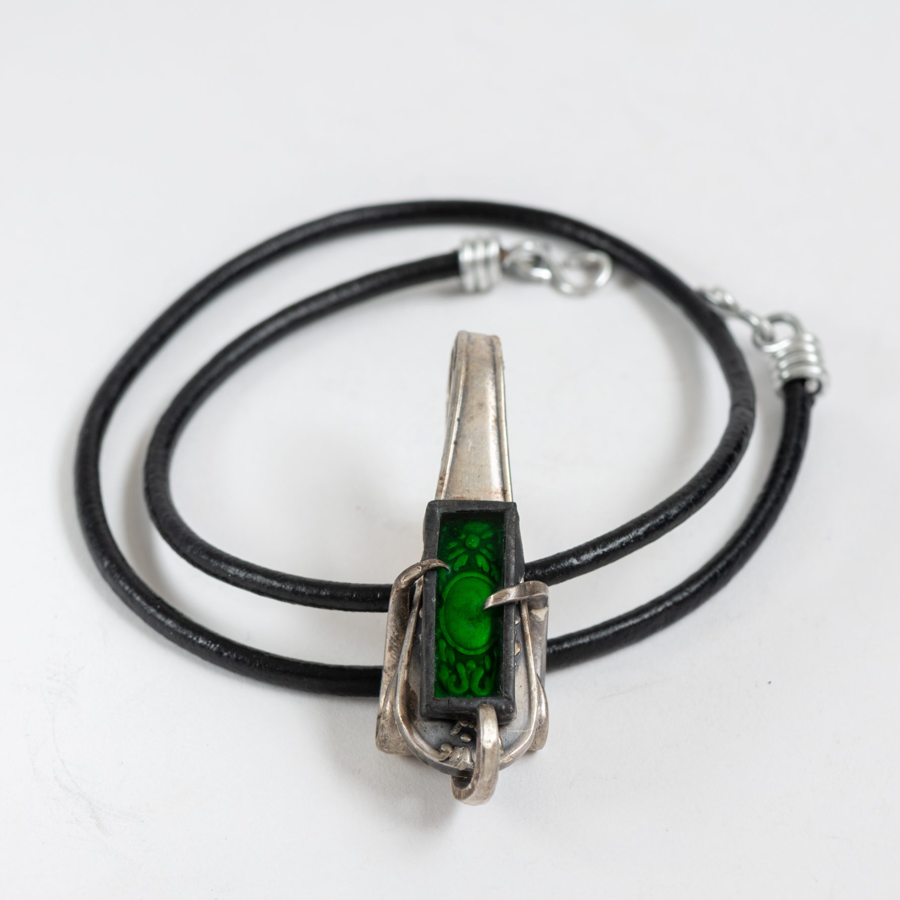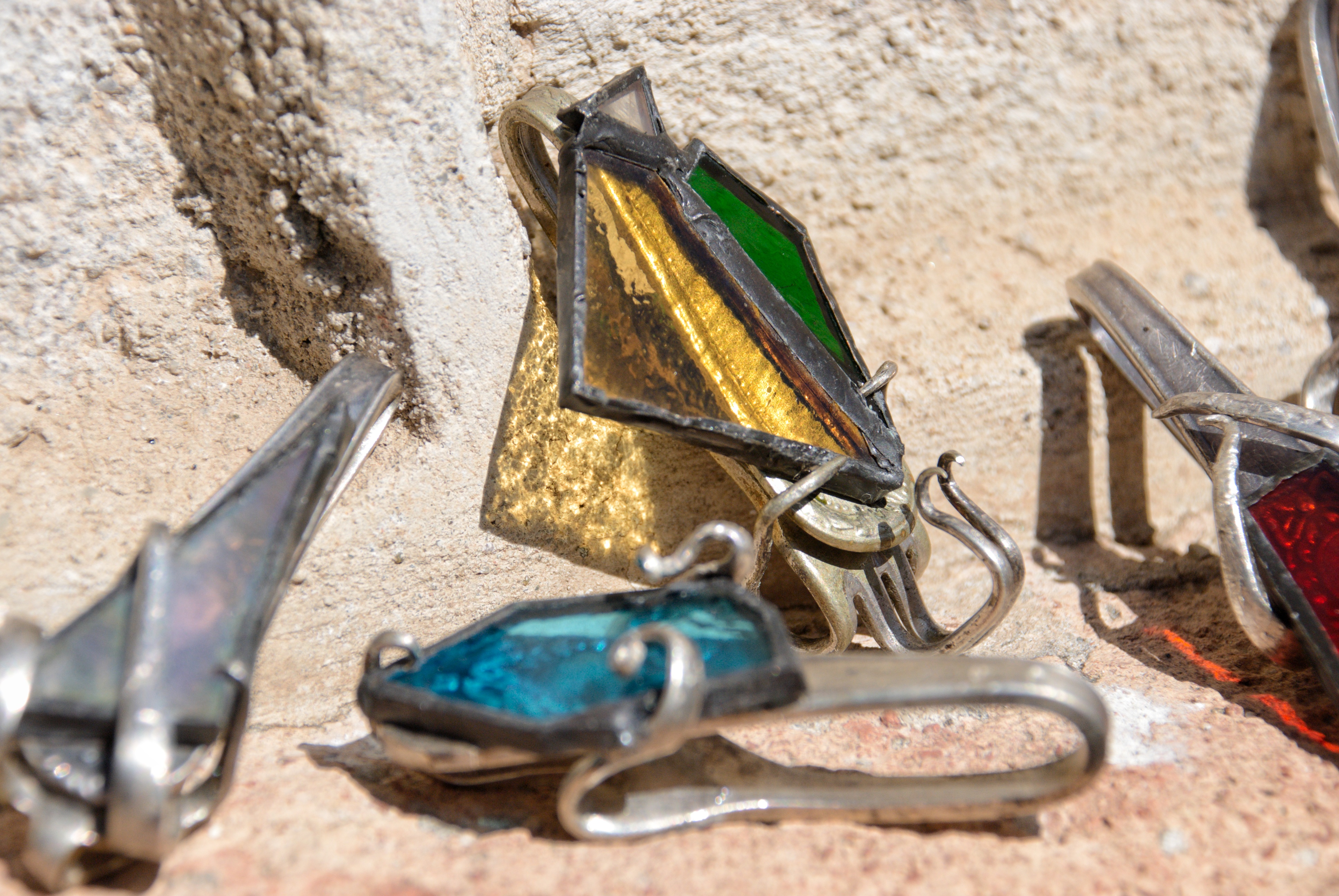 Con el objetivo de reutilizar tenedores antiguos, nacen estas joyas de inspiración modernista, hechas retorciendo y reelaborando la forma clásica del tenedor y engarzando en ella vidrios con diferentes colores y texturas.