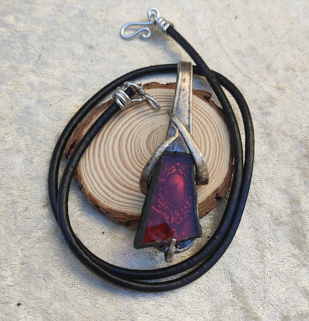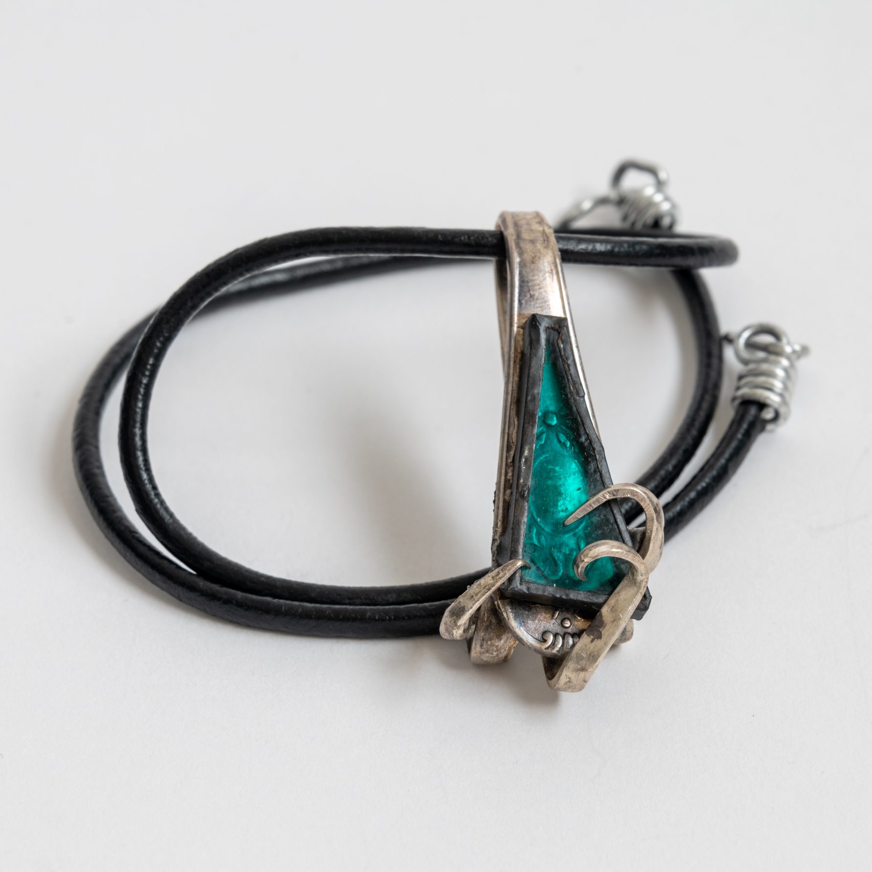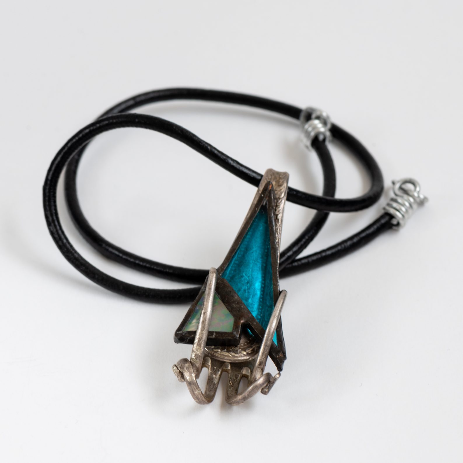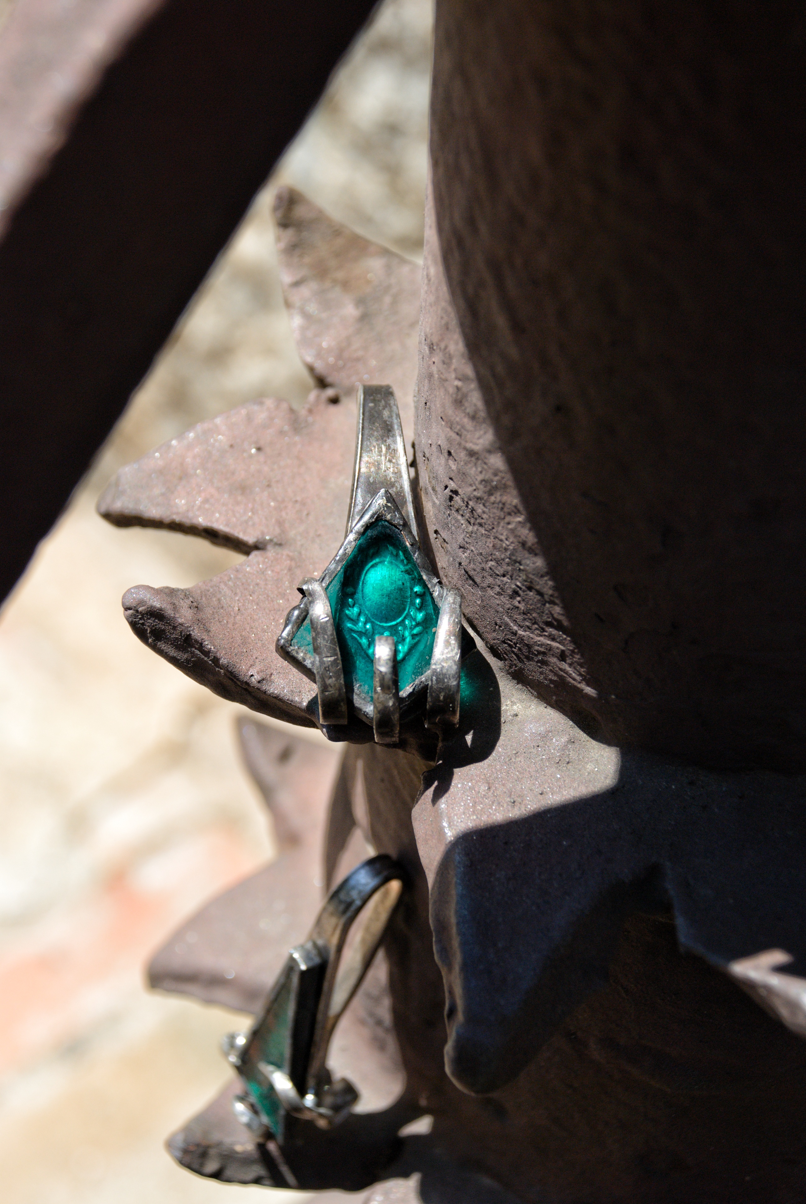 Con el objetivo de reutilizar tenedores antiguos, nacen estas joyas de inspiración modernista, hechas retorciendo y reelaborando la forma clásica del tenedor y engarzando en ella vidrios con diferentes colores y texturas.
