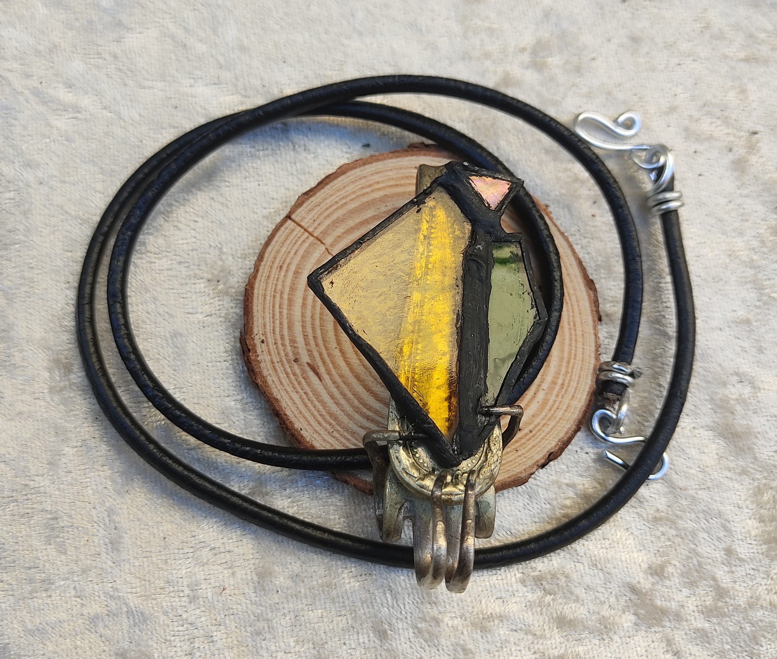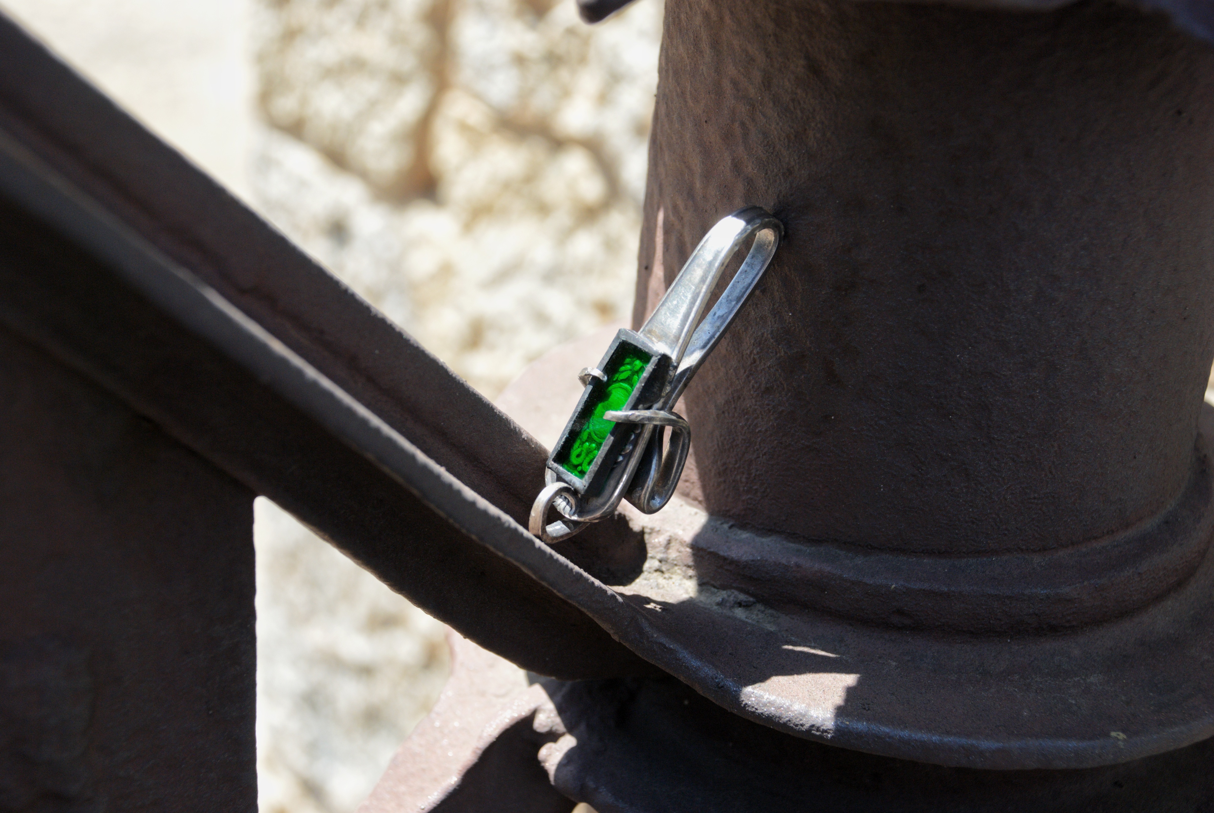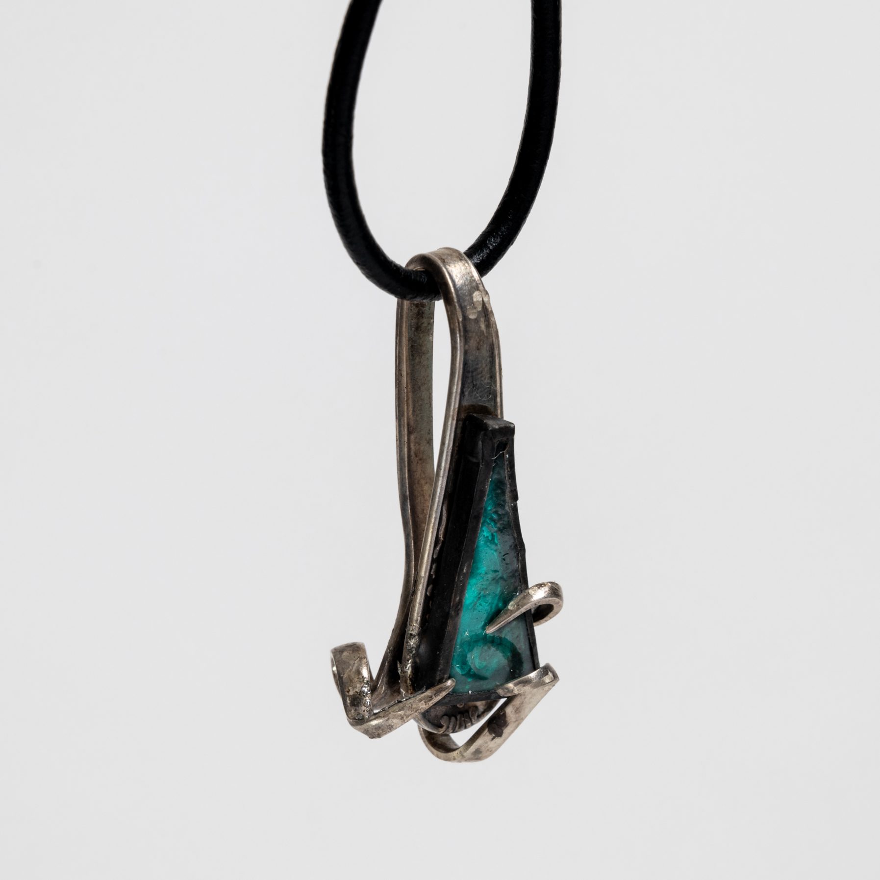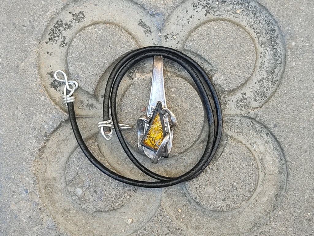 Con el objetivo de reutilizar tenedores antiguos, nacen estas joyas de inspiración modernista, hechas retorciendo y reelaborando la forma clásica del tenedor y engarzando en ella vidrios con diferentes colores y texturas.