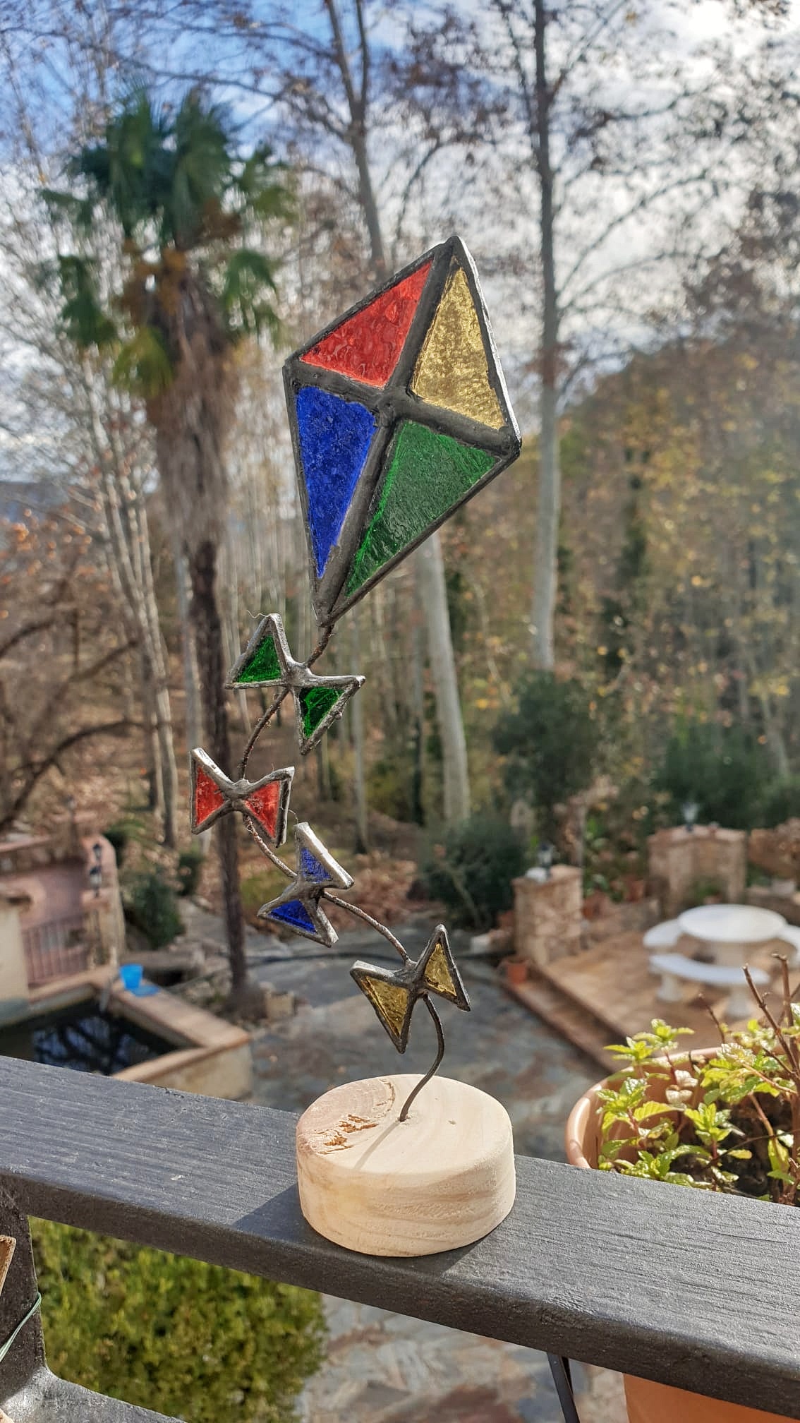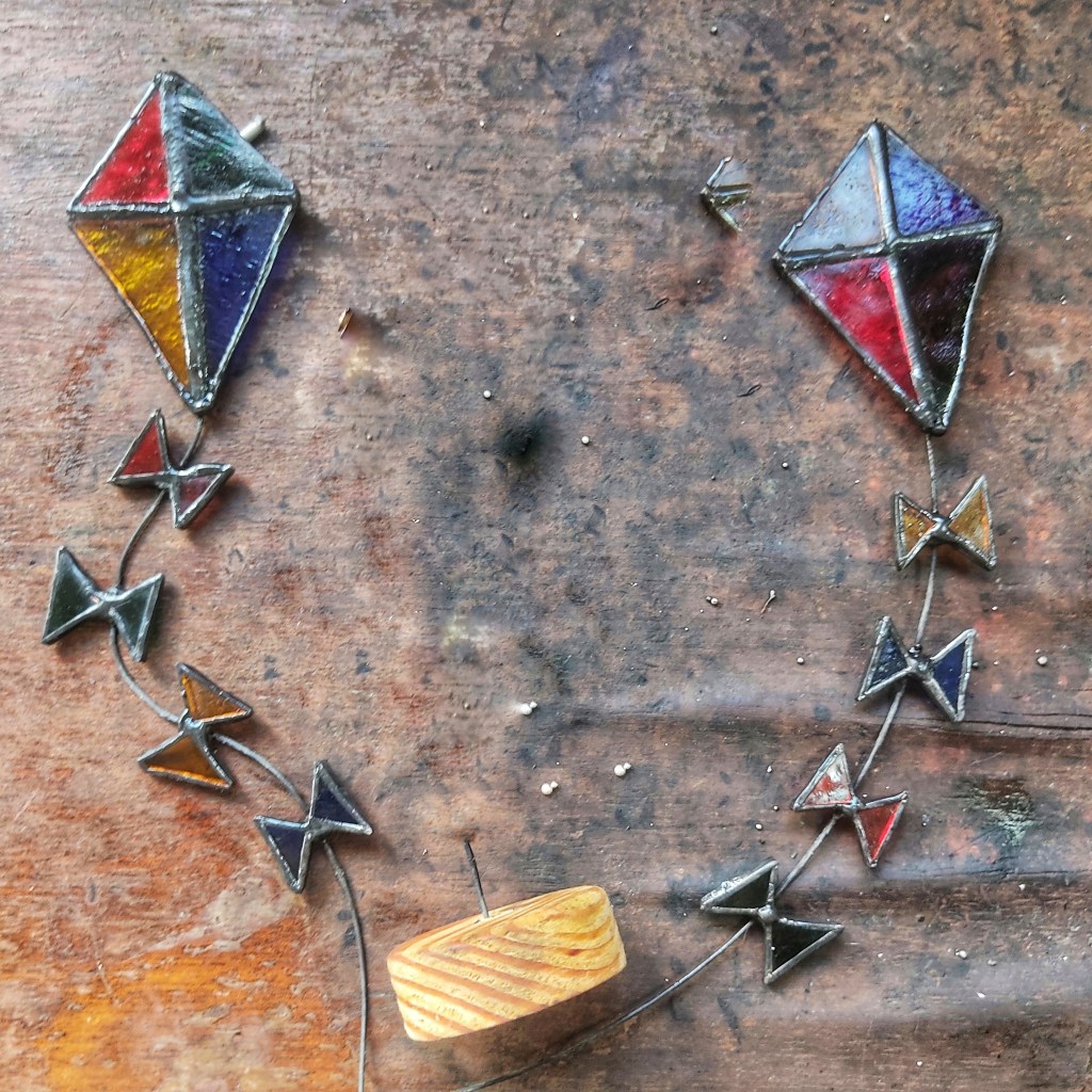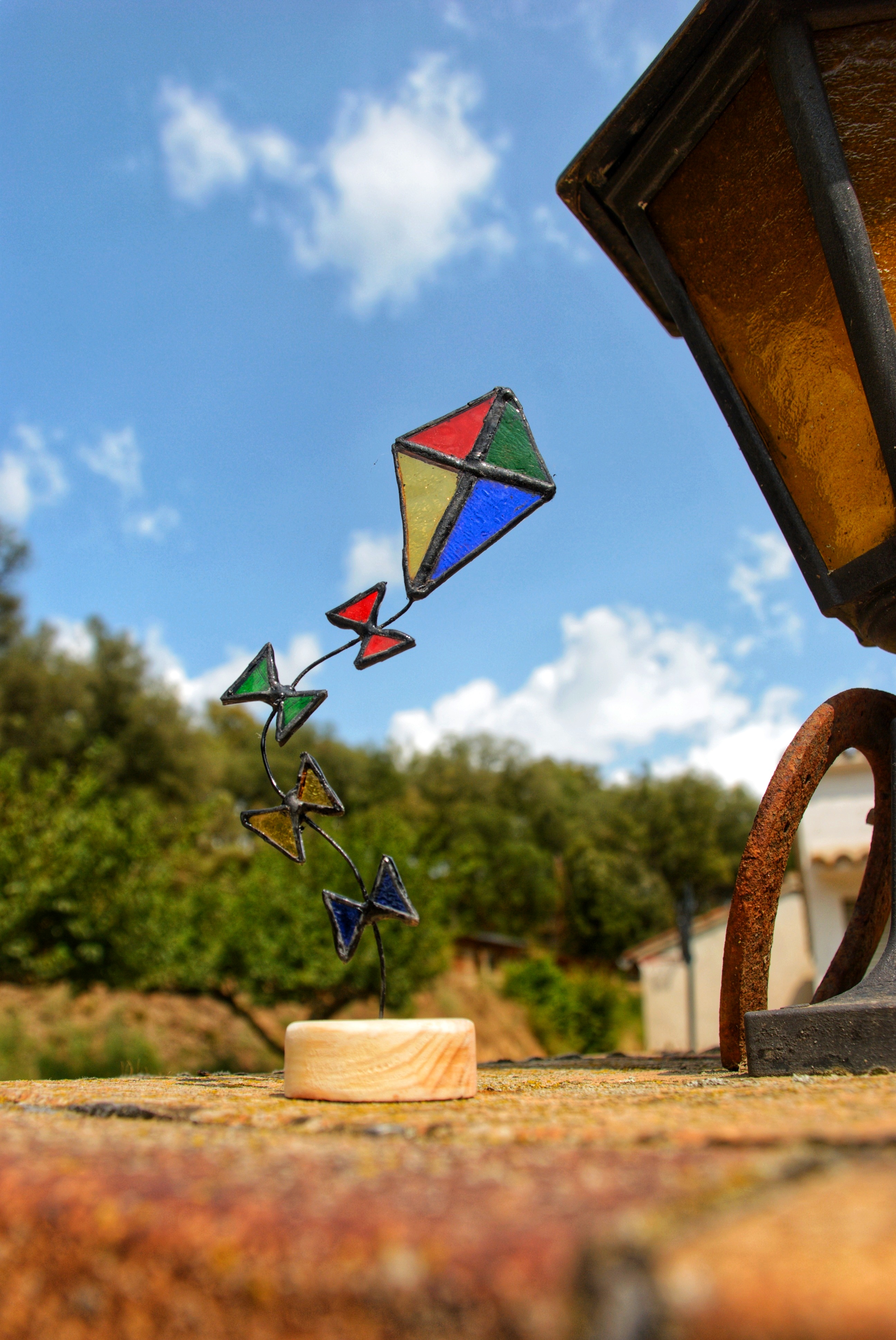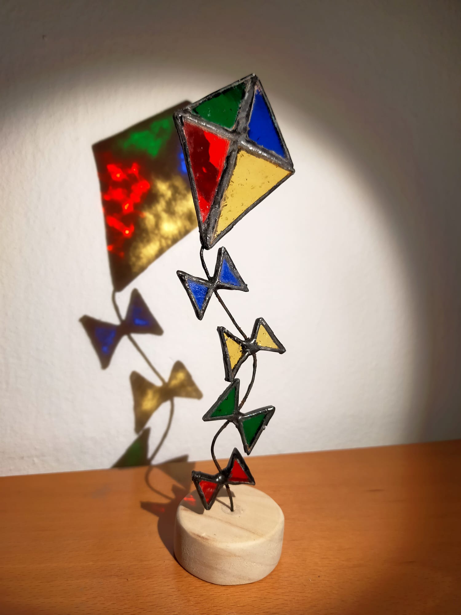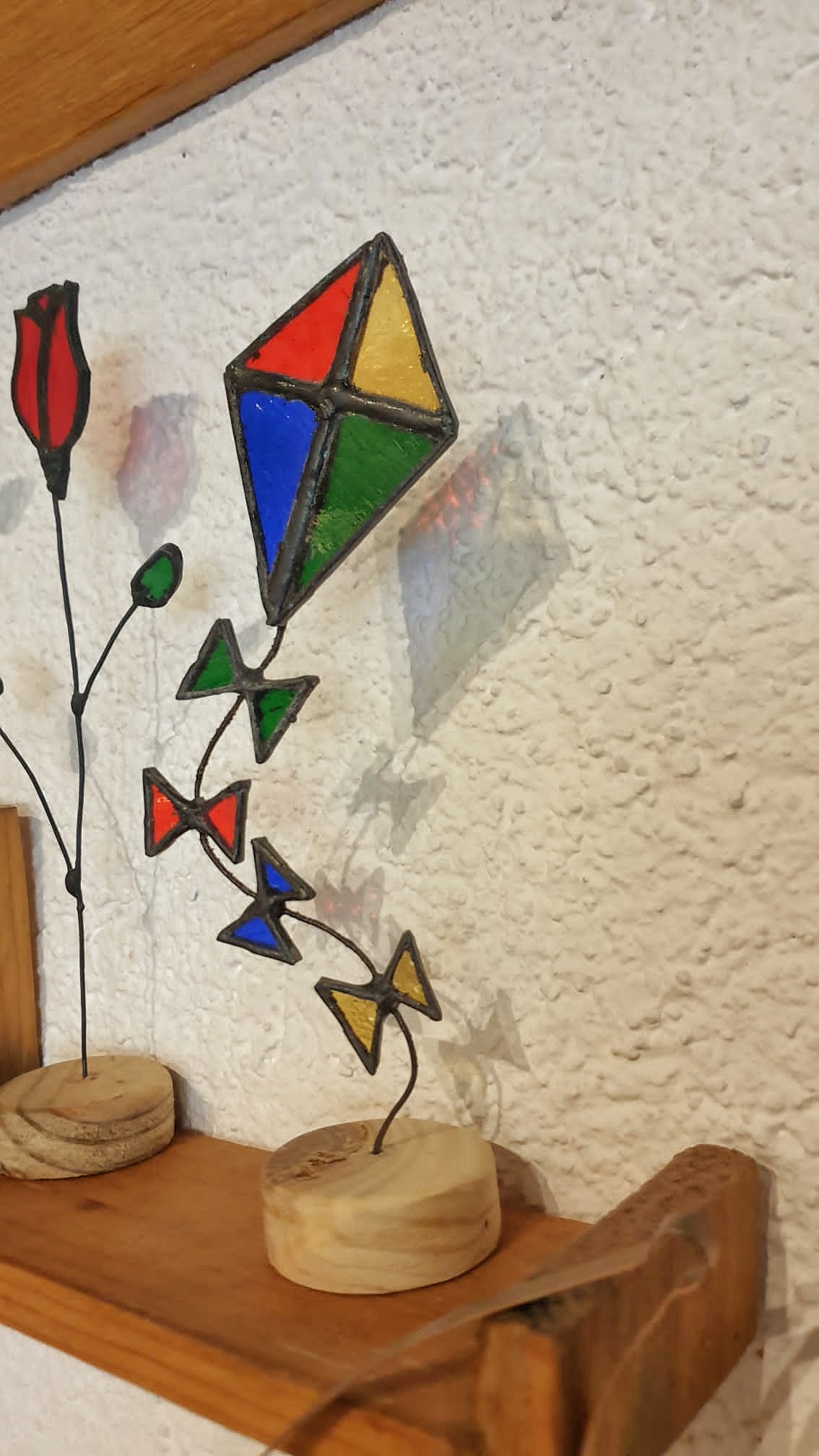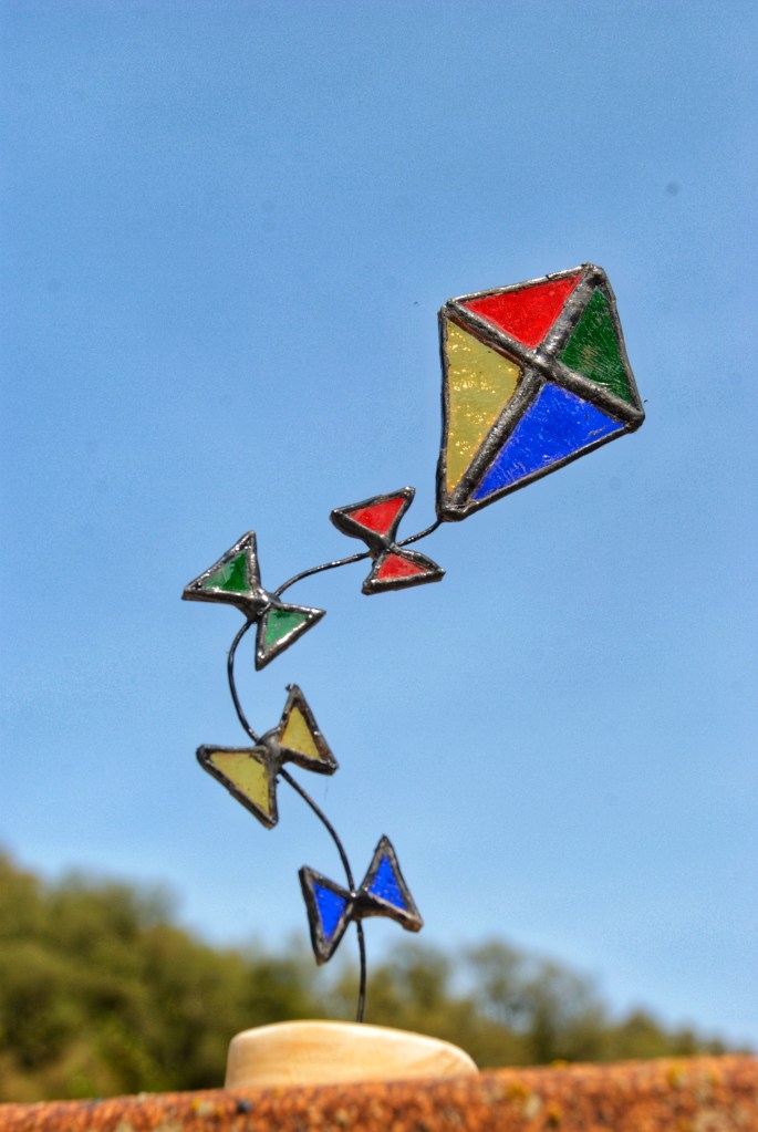 Estas cometas atrapaluces de vidrieras, reposan sobre bases artesanales de madera de pino y cuentan con una cola de alambre flexible, que invita a darle la forma deseada a su vuelo.