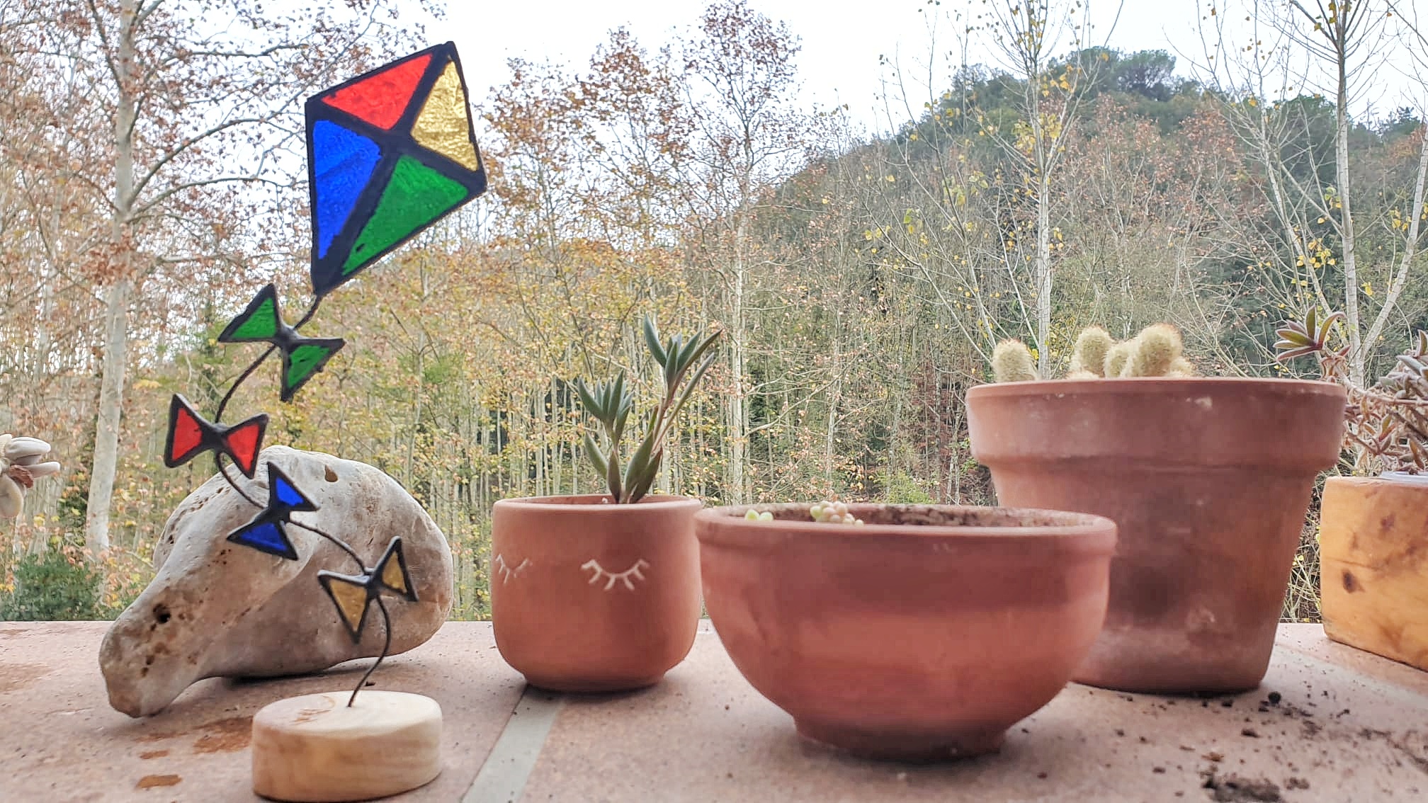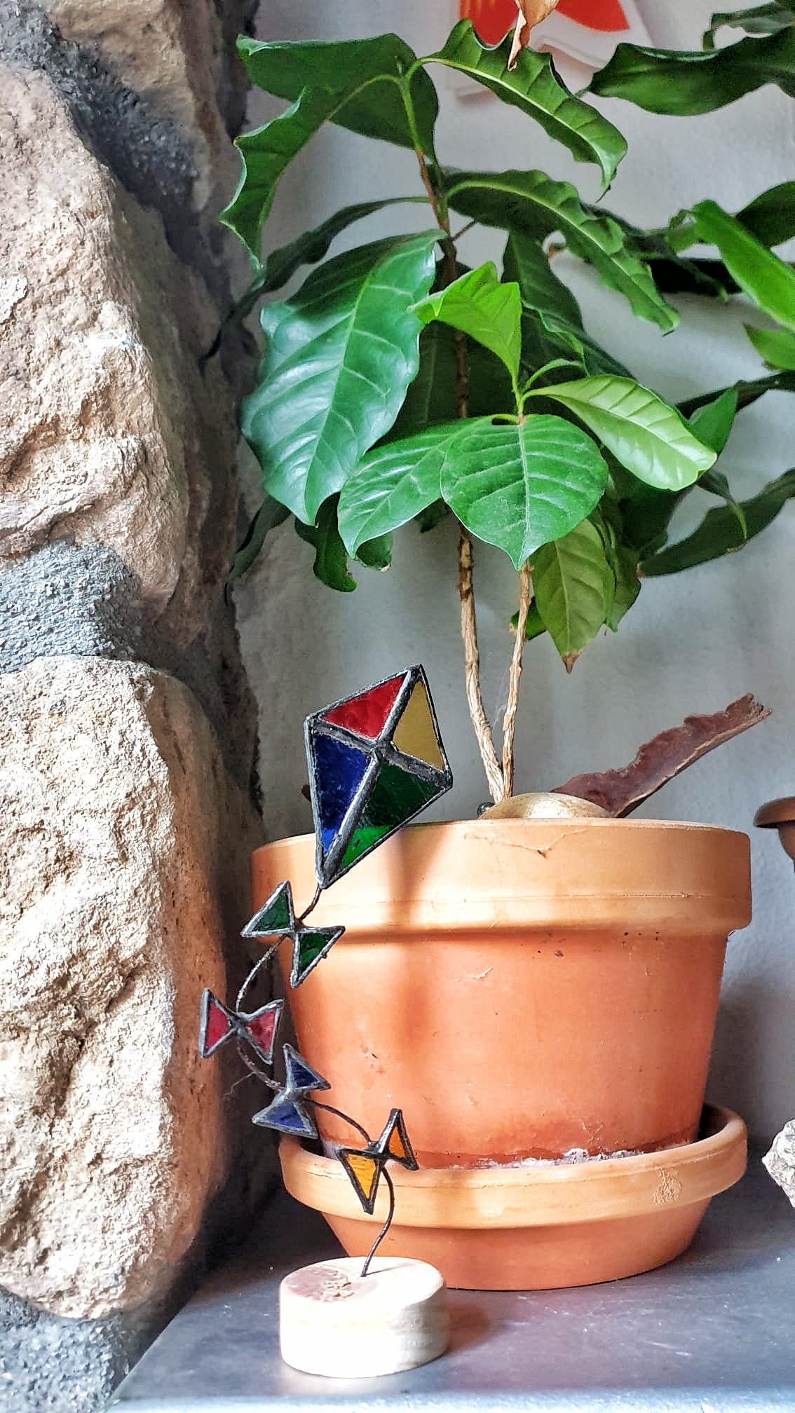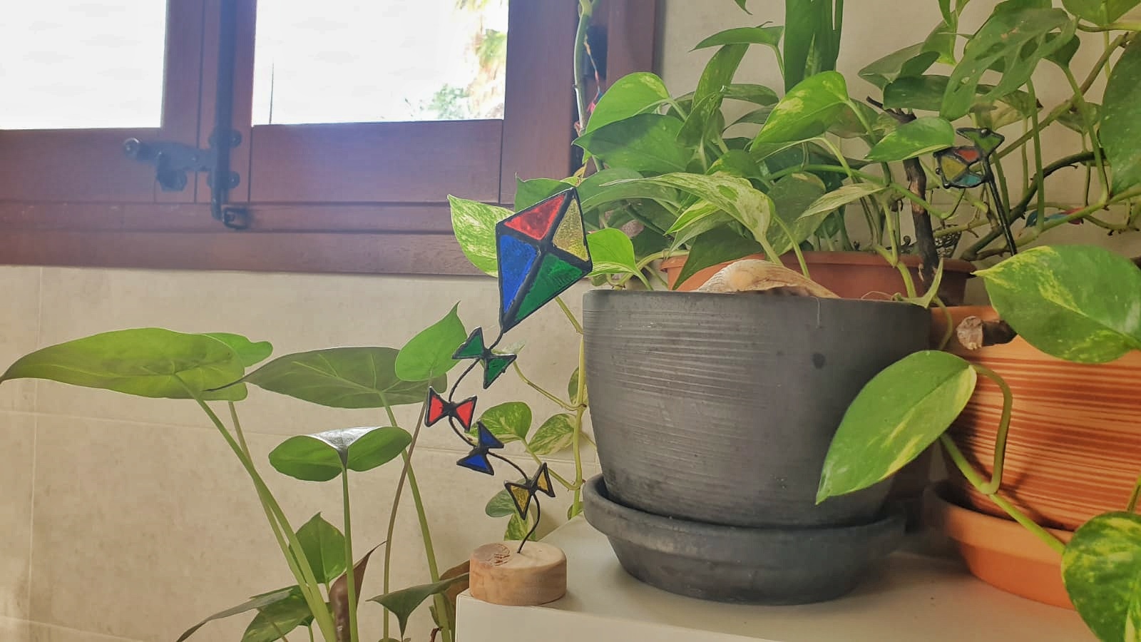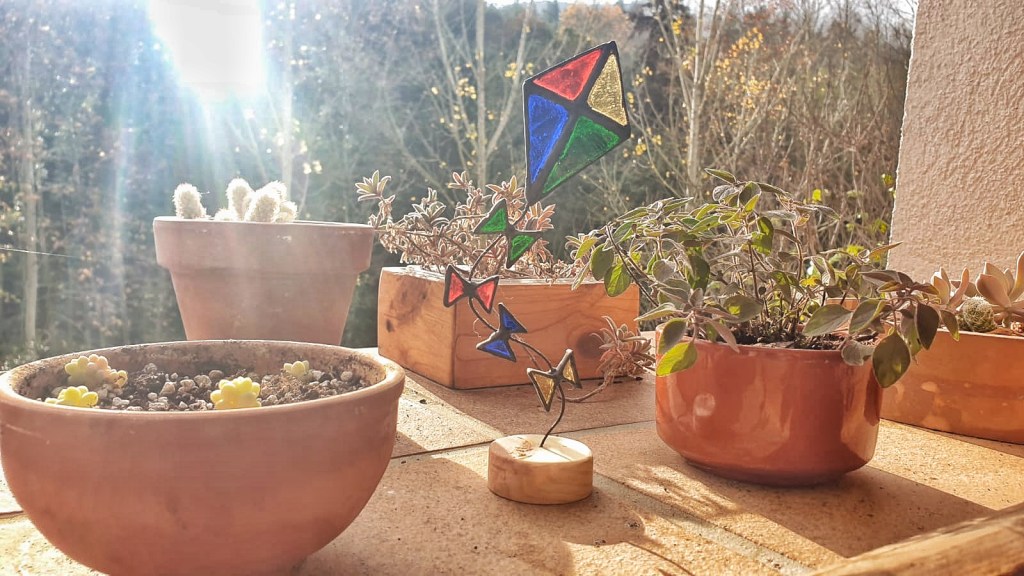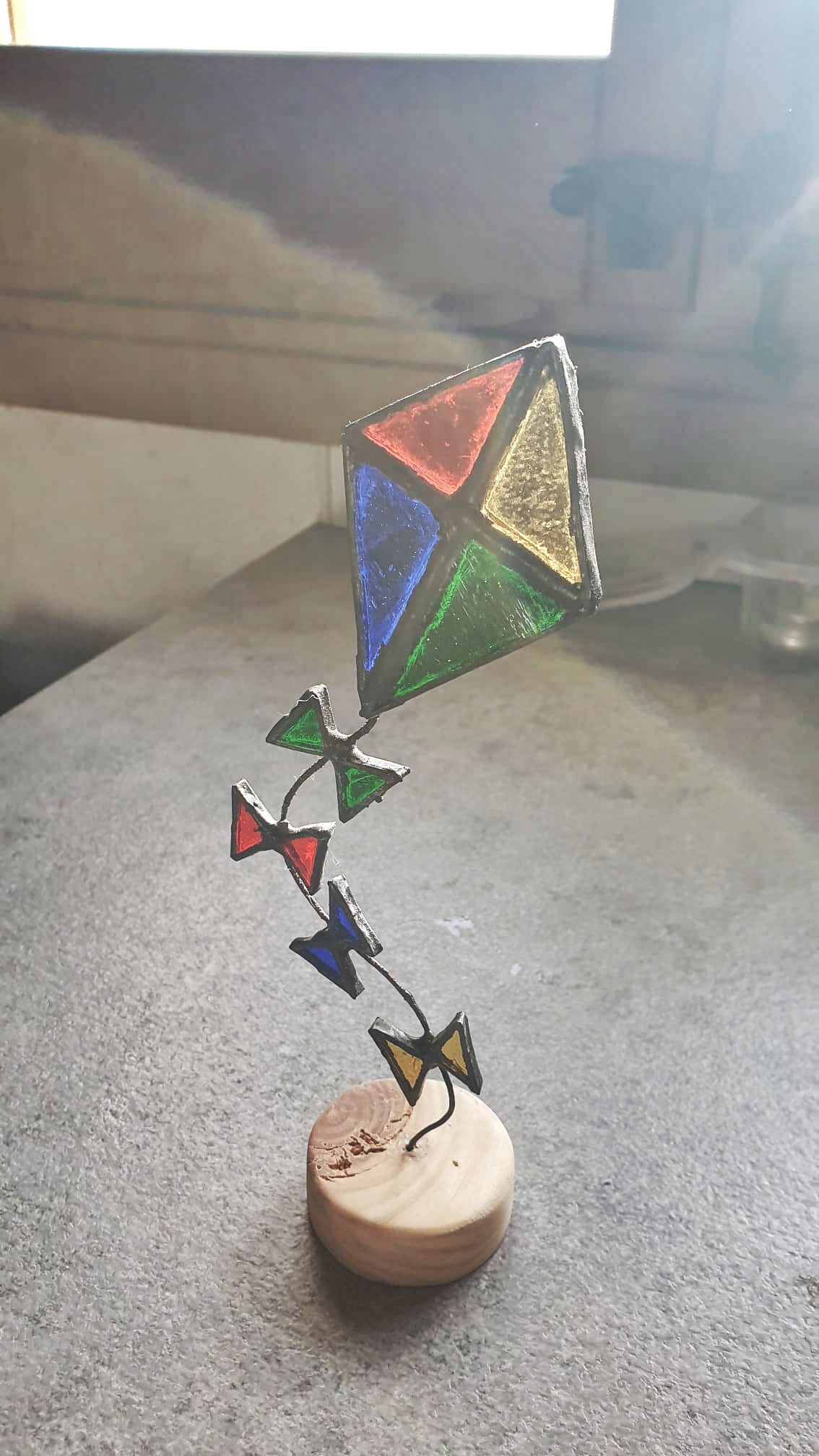 Estas cometas atrapaluces de vidrieras, reposan sobre bases artesanales de madera de pino y cuentan con una cola de alambre flexible, que invita a darle la forma deseada a su vuelo.