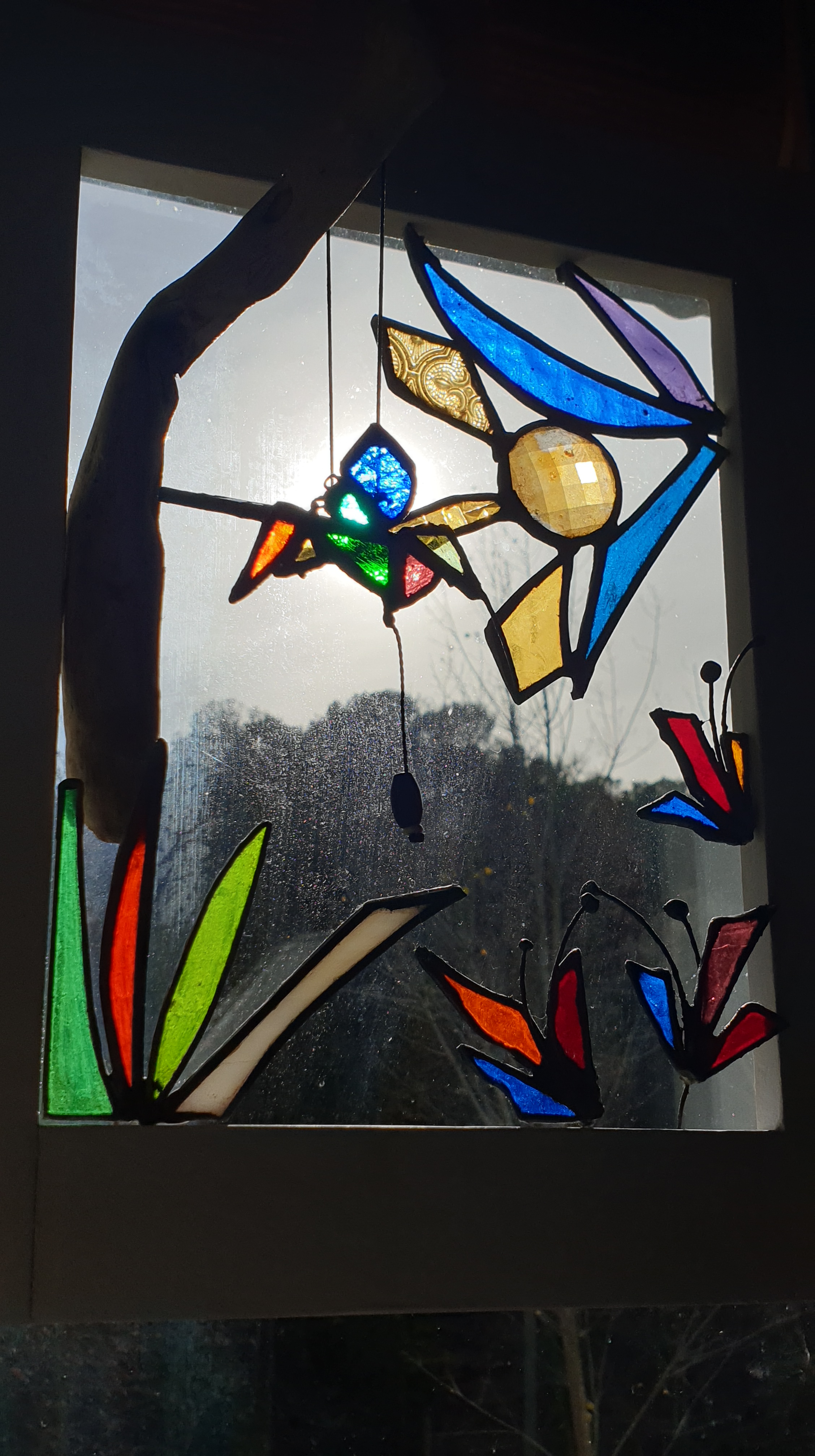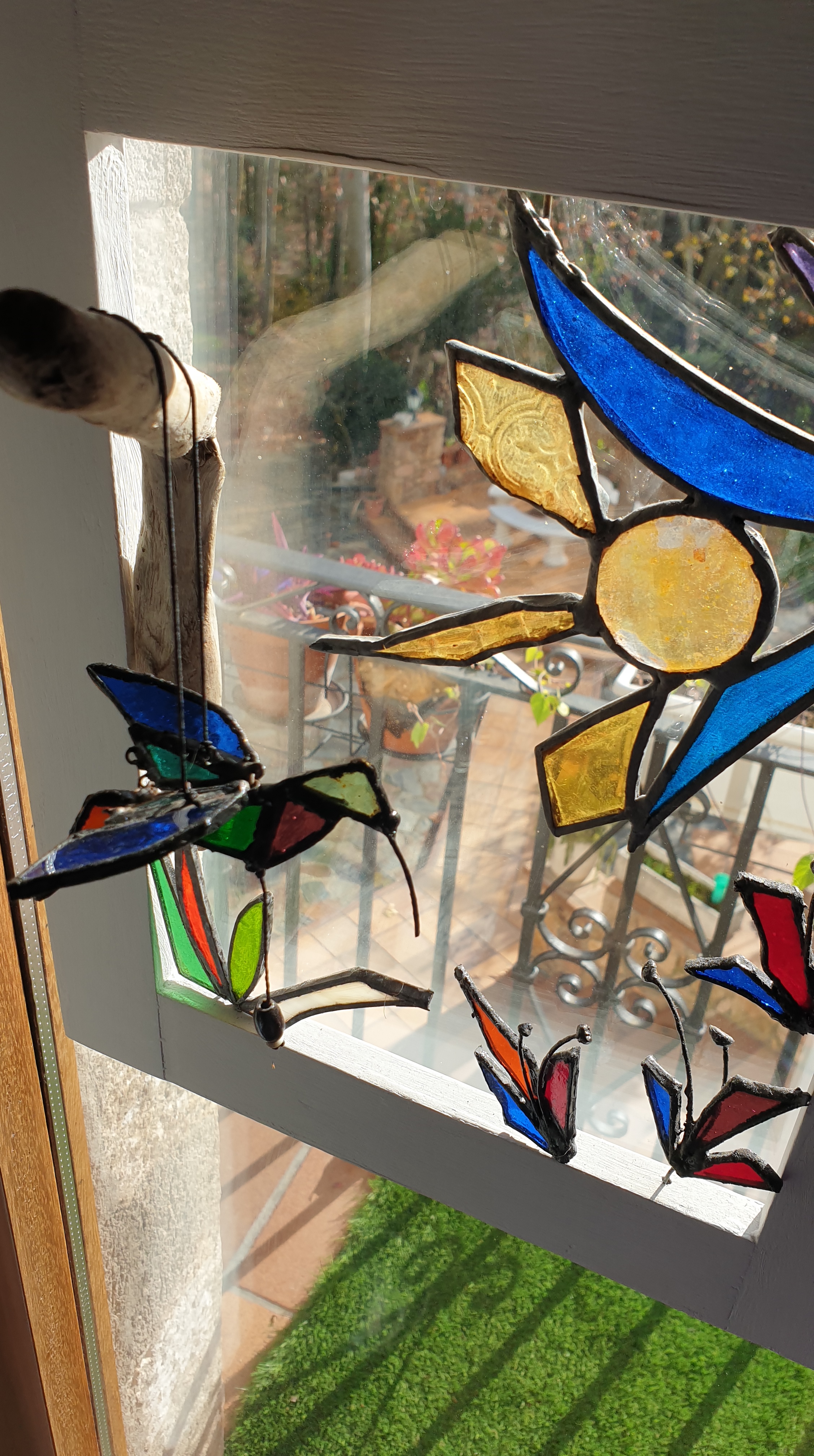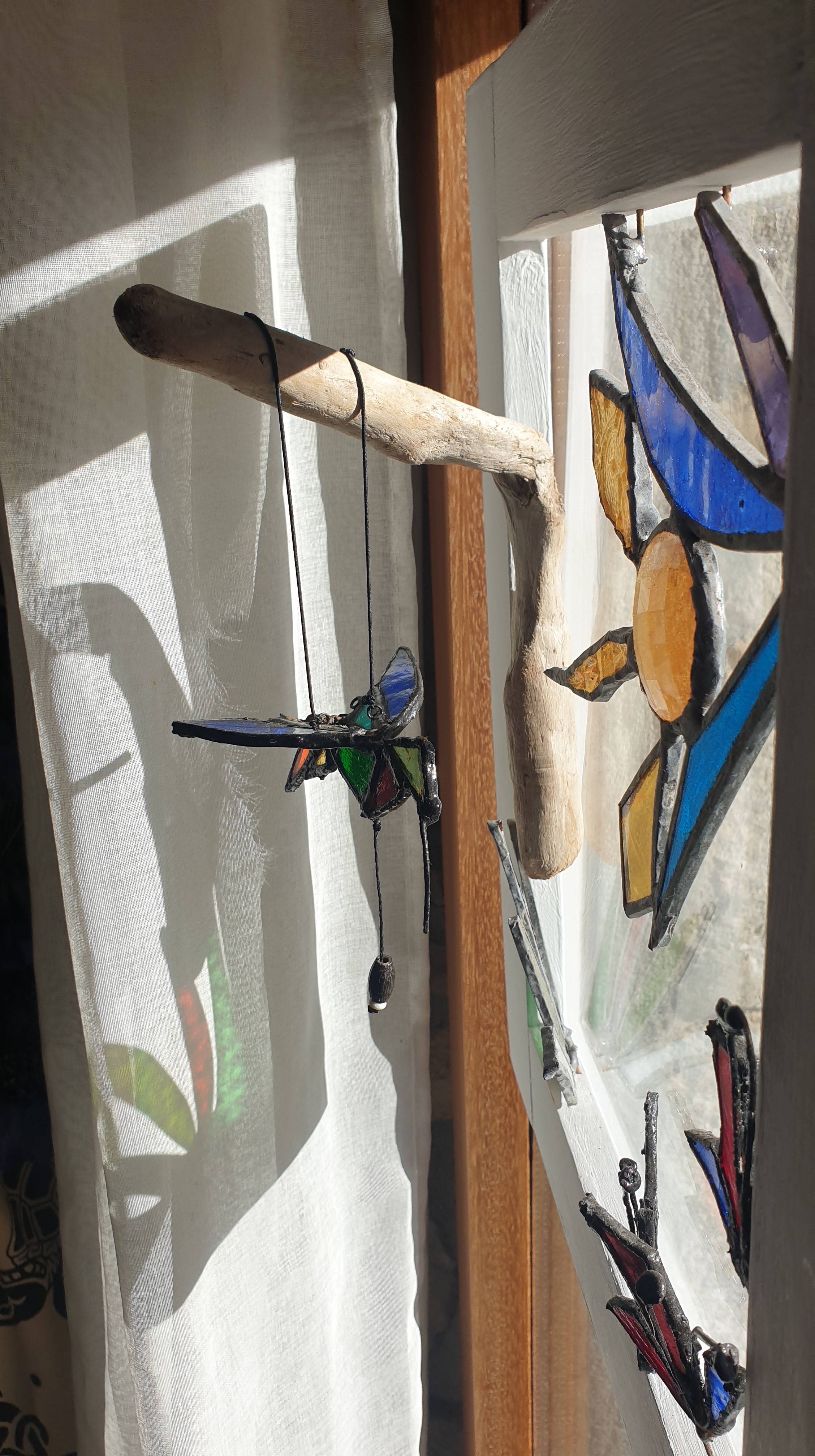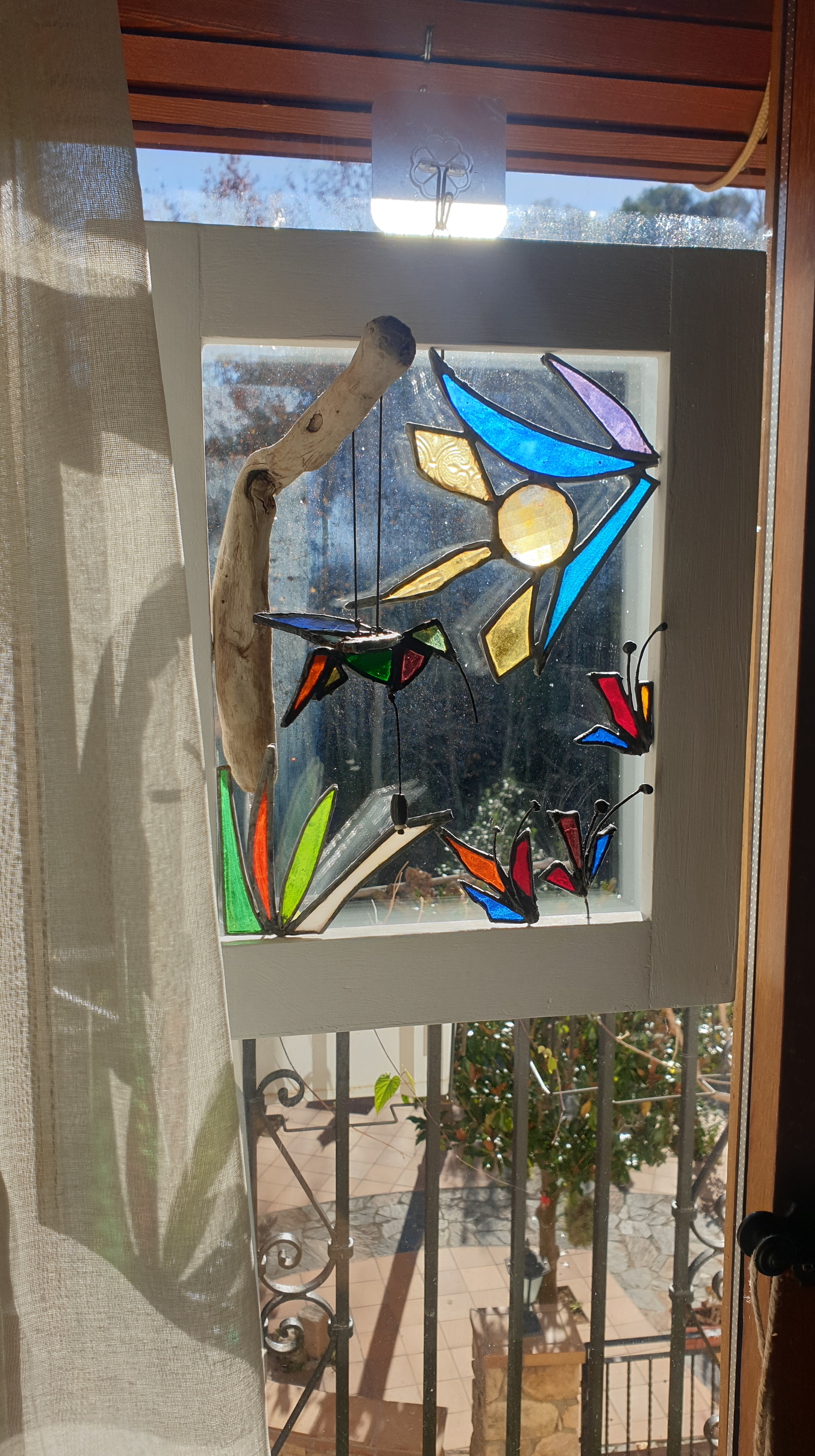 Cuadro 3D interactivo creado a 4 manos, reciclando piezas de vidrios de colores y texturas para el diseño en técnica Tiffany y acompañándolo con madera de deriva y un marco restaurado.