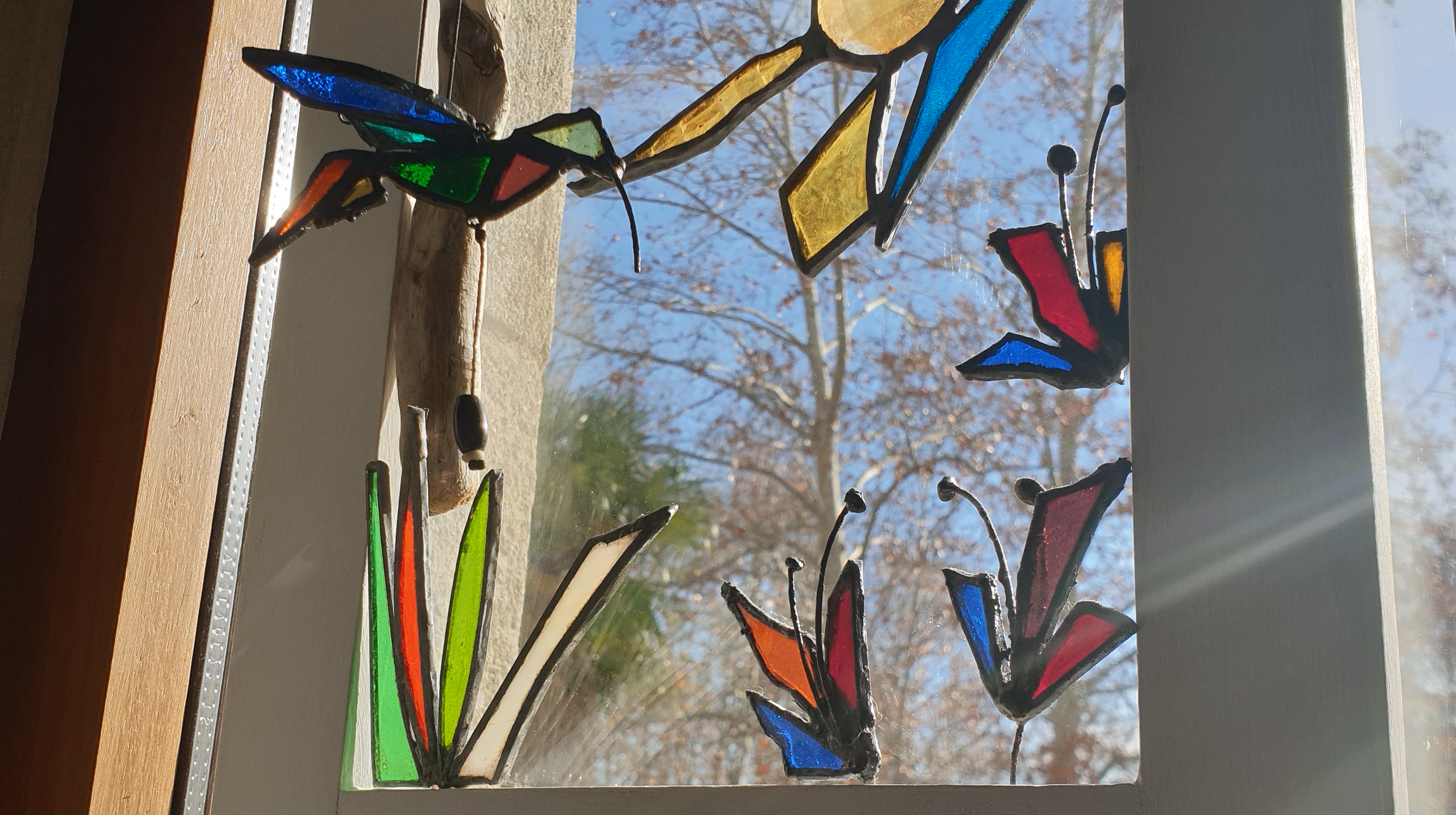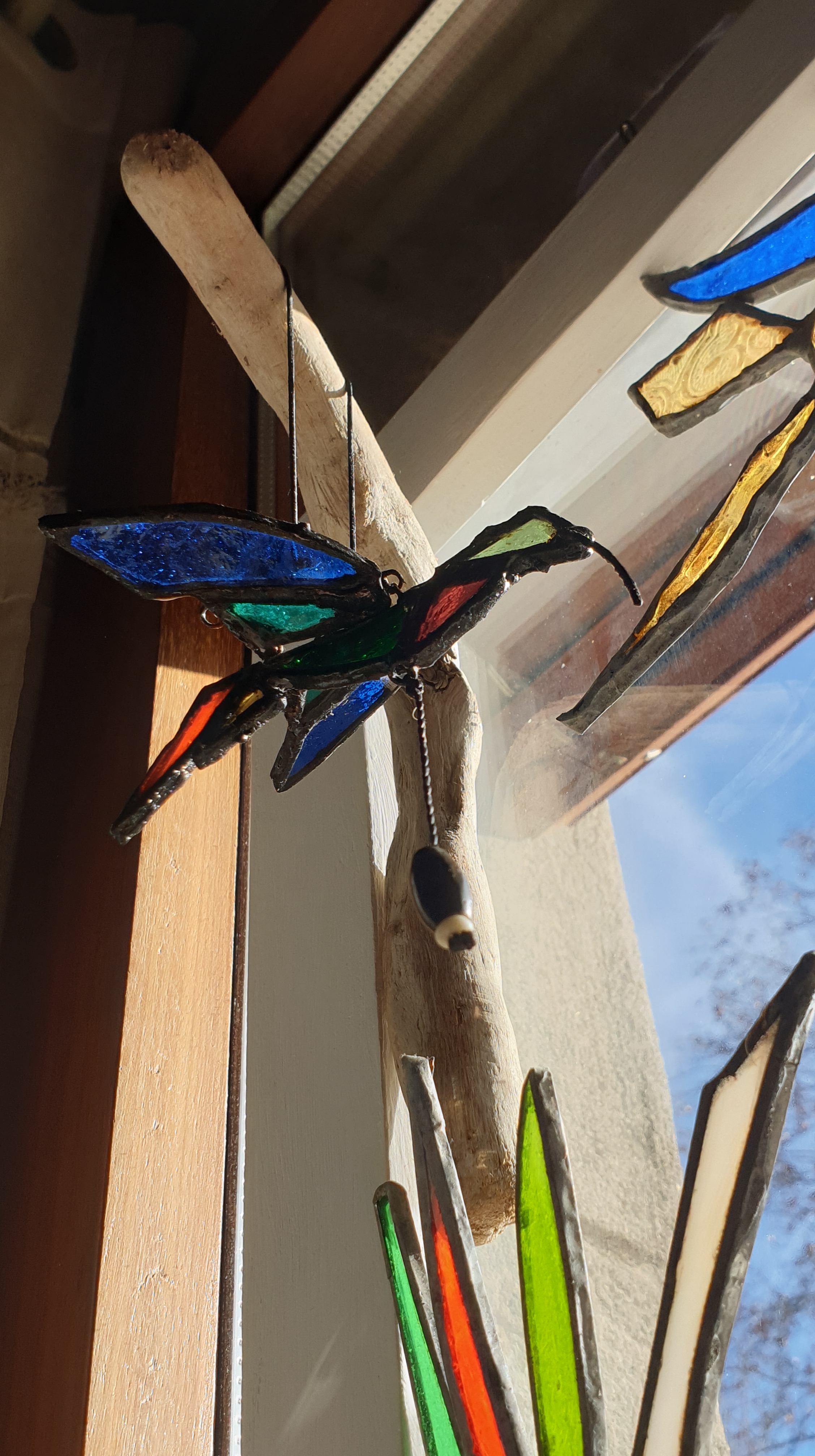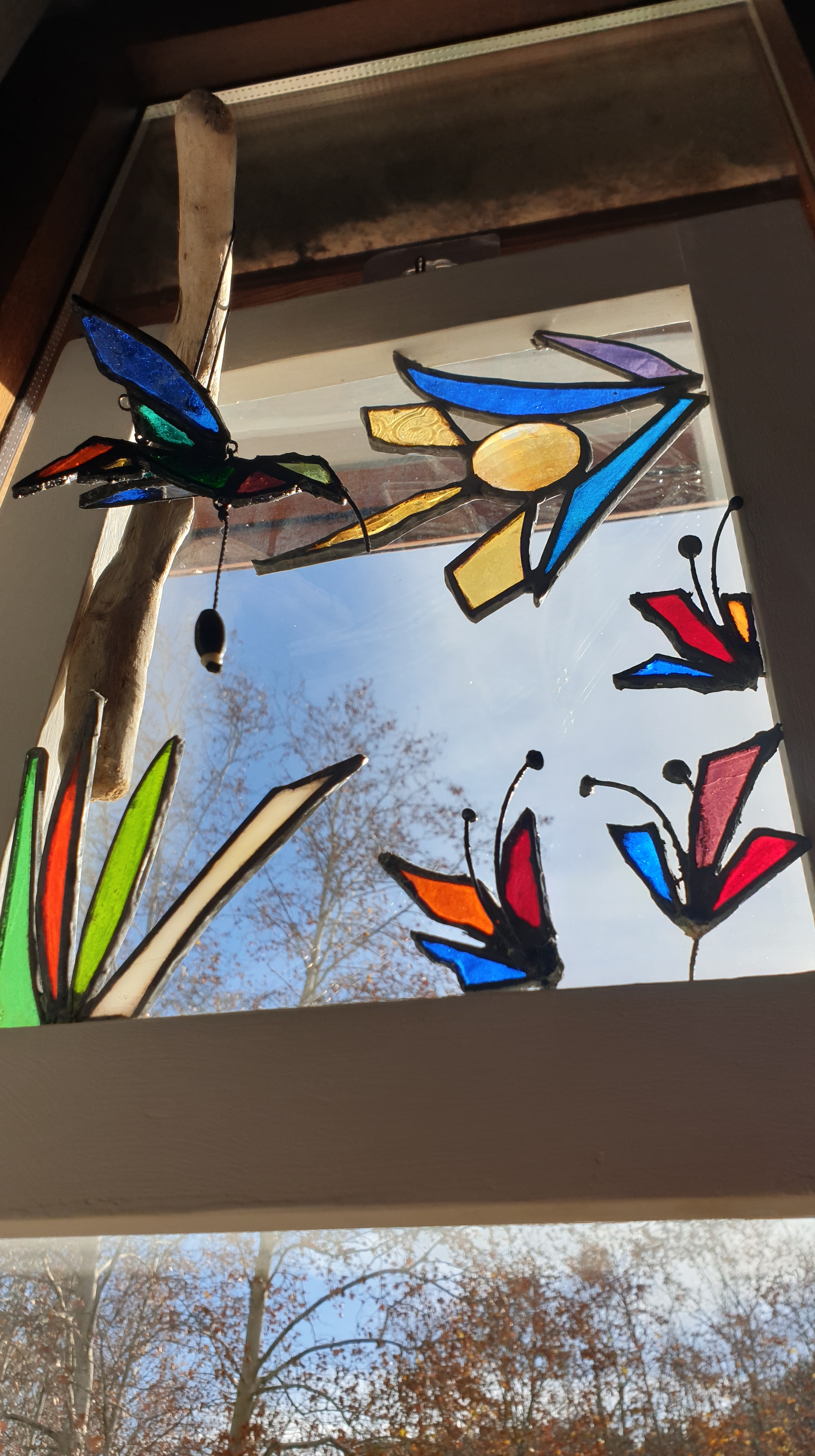 Cuadro 3D interactivo creado a 4 manos, reciclando piezas de vidrios de colores y texturas para el diseño en técnica Tiffany y acompañándolo con madera de deriva y un marco restaurado.