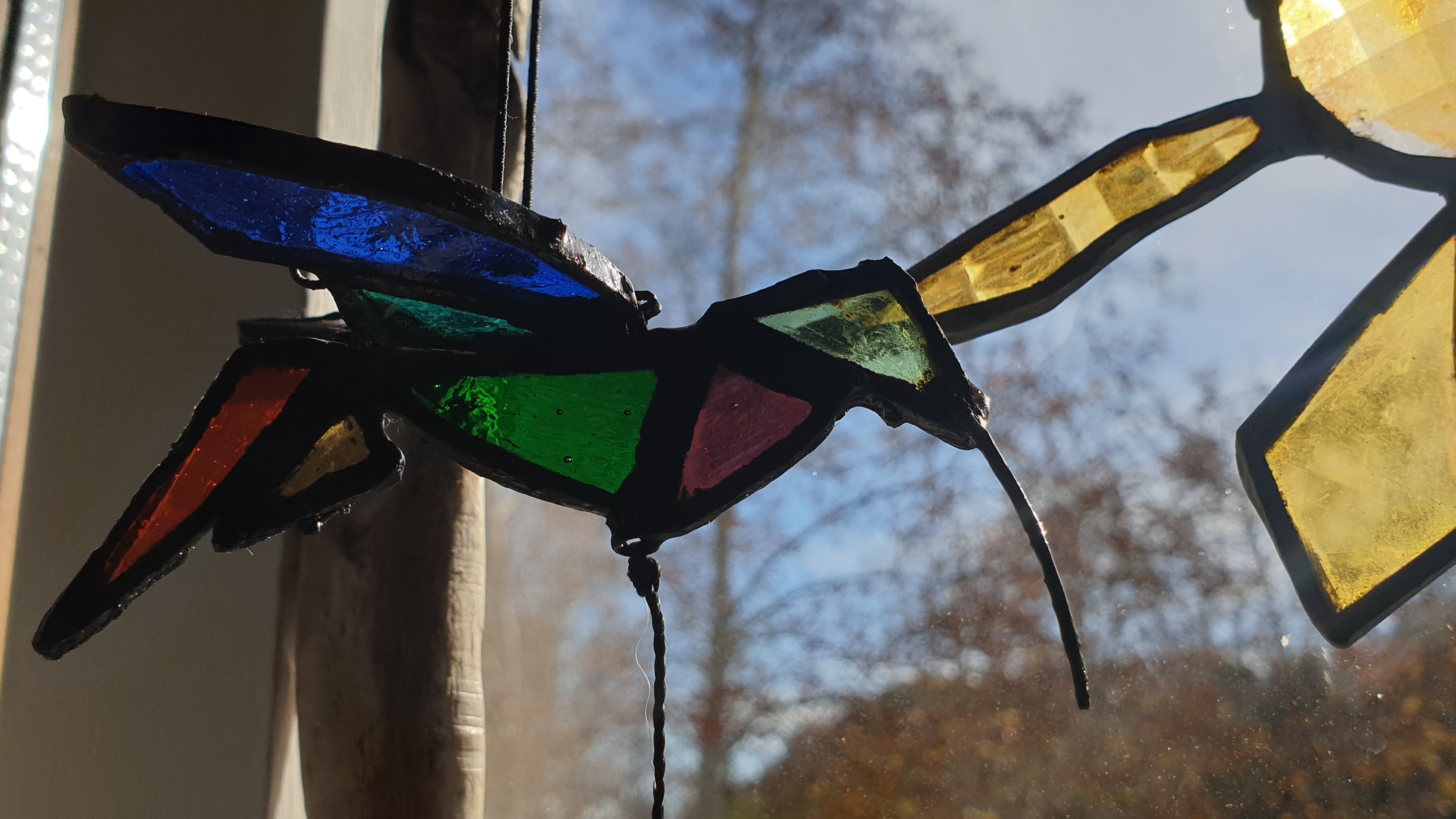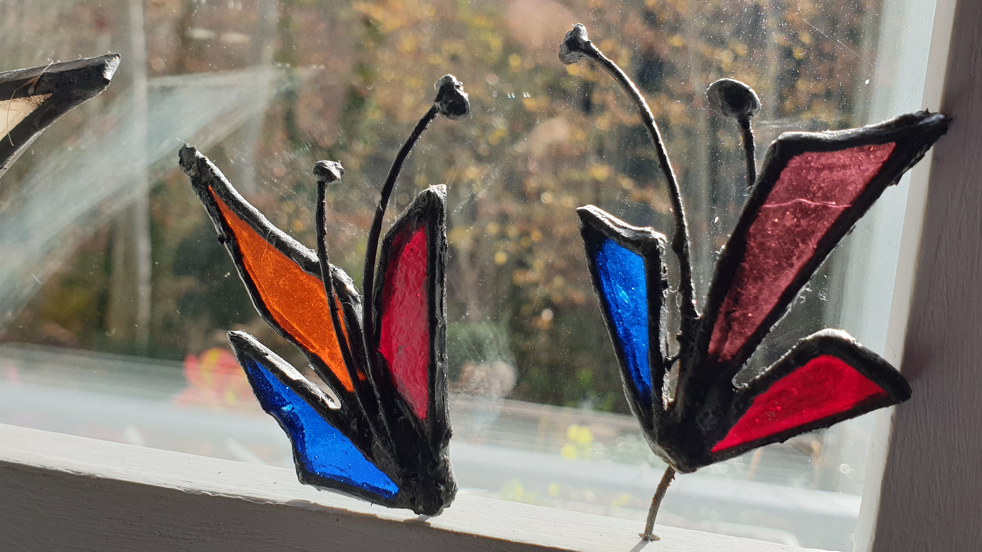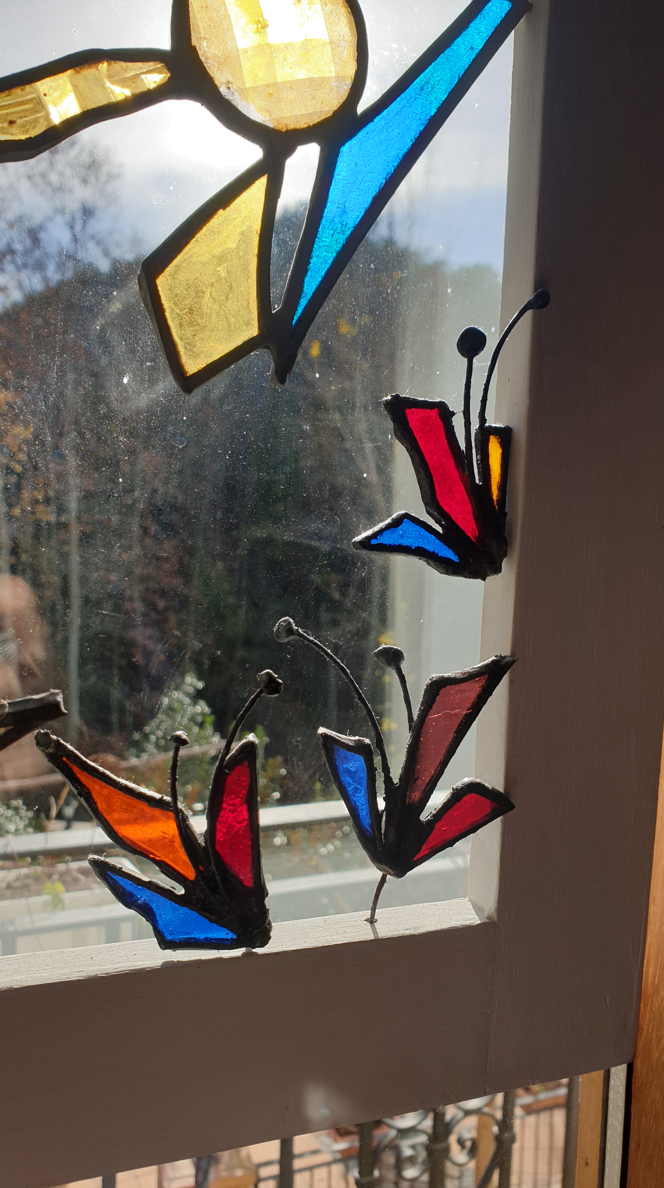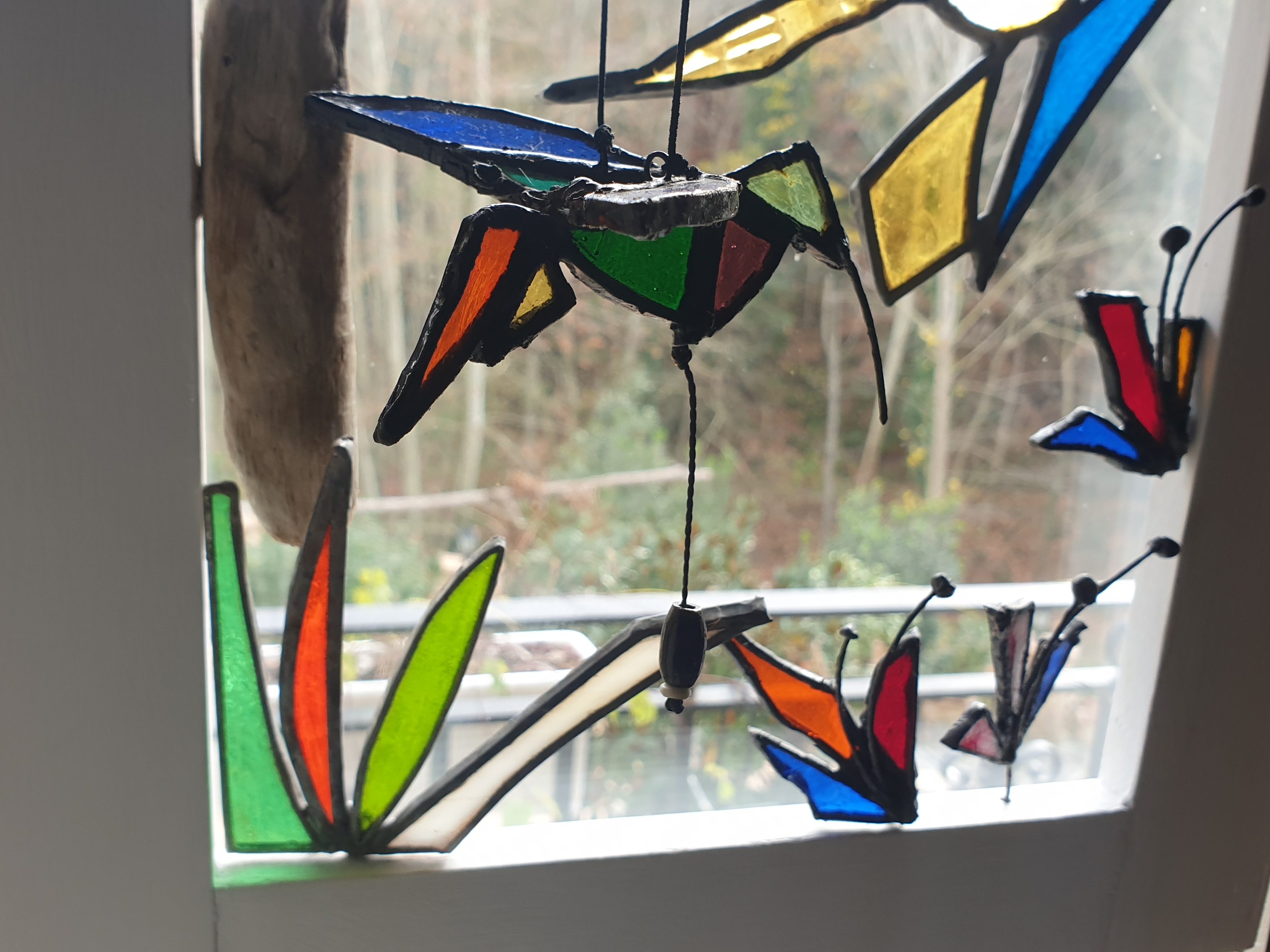 Cuadro 3D interactivo creado a 4 manos, reciclando piezas de vidrios de colores y texturas para el diseño en técnica Tiffany y acompañándolo con madera de deriva y un marco restaurado.