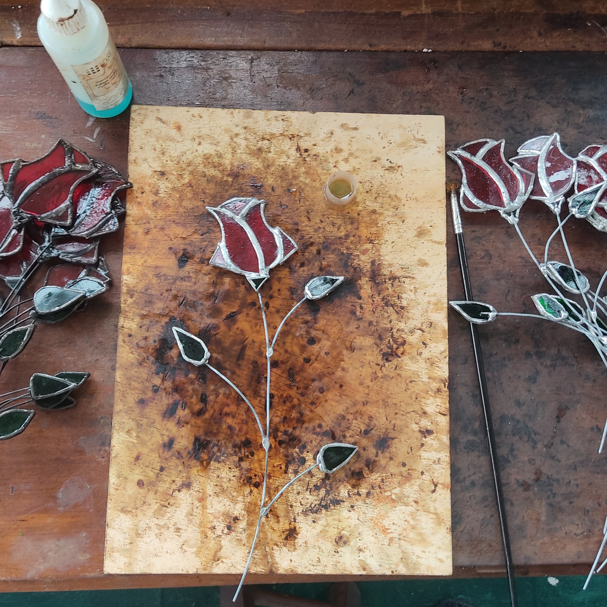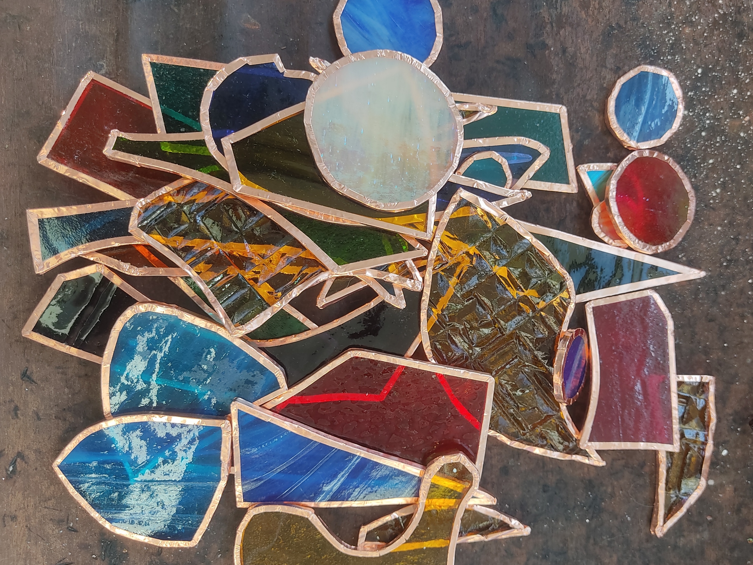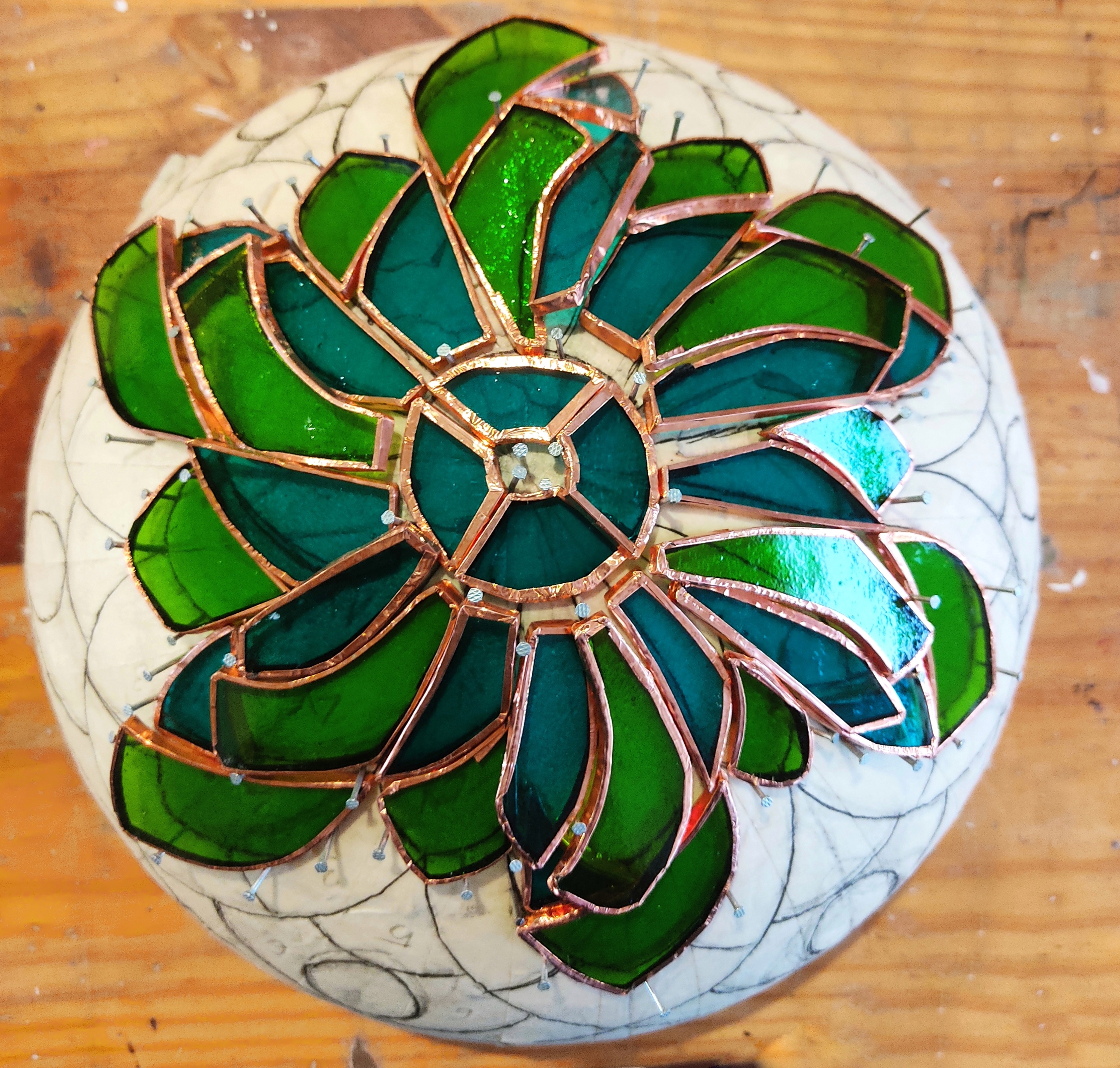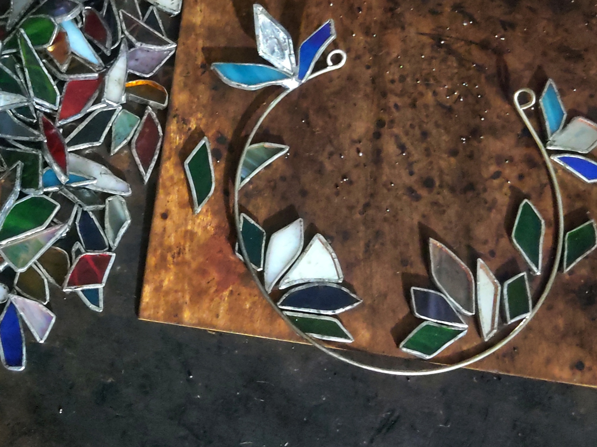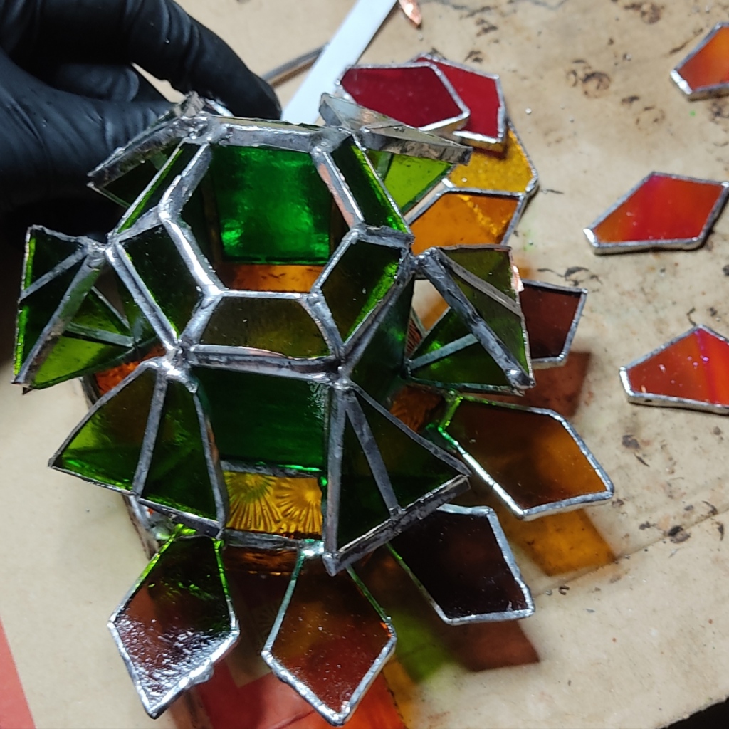 Sucesivamente se recorre cada pieza encintada, soldándola individualmente, para luego poder soldar la estructura final. Partiendo del método Tiffany, elaboramos estructuras y técnicas propias que nos permiten soldar en relieve, creando formas complejas. Al trabajar en ángulos específicos, las piezas mas complejas deben ir bien sujetadas para mantener su forma.