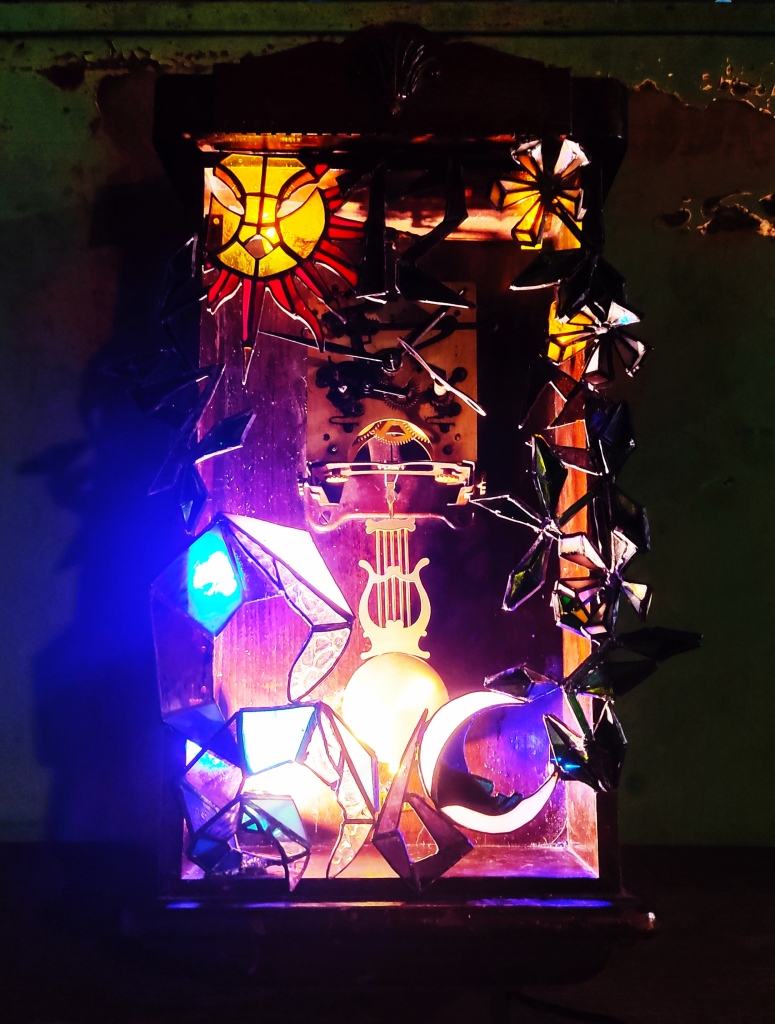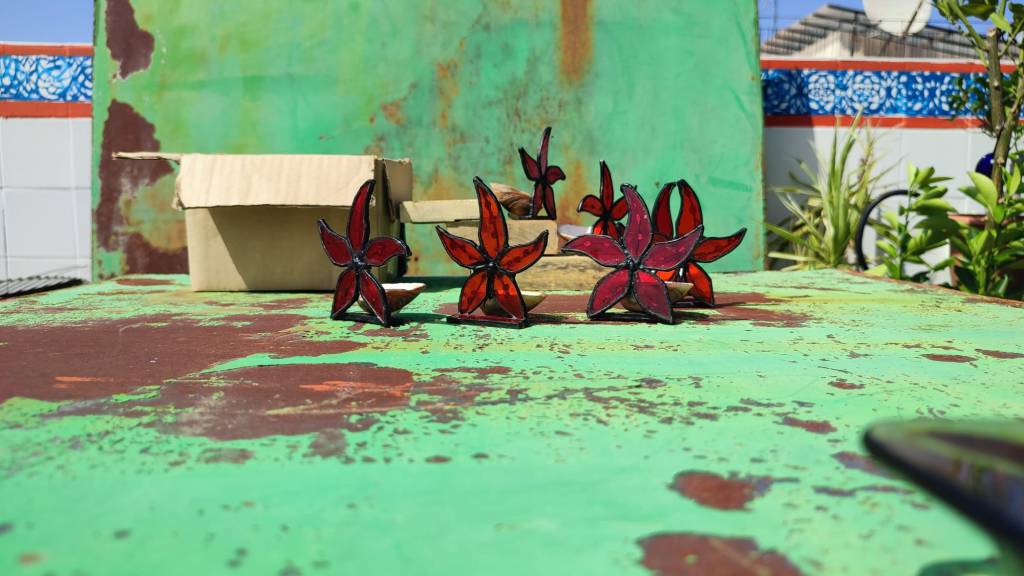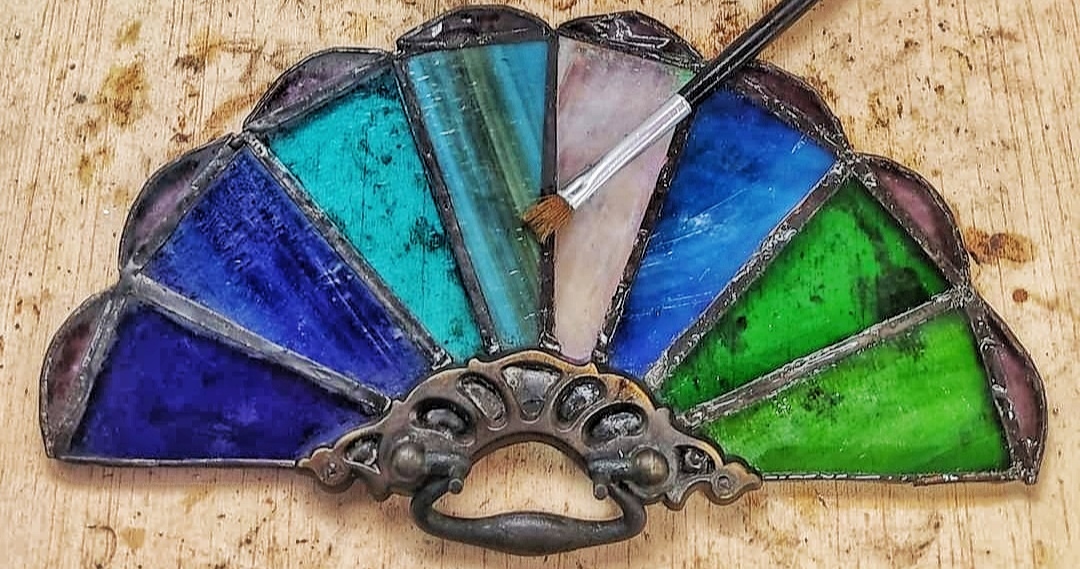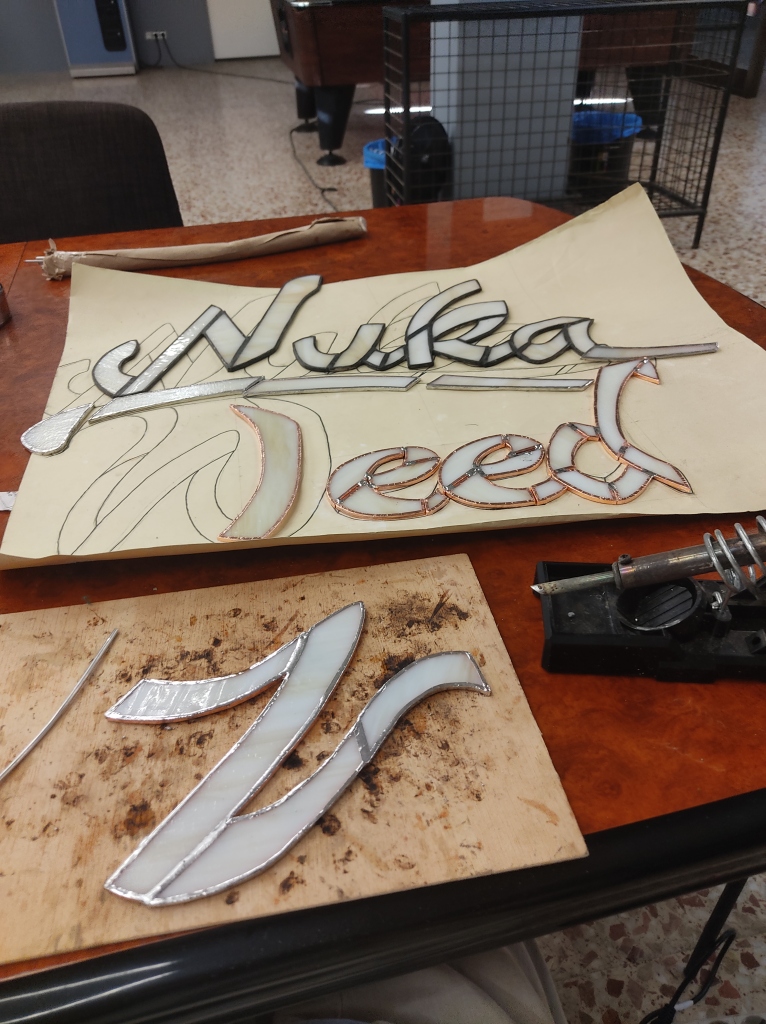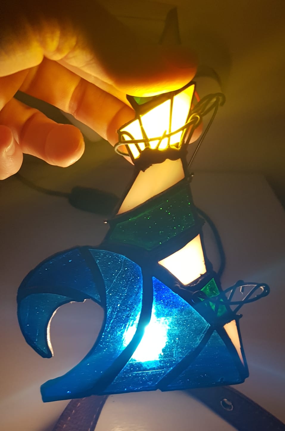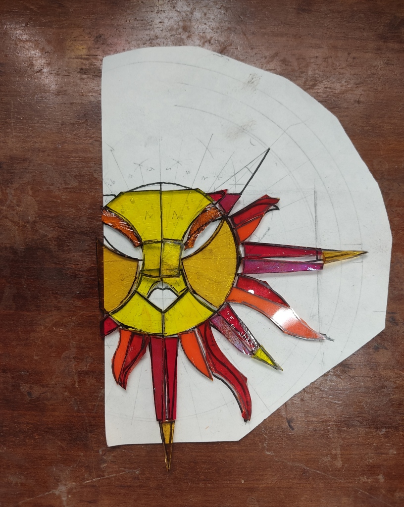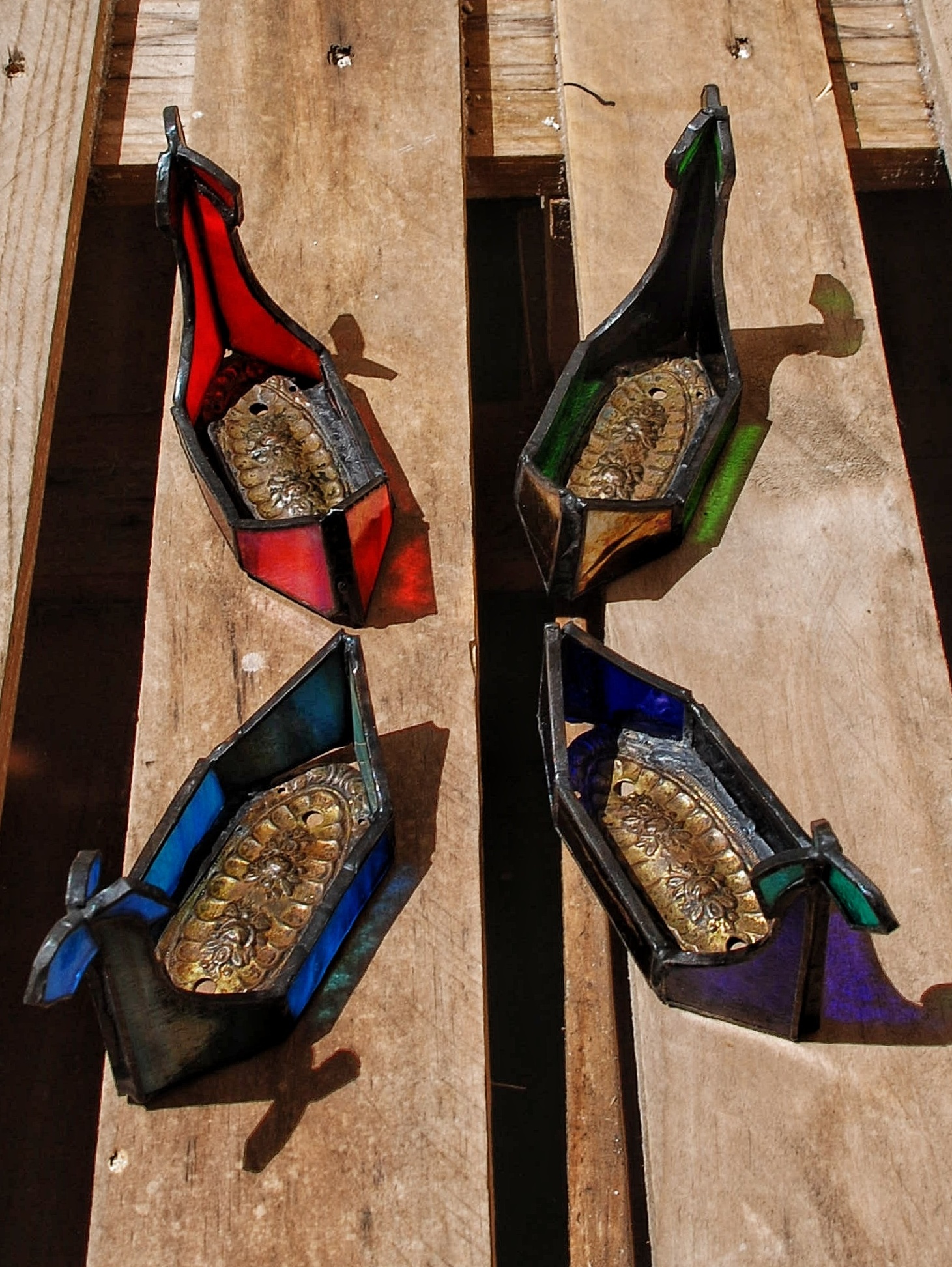 Sucesivamente se recorre cada pieza encintada, soldándola individualmente, para luego poder soldar la estructura final. Partiendo del método Tiffany, elaboramos estructuras y técnicas propias que nos permiten soldar en relieve, creando formas complejas. Al trabajar en ángulos específicos, las piezas mas complejas deben ir bien sujetadas para mantener su forma.