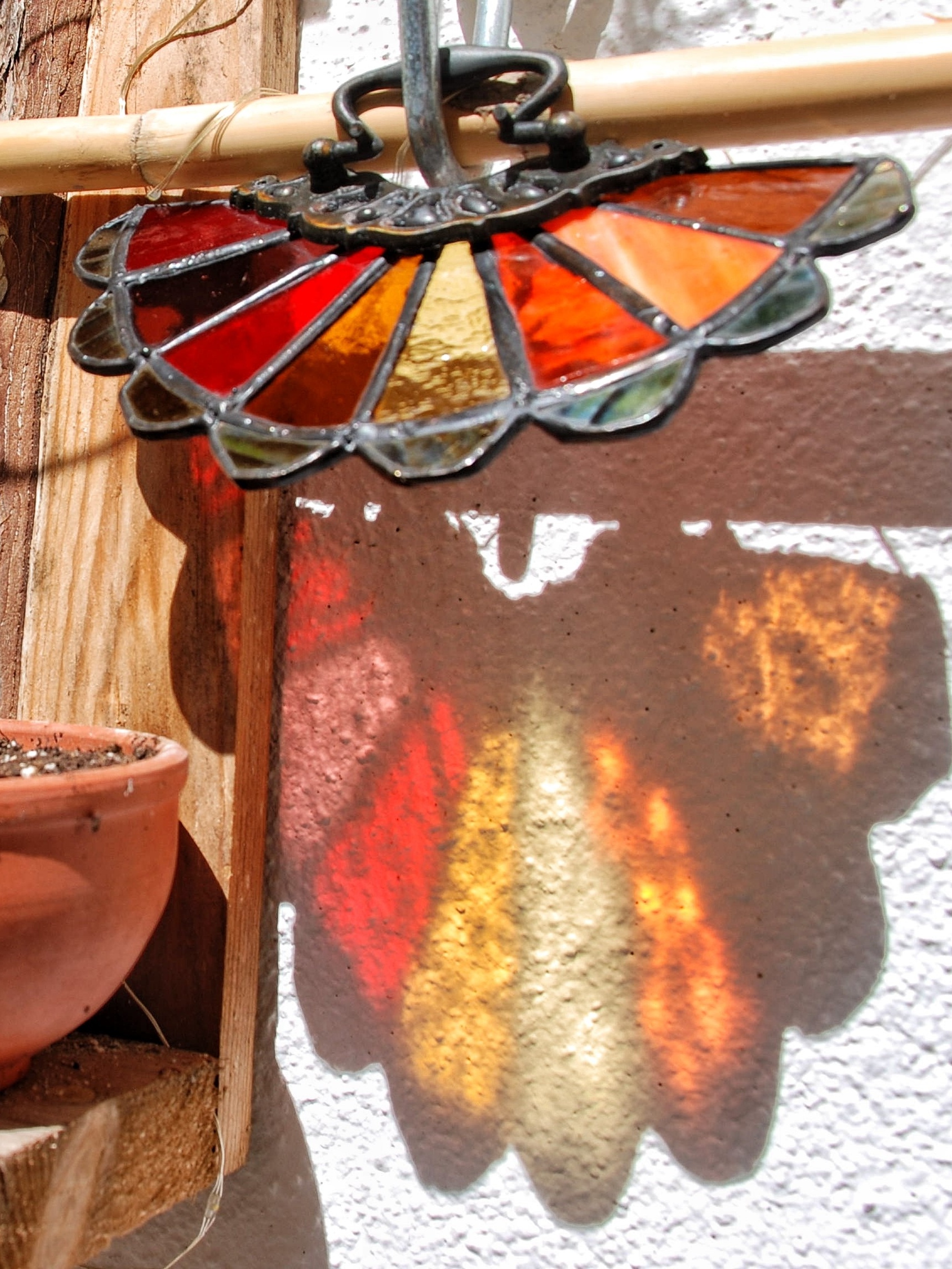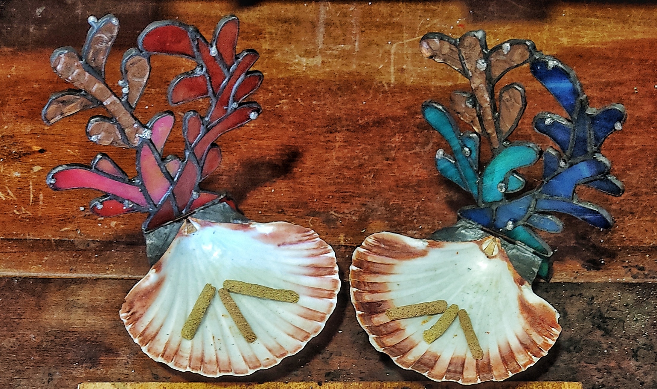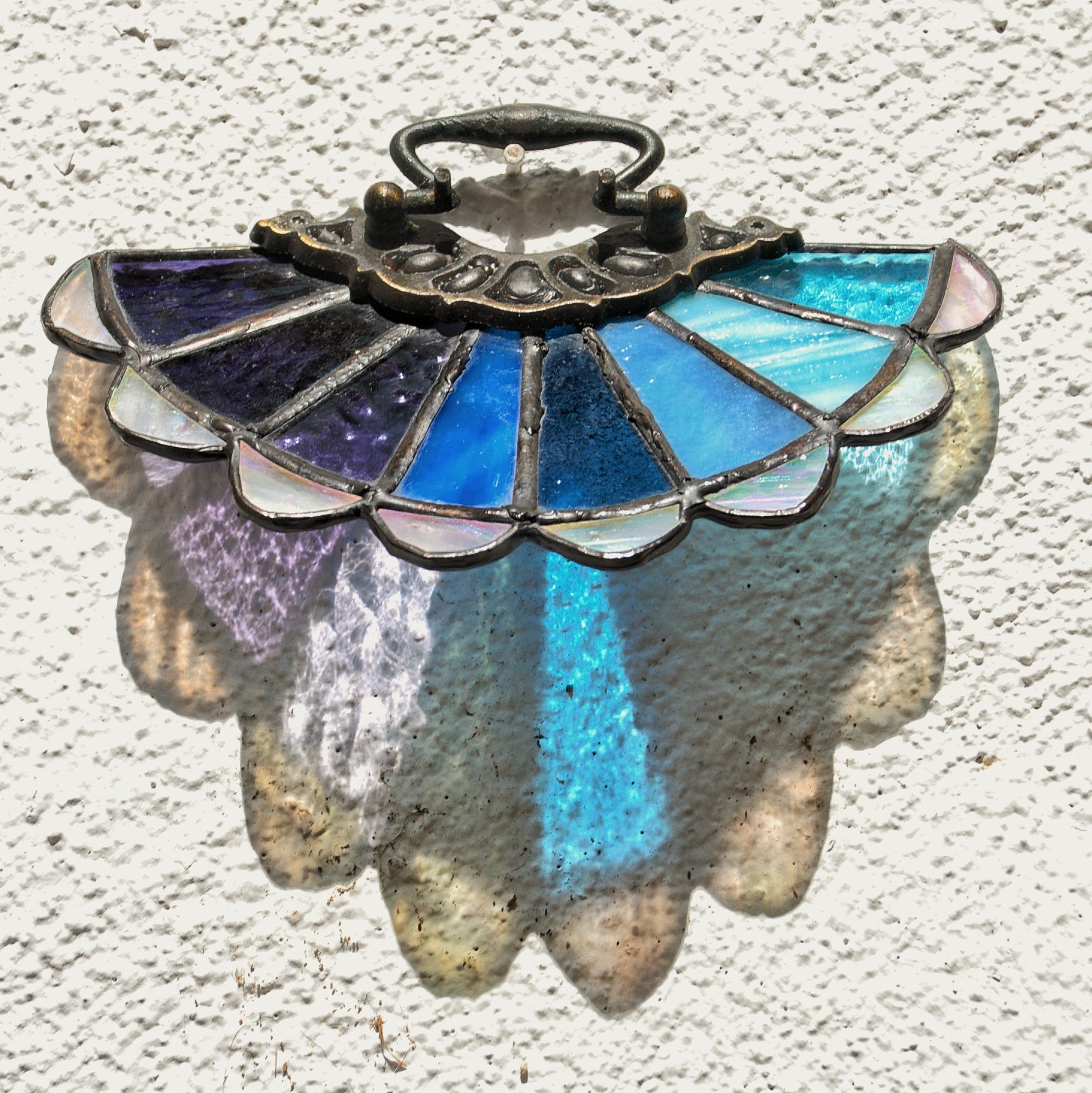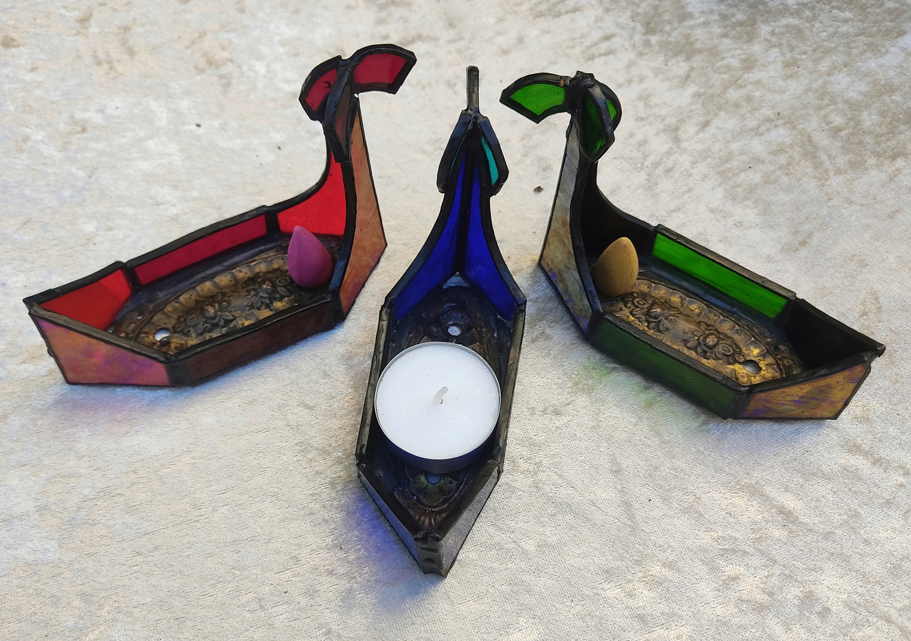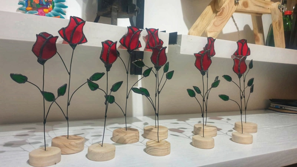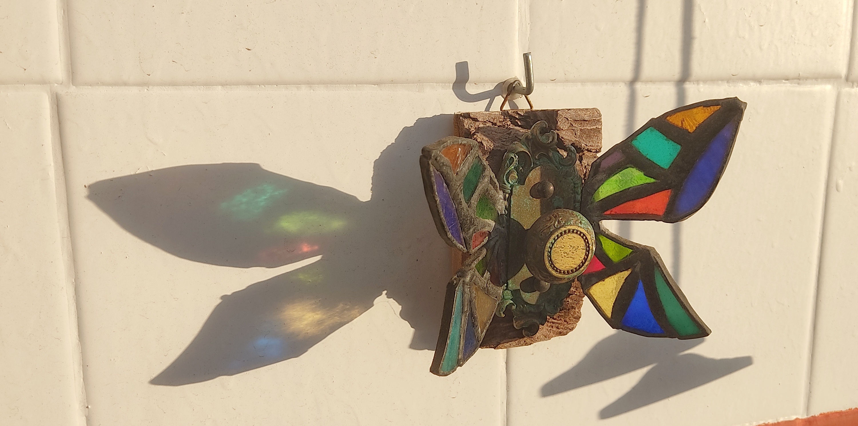 Sucesivamente se recorre cada pieza encintada, soldándola individualmente, para luego poder soldar la estructura final. Partiendo del método Tiffany, elaboramos estructuras y técnicas propias que nos permiten soldar en relieve, creando formas complejas. Al trabajar en ángulos específicos, las piezas mas complejas deben ir bien sujetadas para mantener su forma.