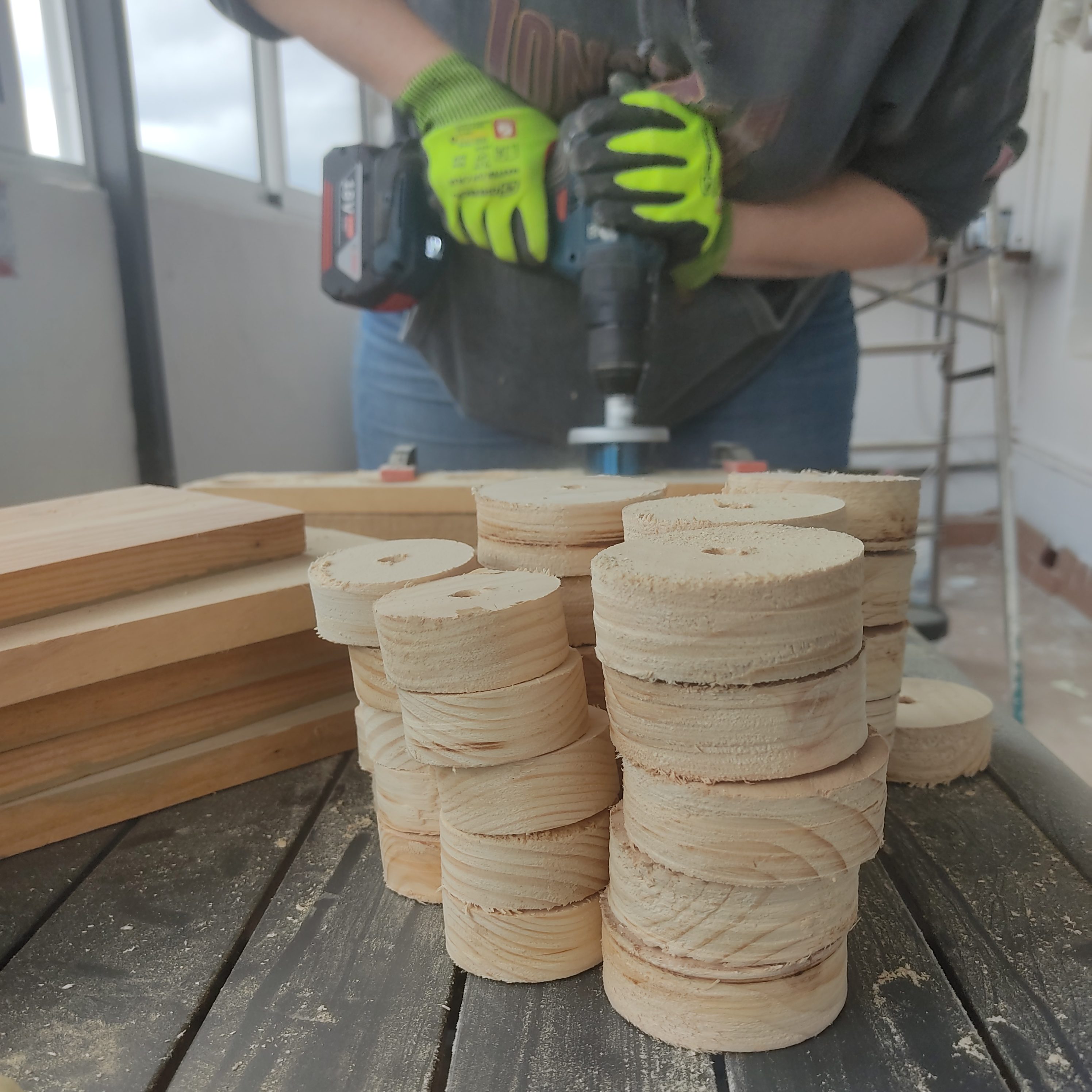 Escogemos los materiales cuidadosamente, a menudo reutilizando mermas de nuestros trabajos anteriores, para minimizar el desperdicio.