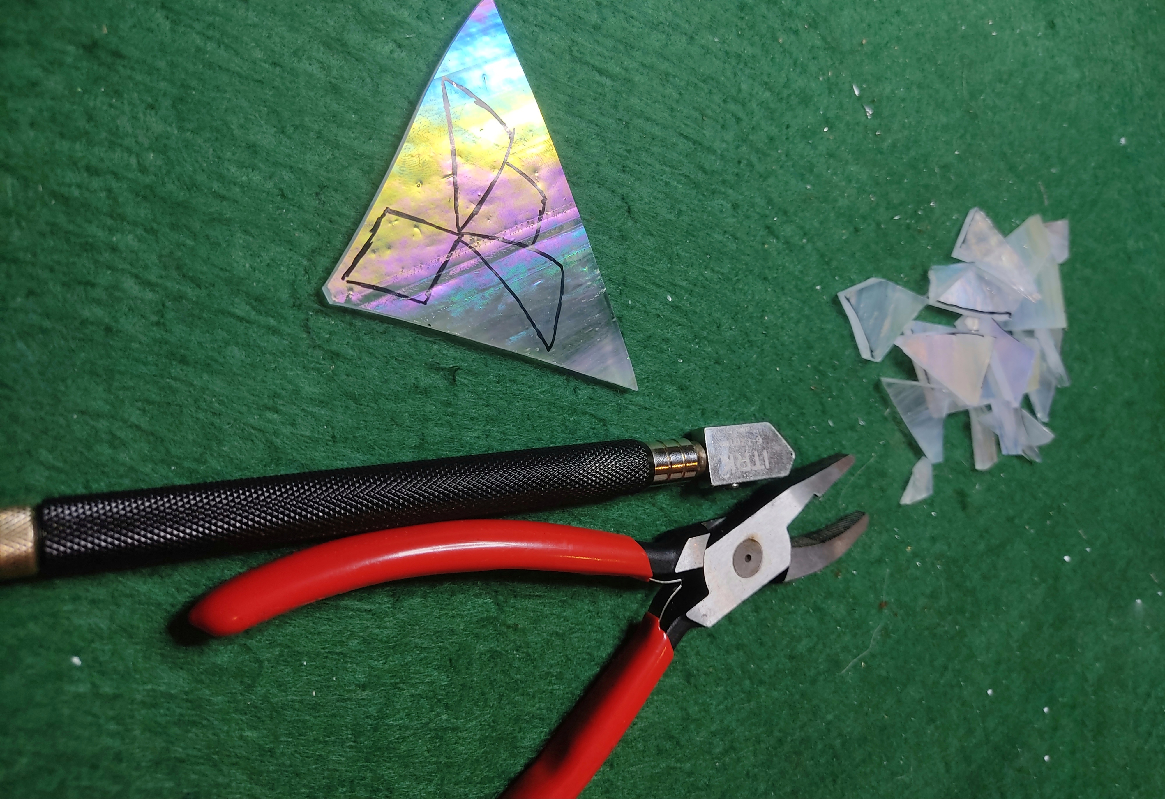 El corte de vidrio se efectúa con una herramienta con punta de diamante. La inclinación de la curva y los ángulos definen la complejidad de la obra.