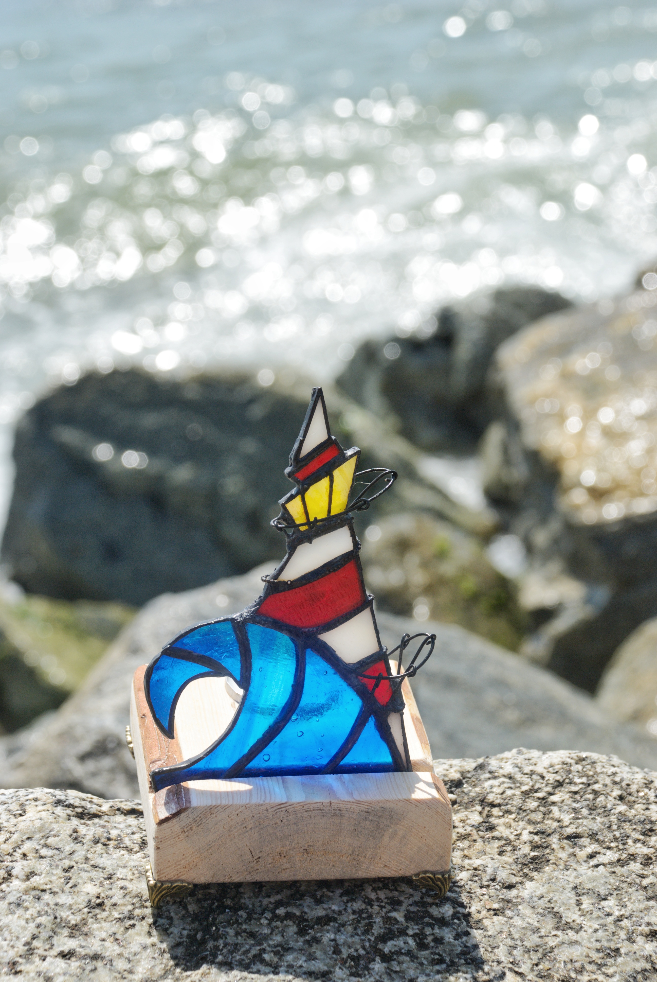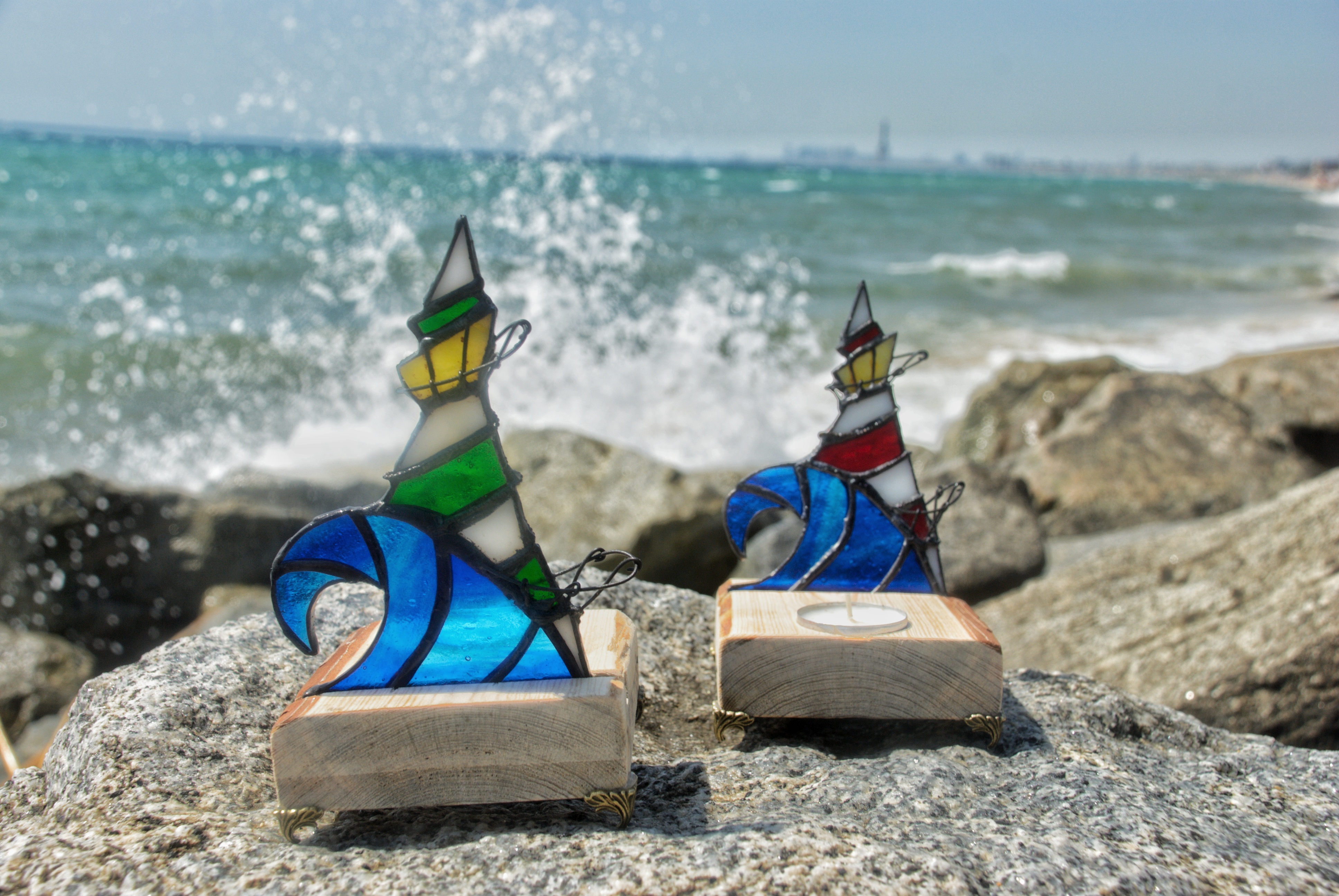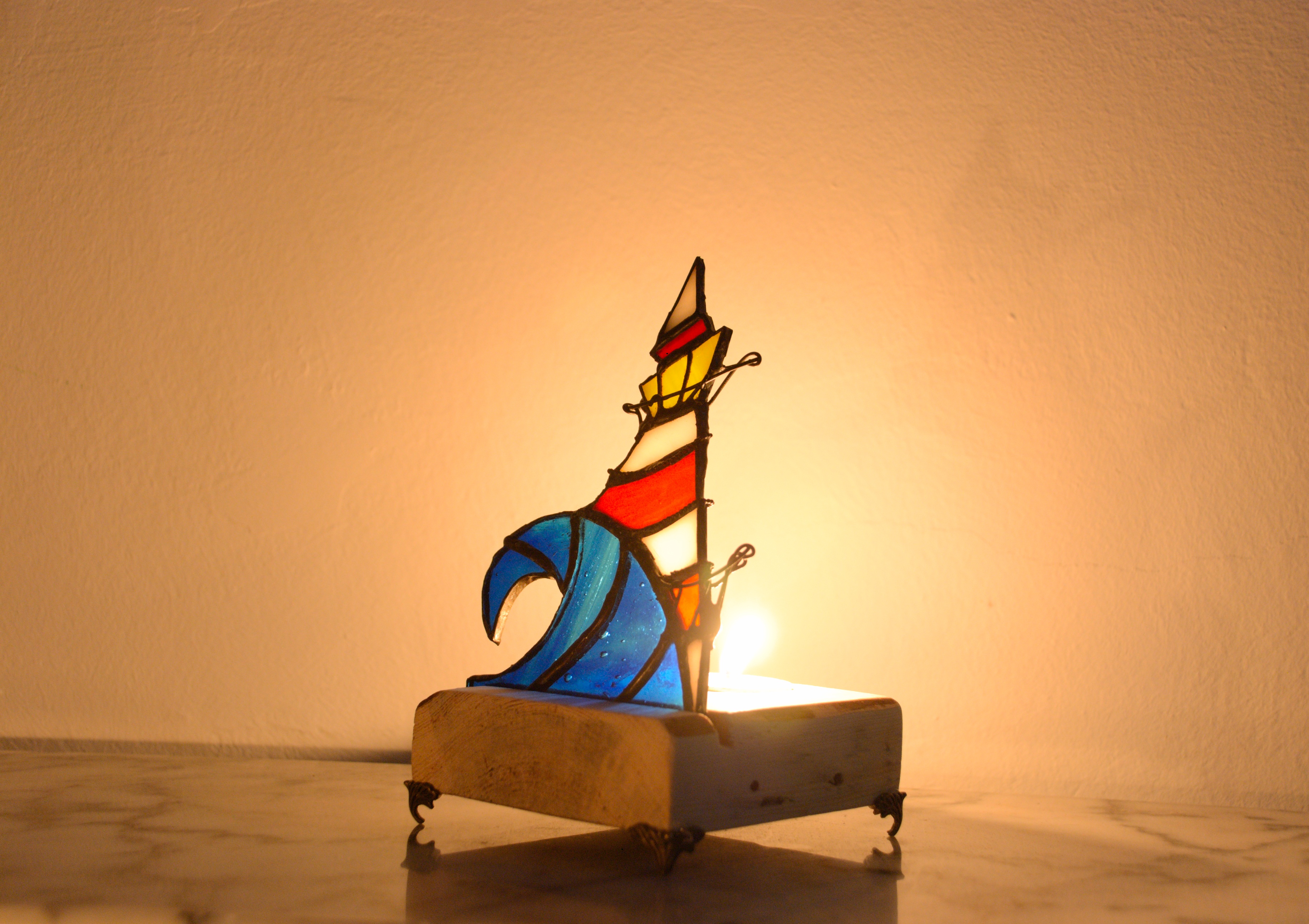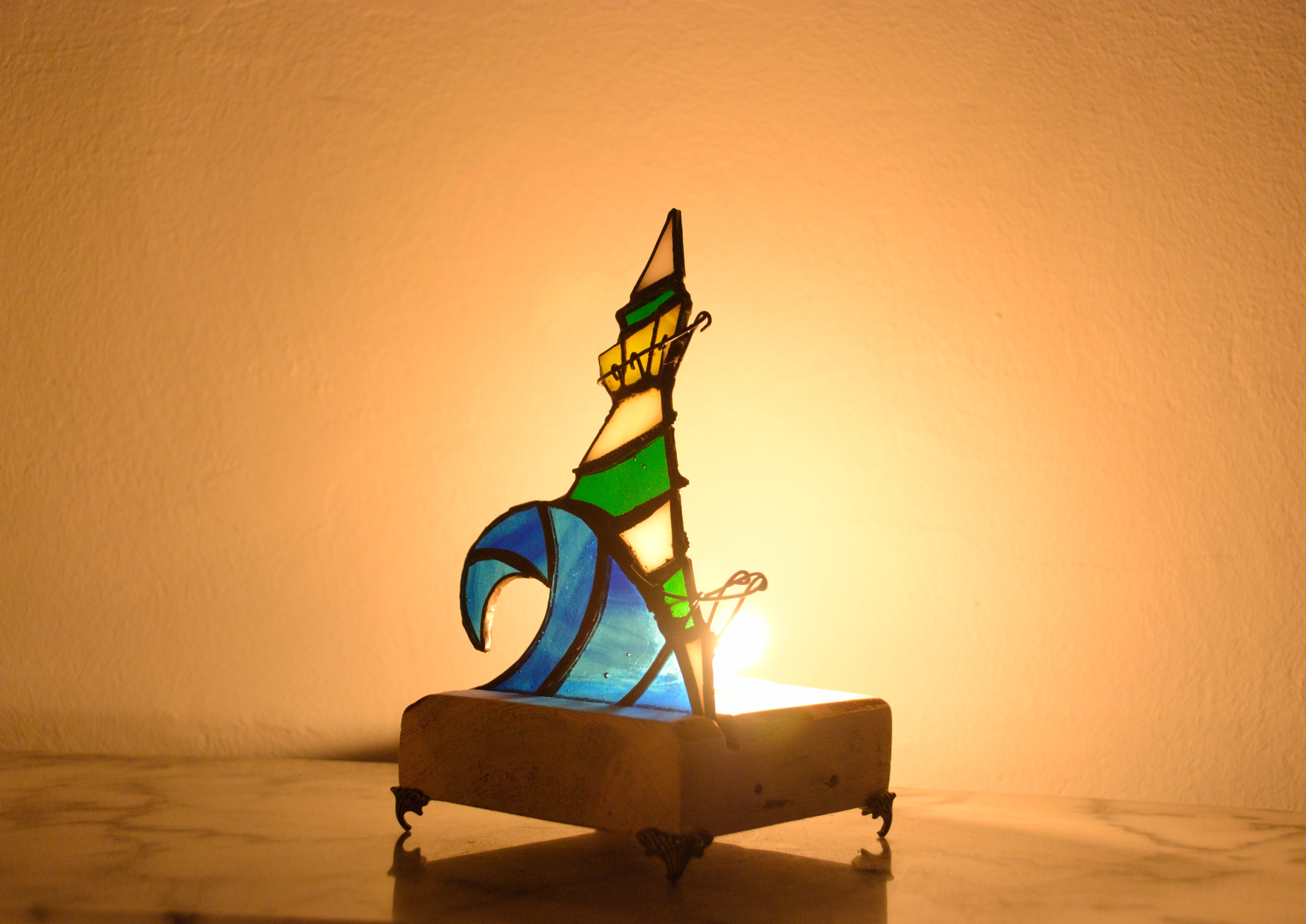La luz interior del faro crea un punto de luz cálido y acogedor, mientras que los reflejos en las vidrieras marinas añaden un toque mágico y marino.