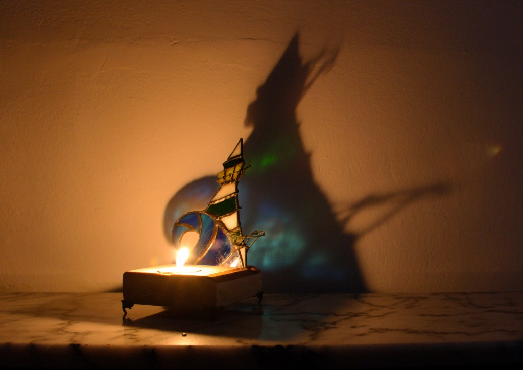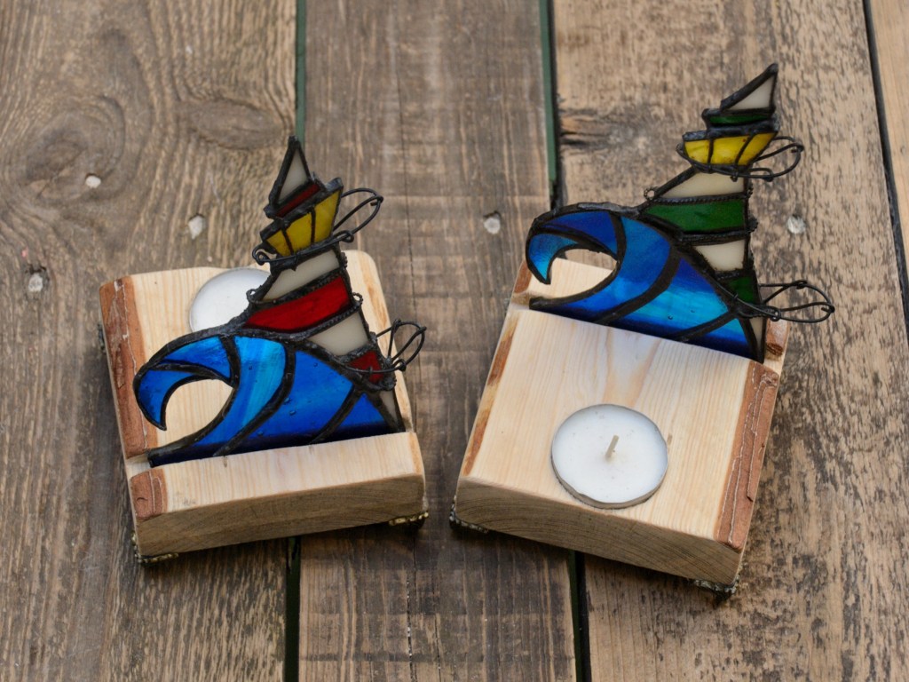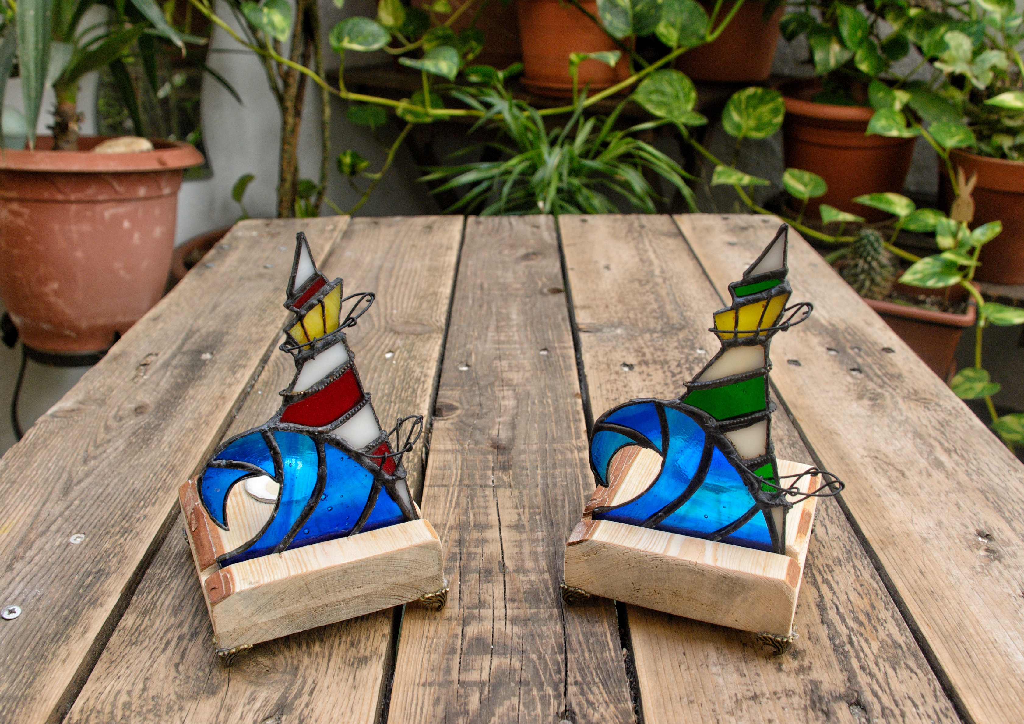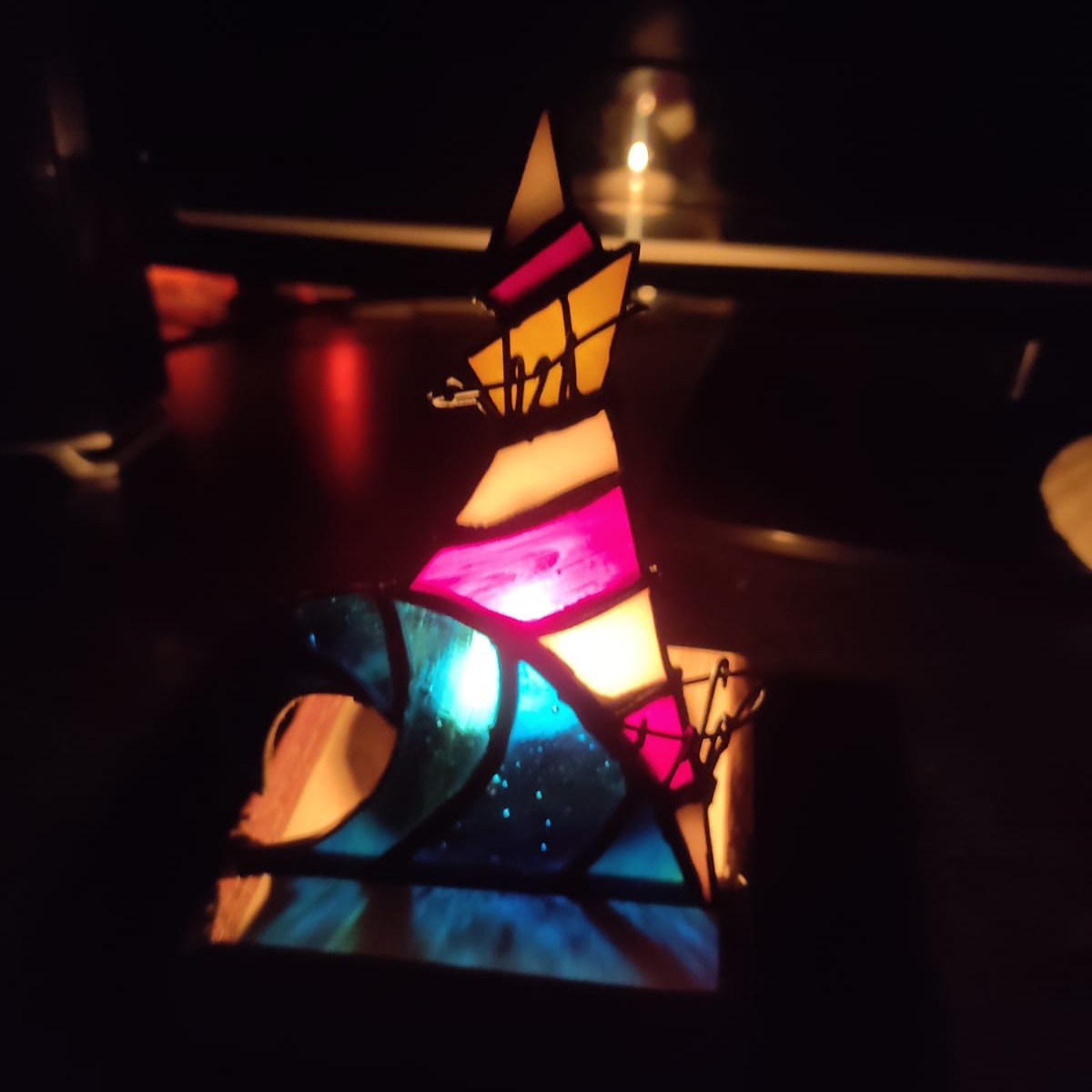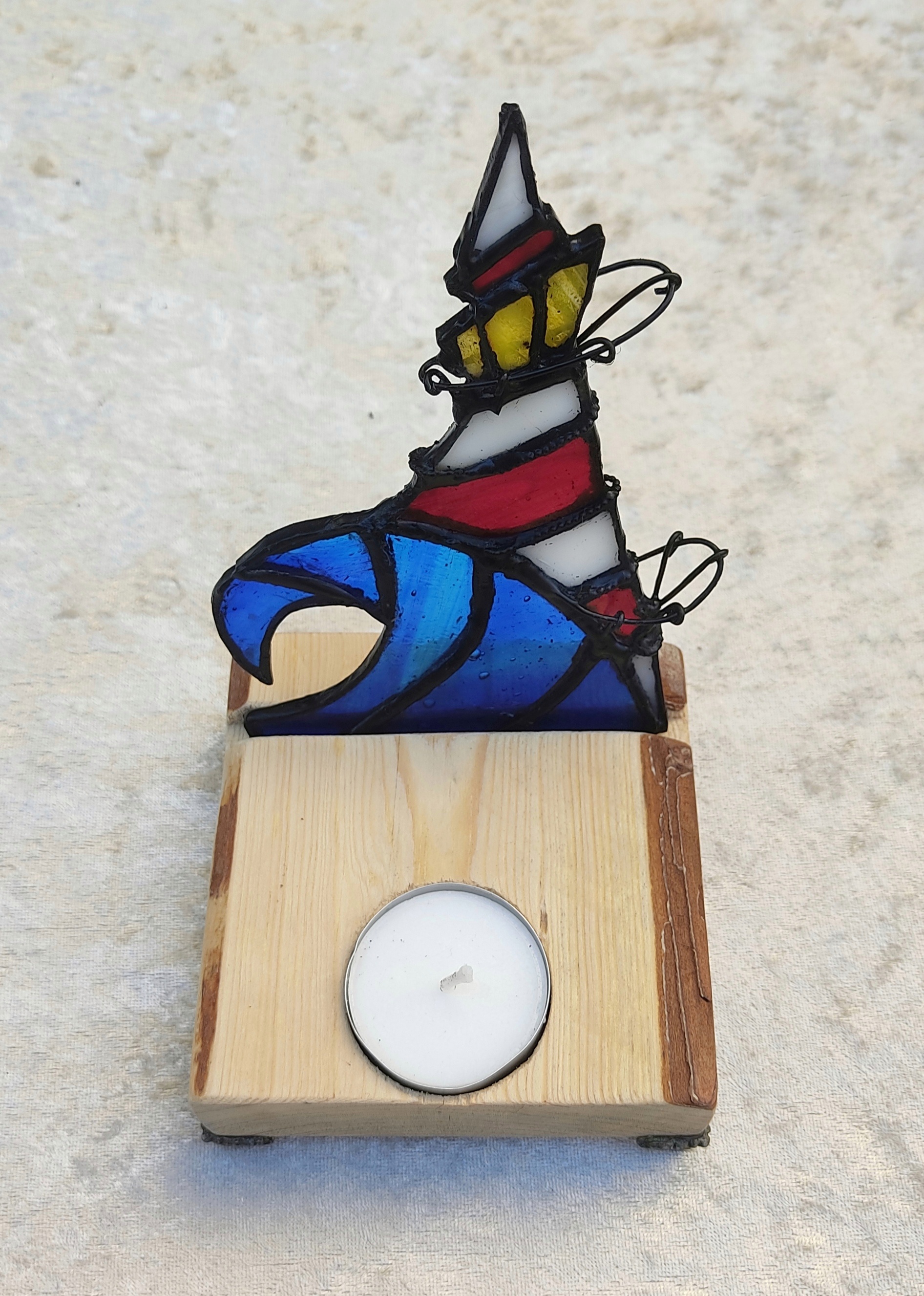 La luz interior del faro crea un punto de luz cálido y acogedor, mientras que los reflejos en las vidrieras marinas añaden un toque mágico y marino.