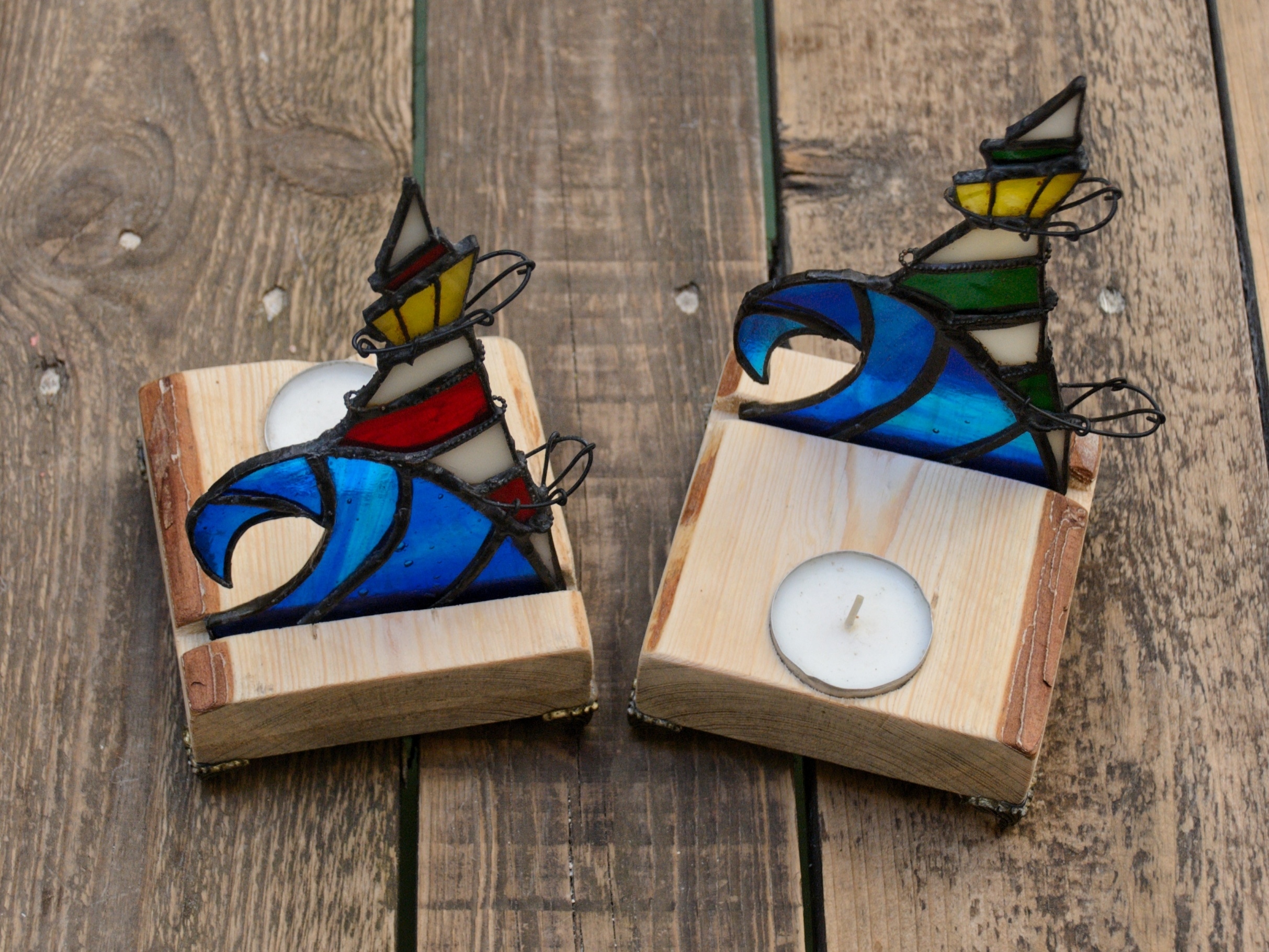 Esta obra fue creada en un proceso a cuatro manos, combinando la parte de vitral y la de madera y cuidando de cada detalle, como las patitas adornadas que simulan una antigüedad de bronce.