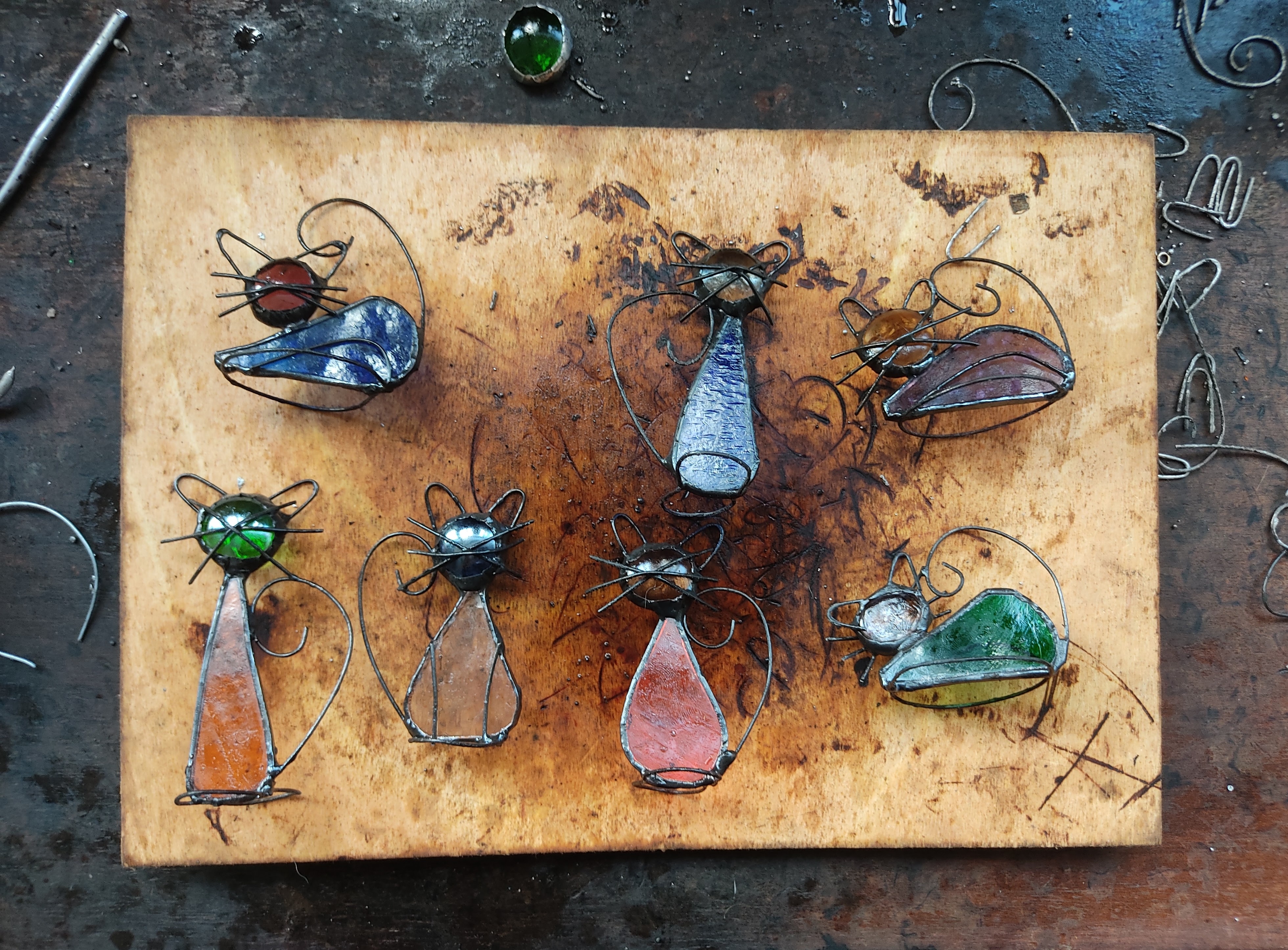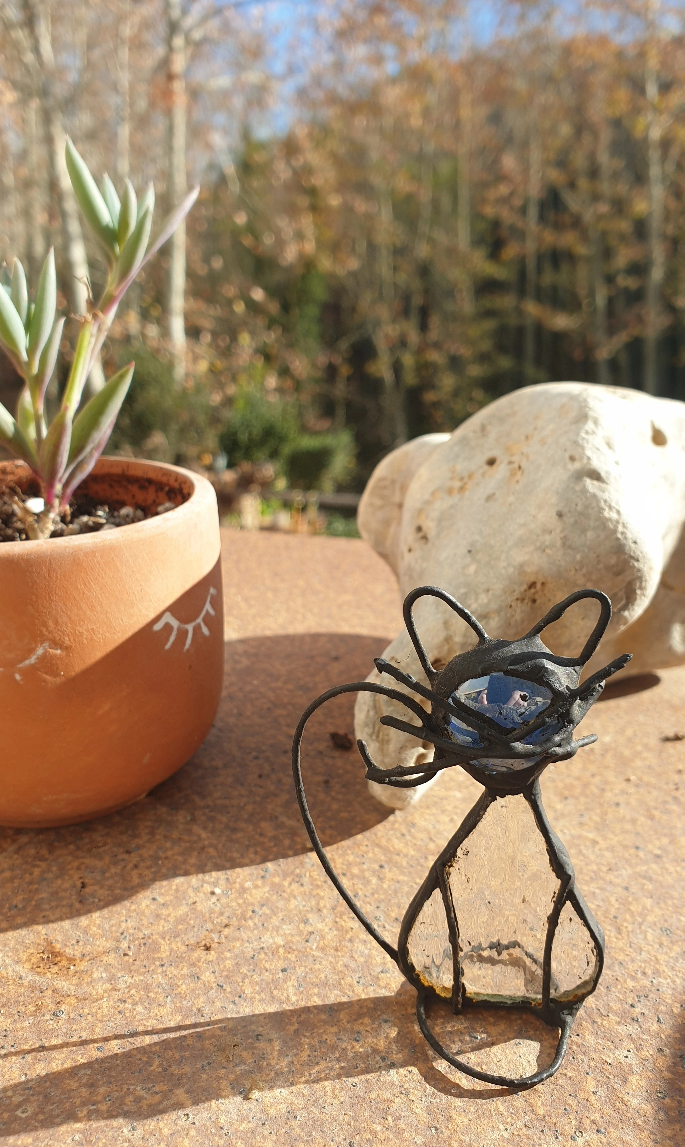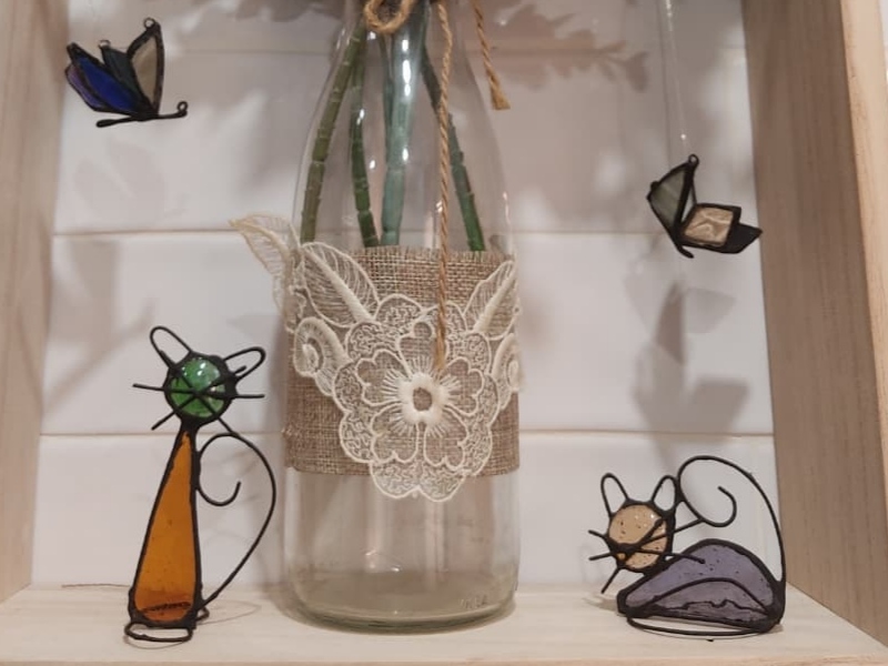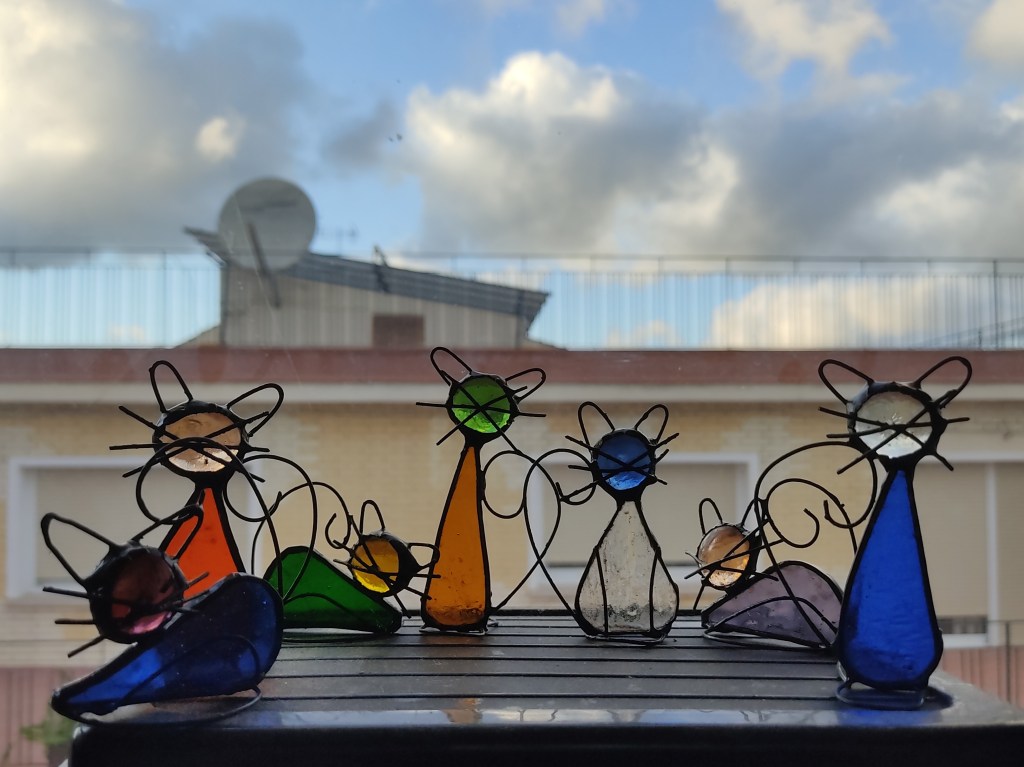 Diseñamos una serie de gatitos de vidrio, cada uno con un núcleo central de vidrio de color variado, ensamblado mediante la técnica de vitrales a una pieza de vidrio fundido que forma la cabeza. Para las orejas, la cola y la base que sostiene la figura, utilizamos alambre, moldeando y proporcionando una forma distinta a cada gato.