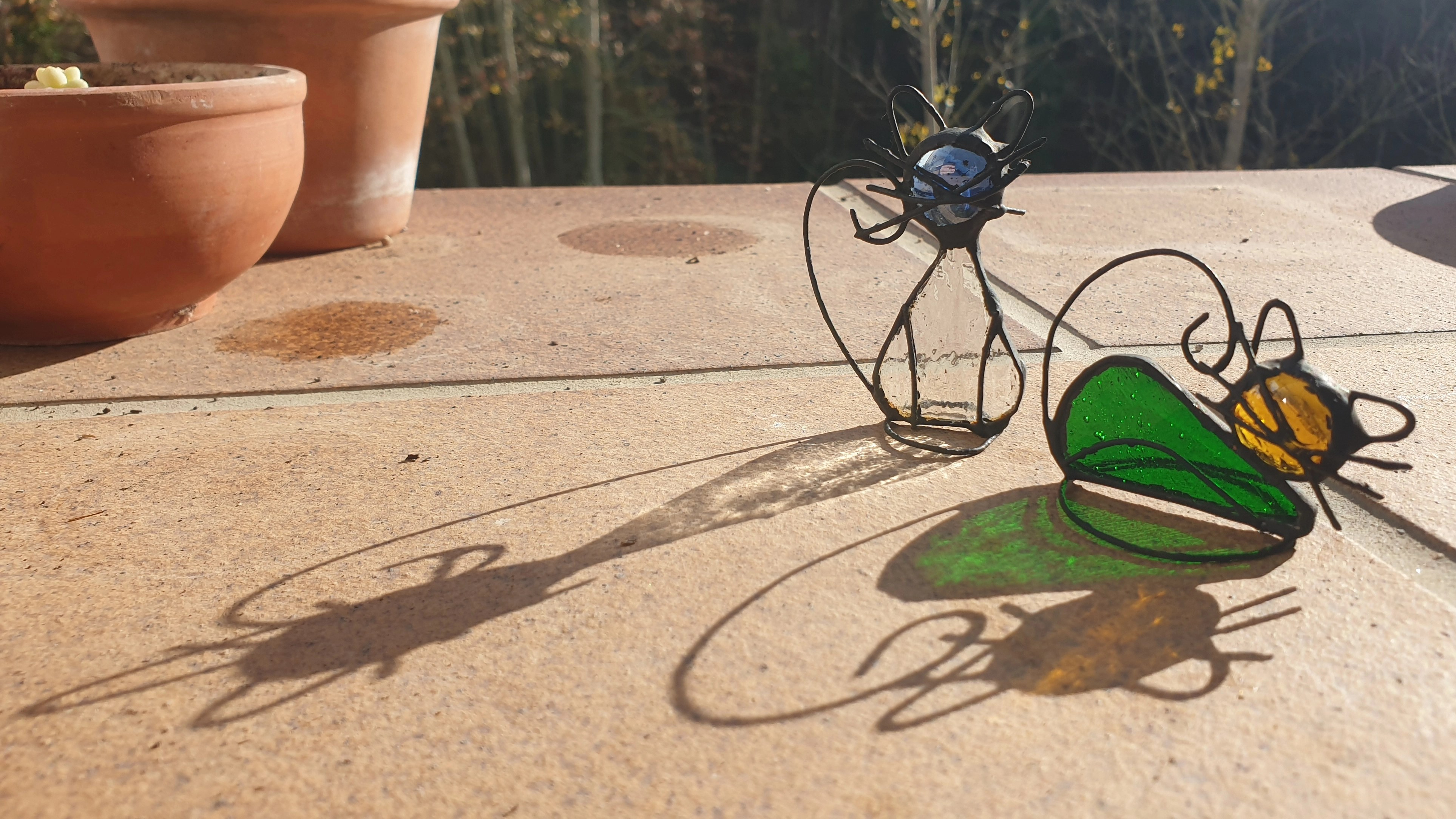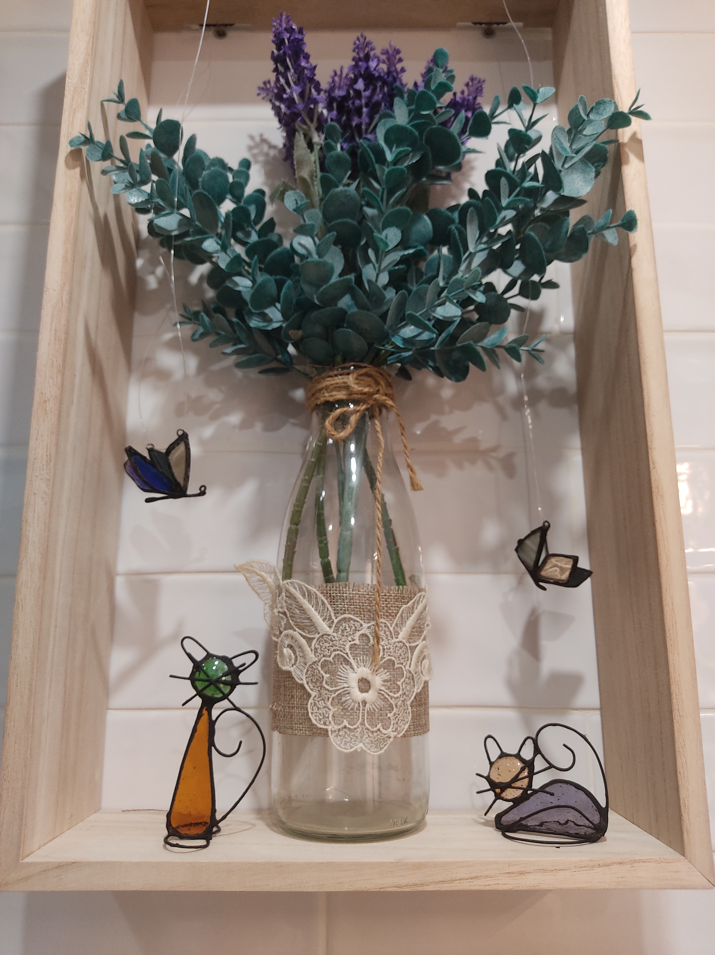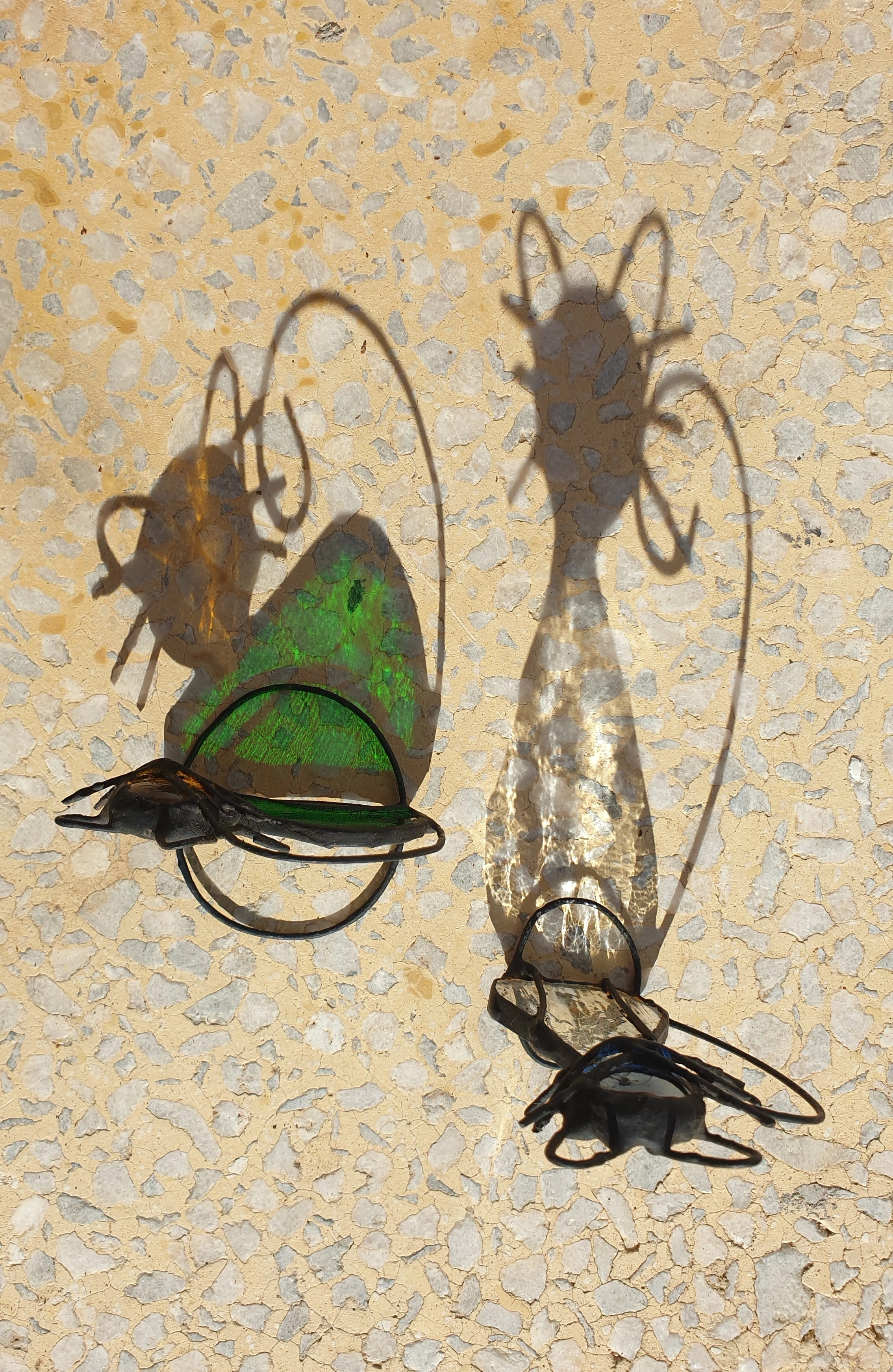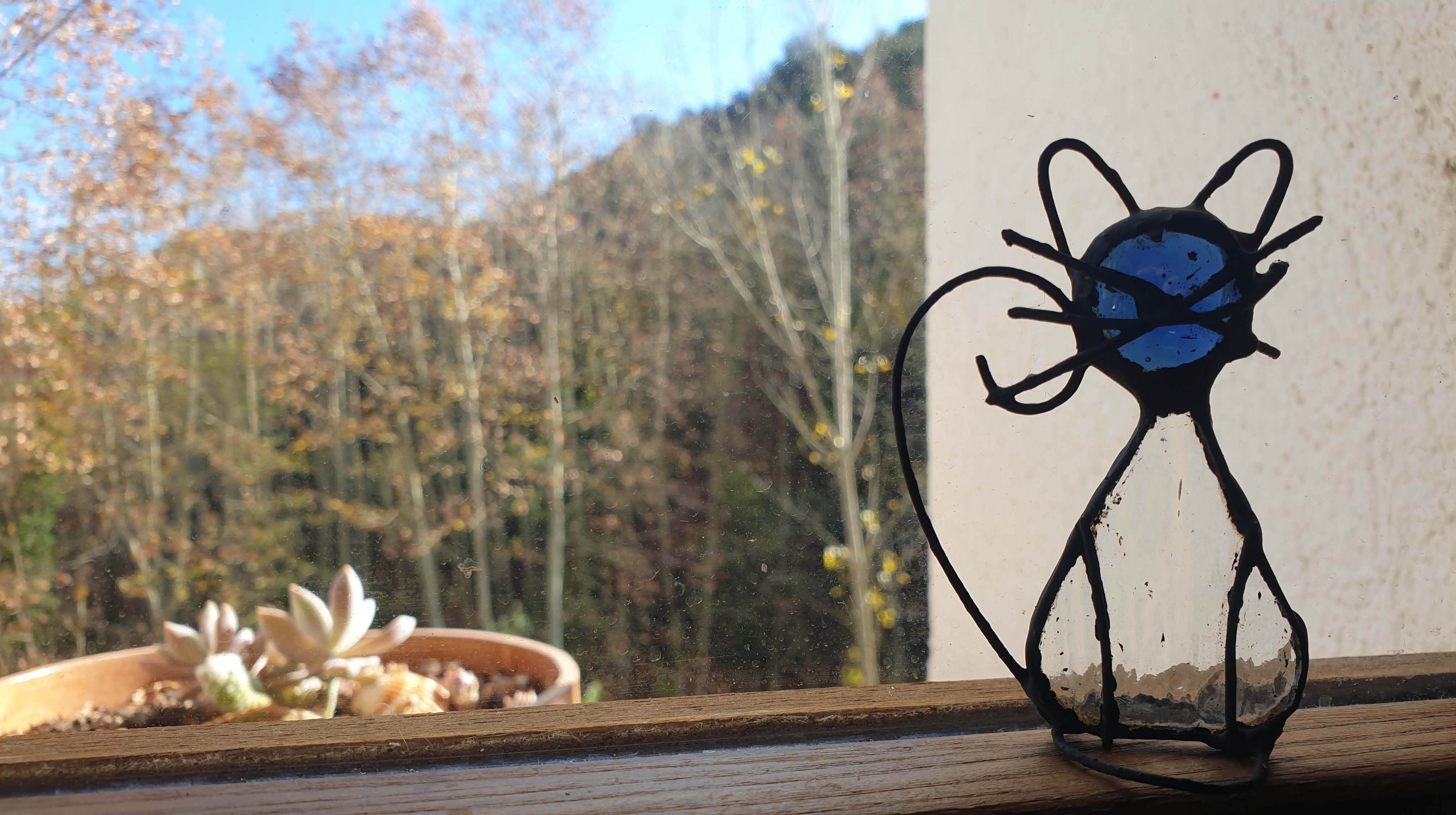 Diseñamos una serie de gatitos de vidrio, cada uno con un núcleo central de vidrio de color variado, ensamblado mediante la técnica de vitrales a una pieza de vidrio fundido que forma la cabeza. Para las orejas, la cola y la base que sostiene la figura, utilizamos alambre, moldeando y proporcionando una forma distinta a cada gato.