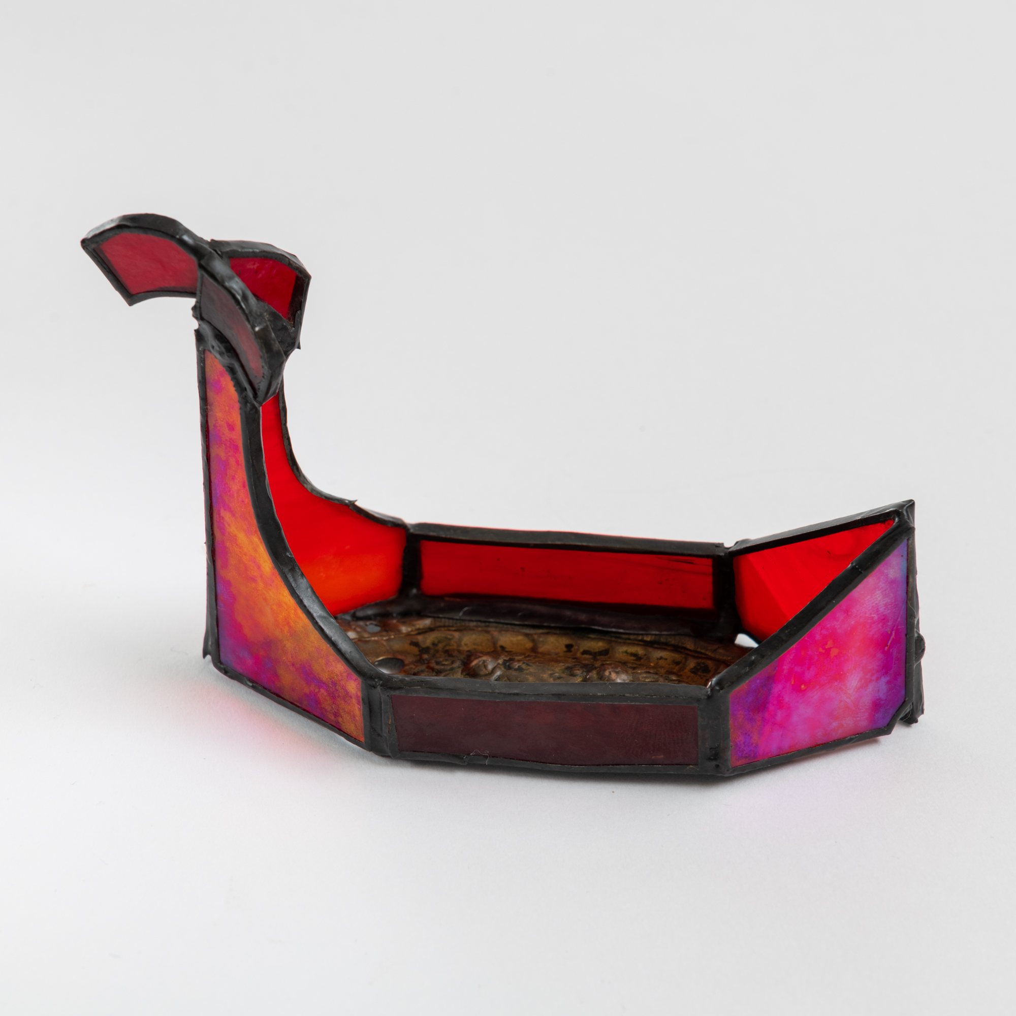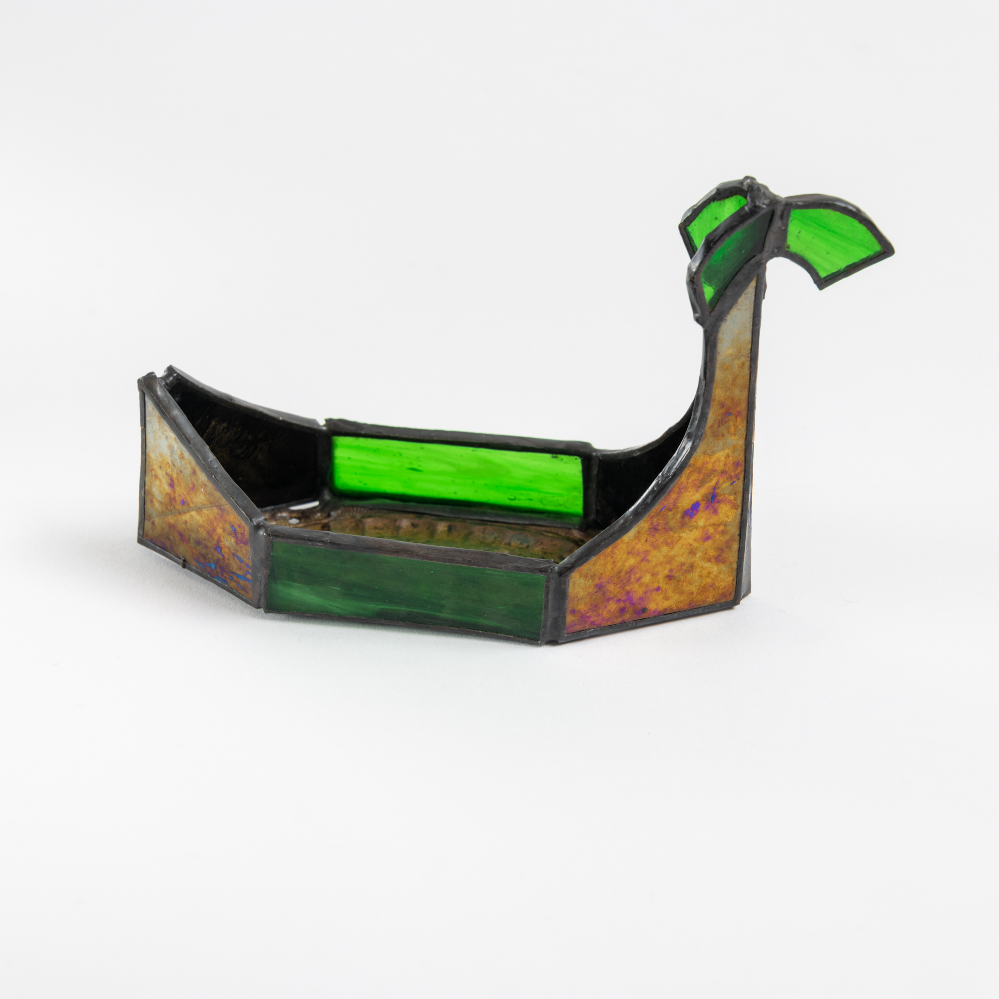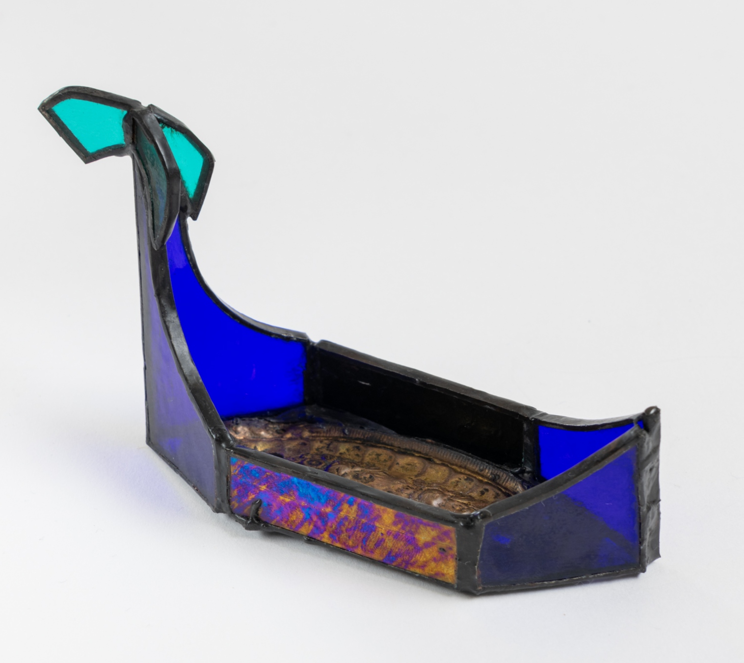 Inspiradas en las góndolas venecianas, estas piezas se realizaron soldando vidrios de colores a soportes de bronce antiguo ornamentado.