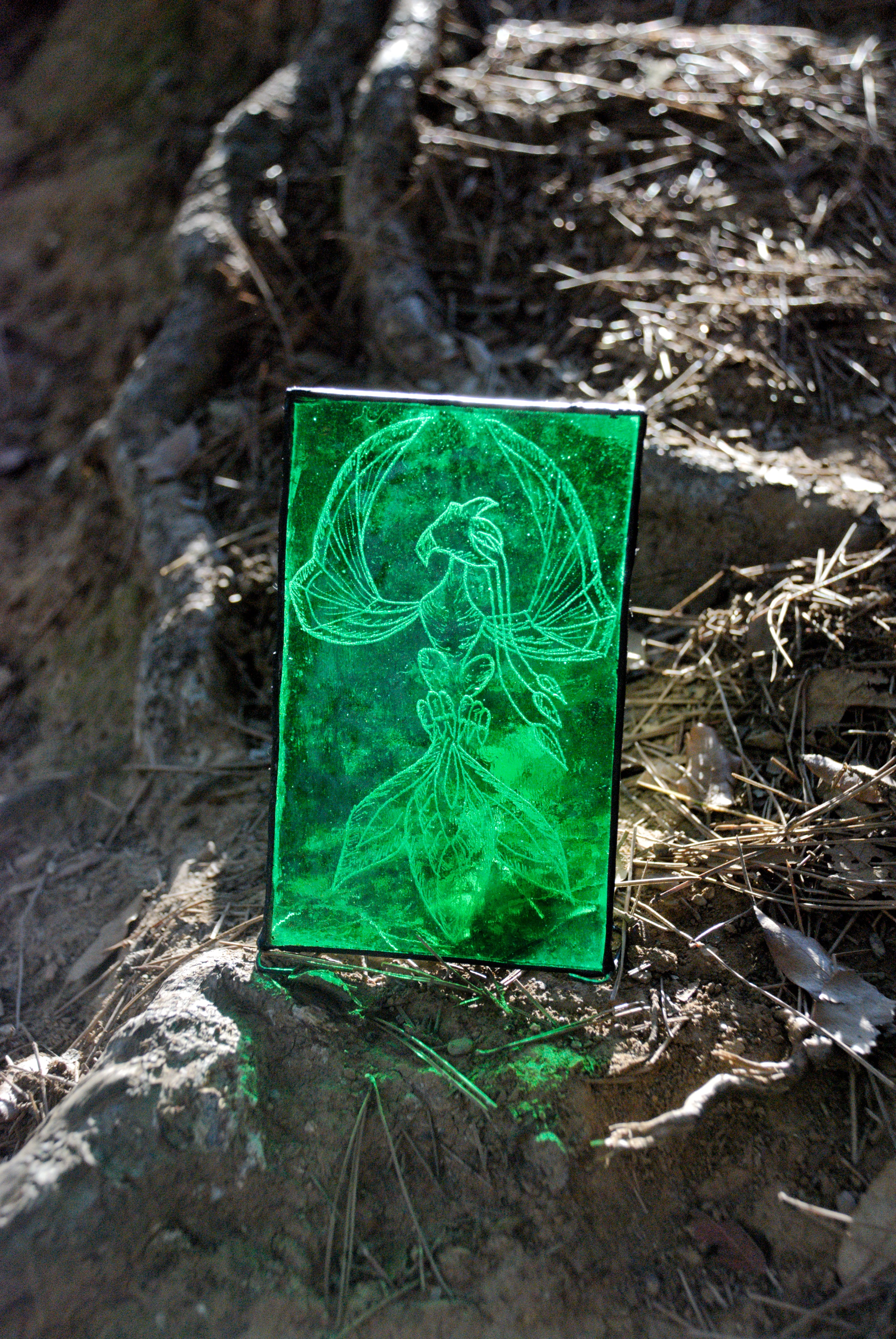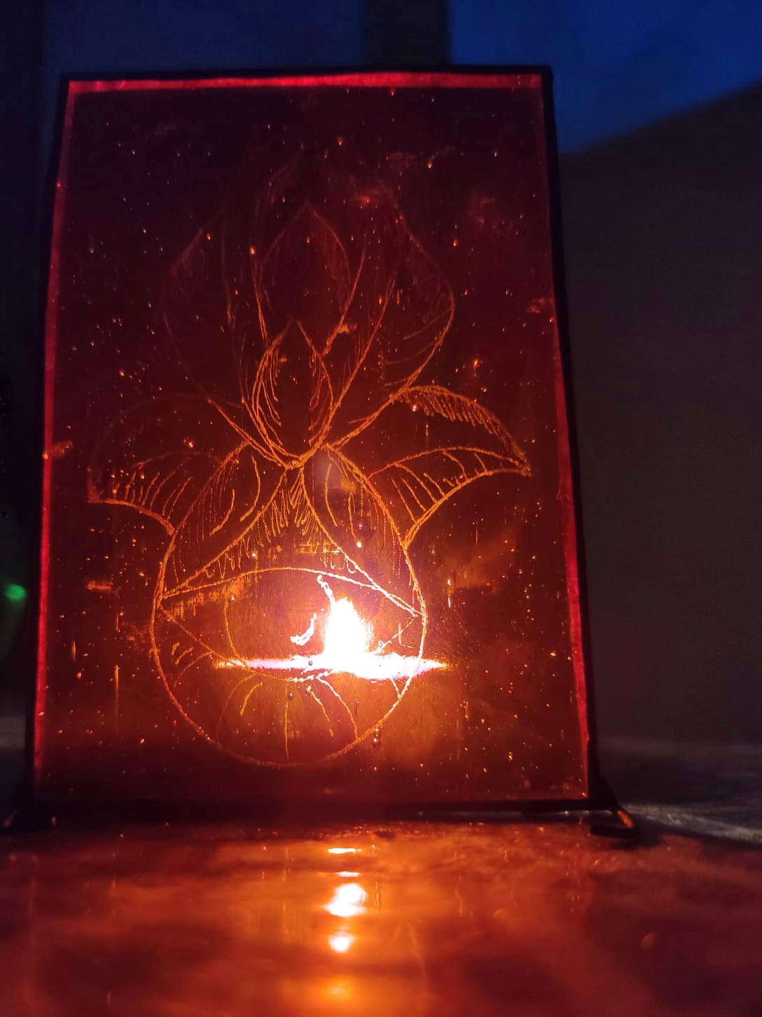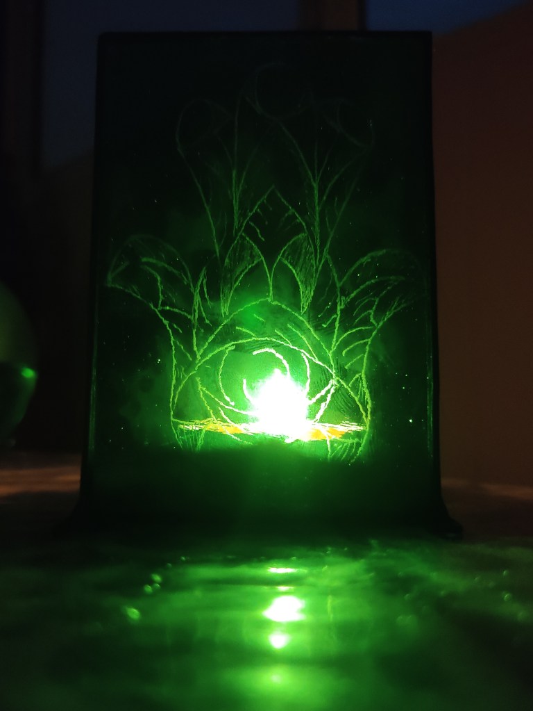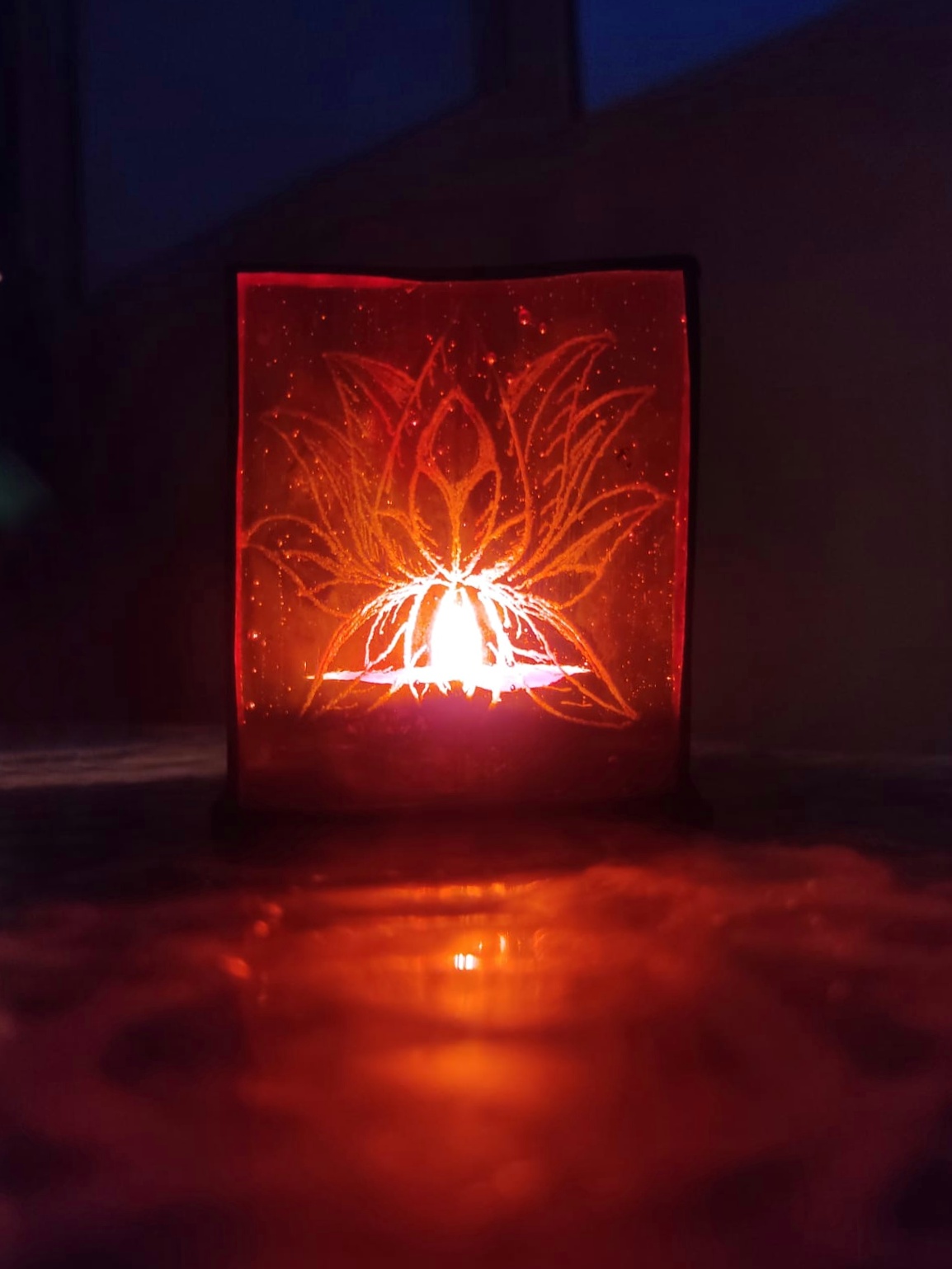 Al poner un foco de luz cálida, enciende la magia del grabado en vidrio, convirtiéndolo una experiencia única, que proyecta un juego de luces y sombras, que invita a la contemplación del espectáculo de luz.