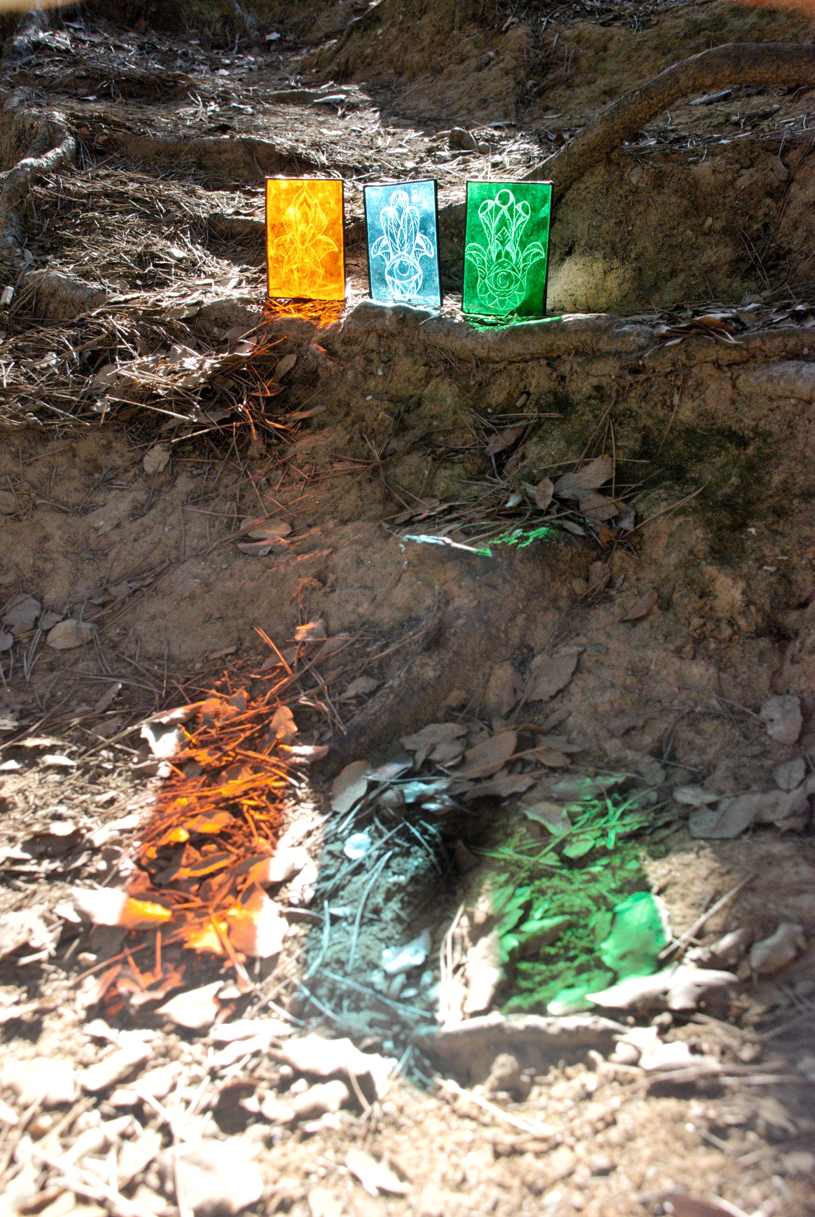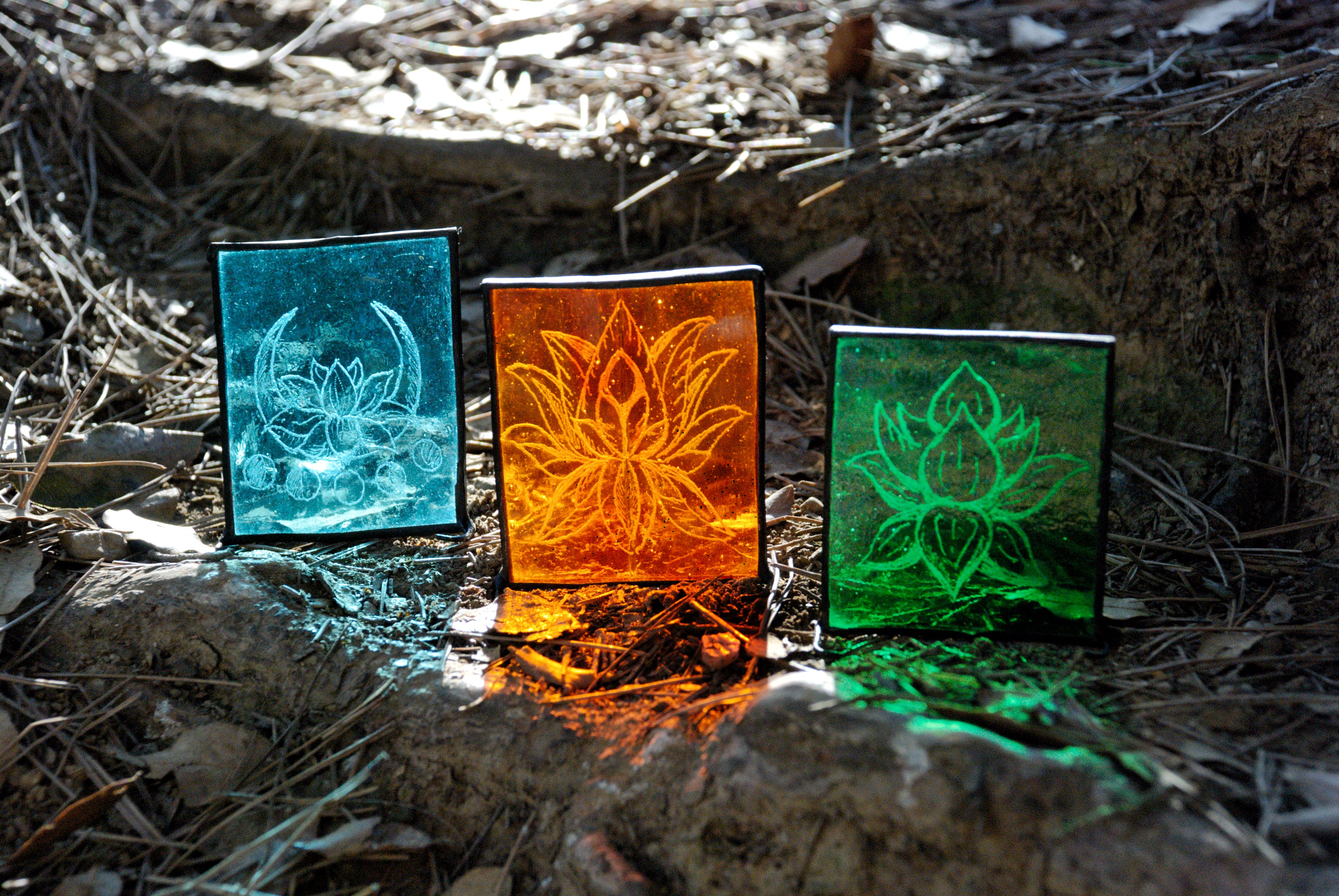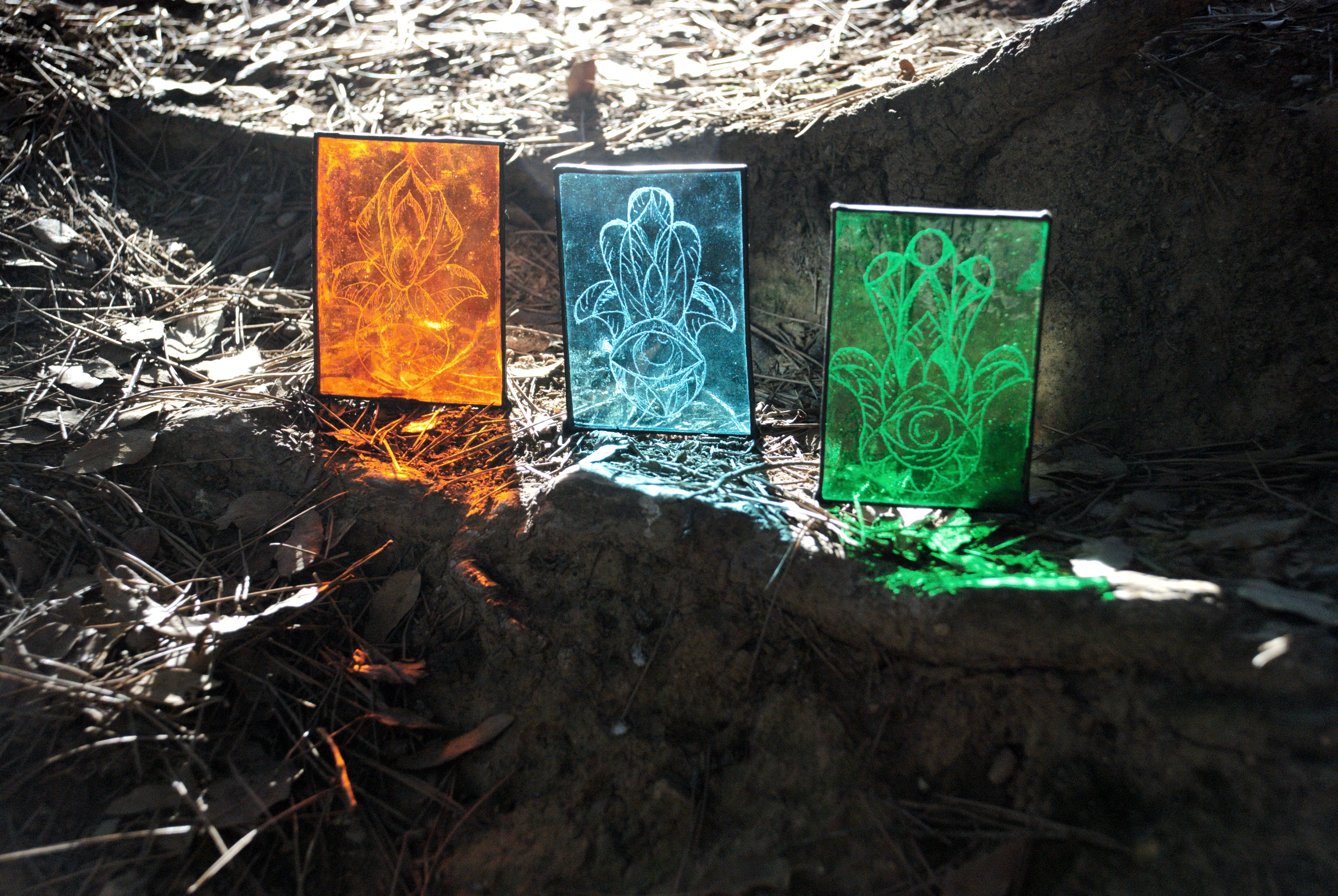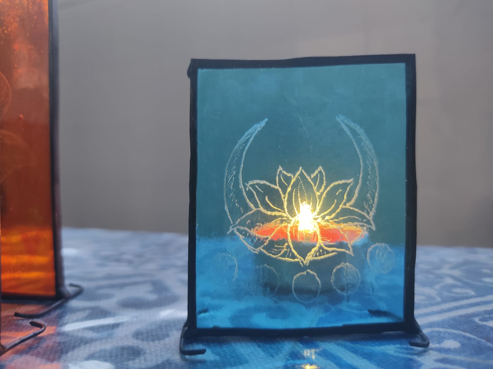 Portavelas enmarcados en vitrales coloridos grabados, que actúan como reflectores.