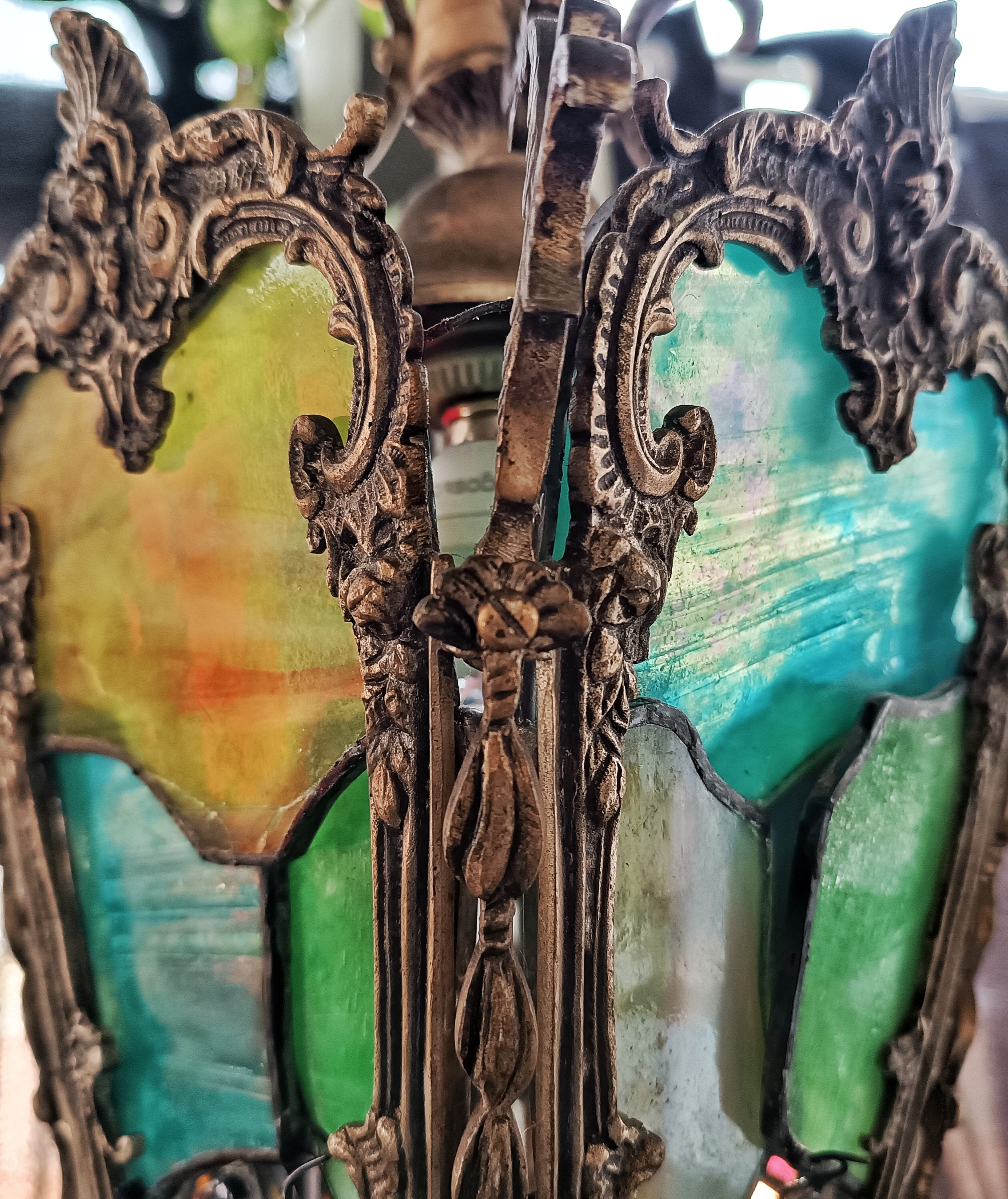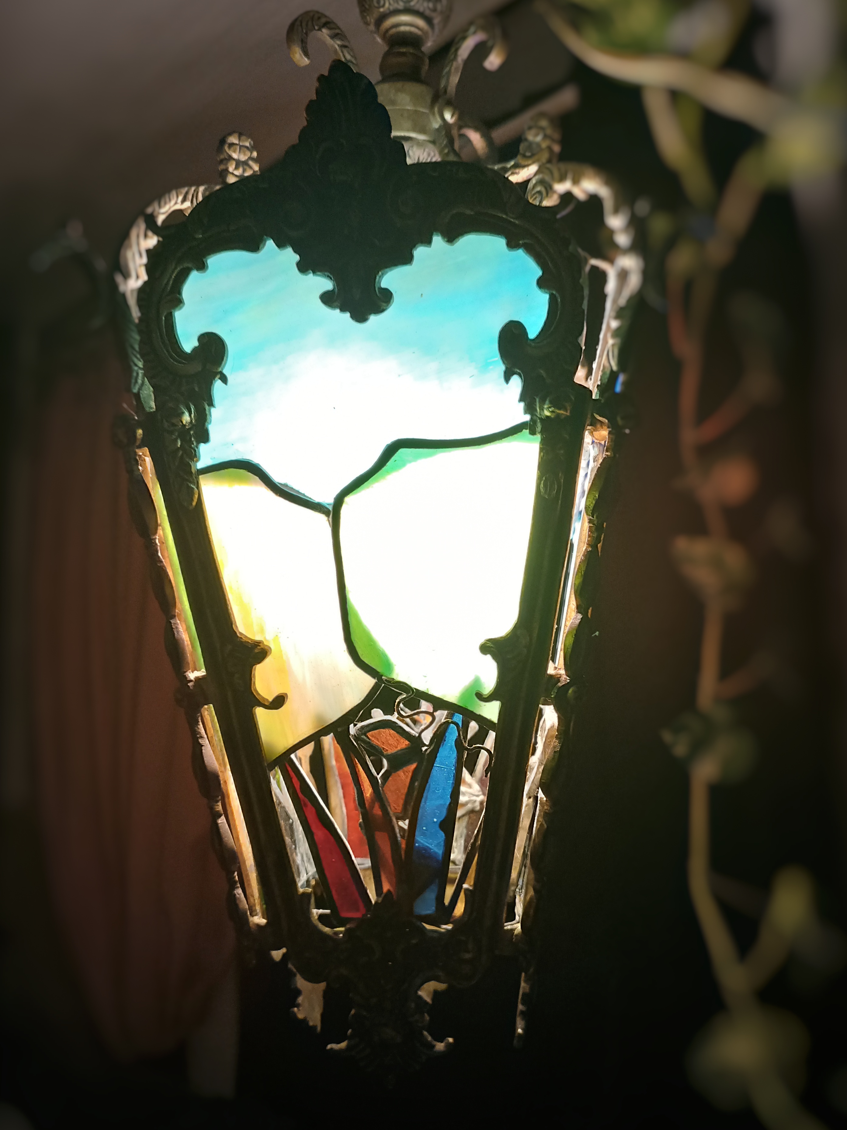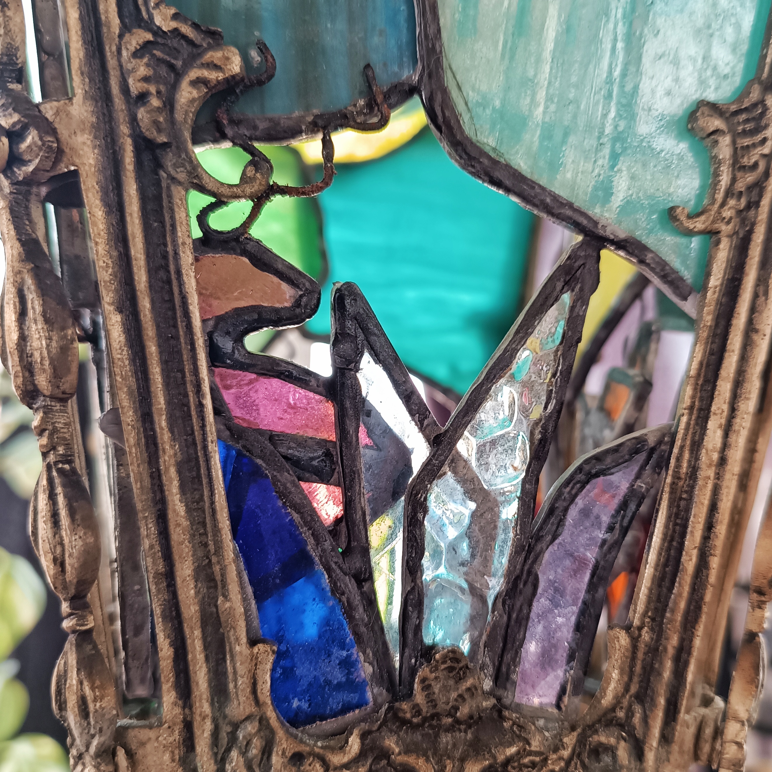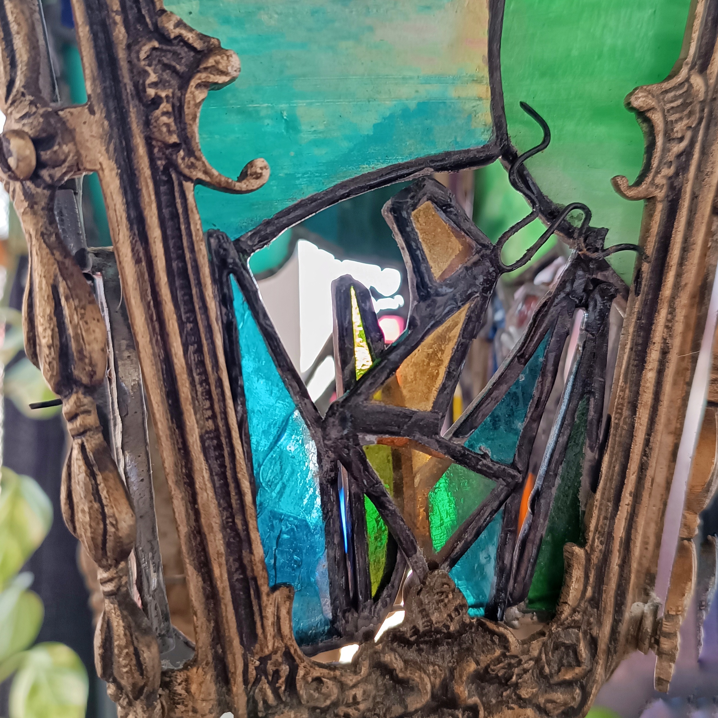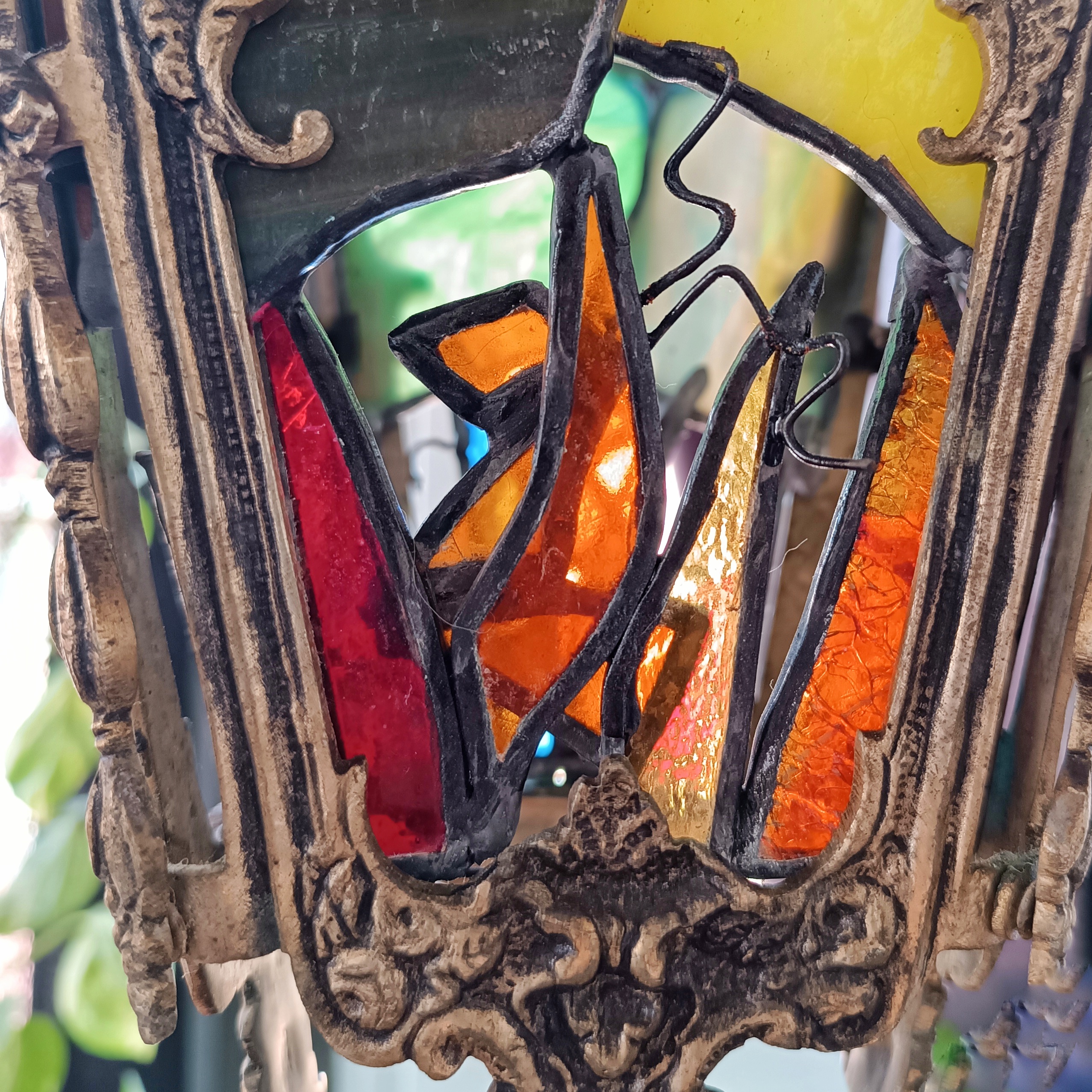 Antiguo farol de bronce embellecido para crear una obra única de vitral que ilustra la silueta de un ciervo a lo largo de las cuatro estaciones, inmerso en un entorno natural que cobra vida.