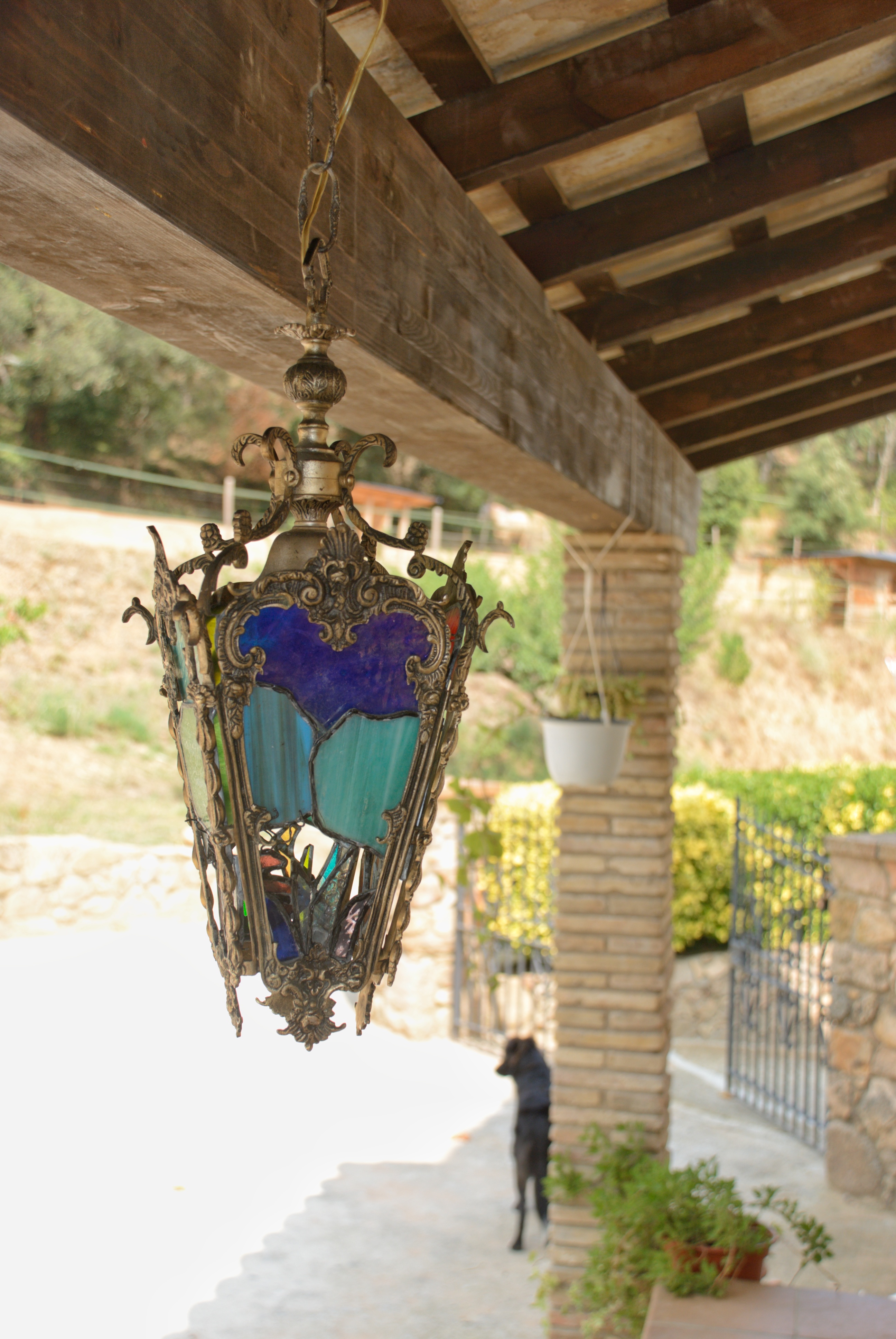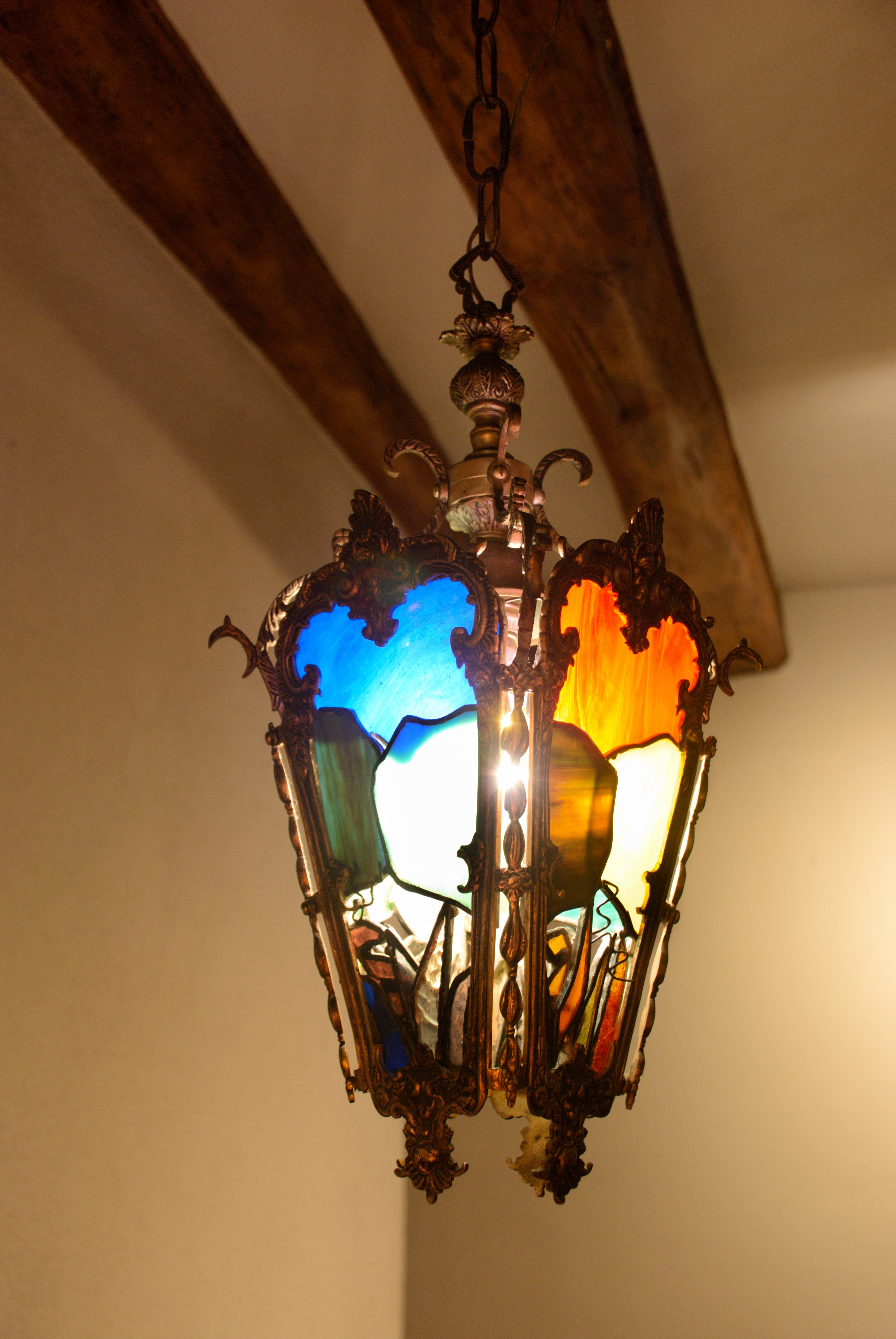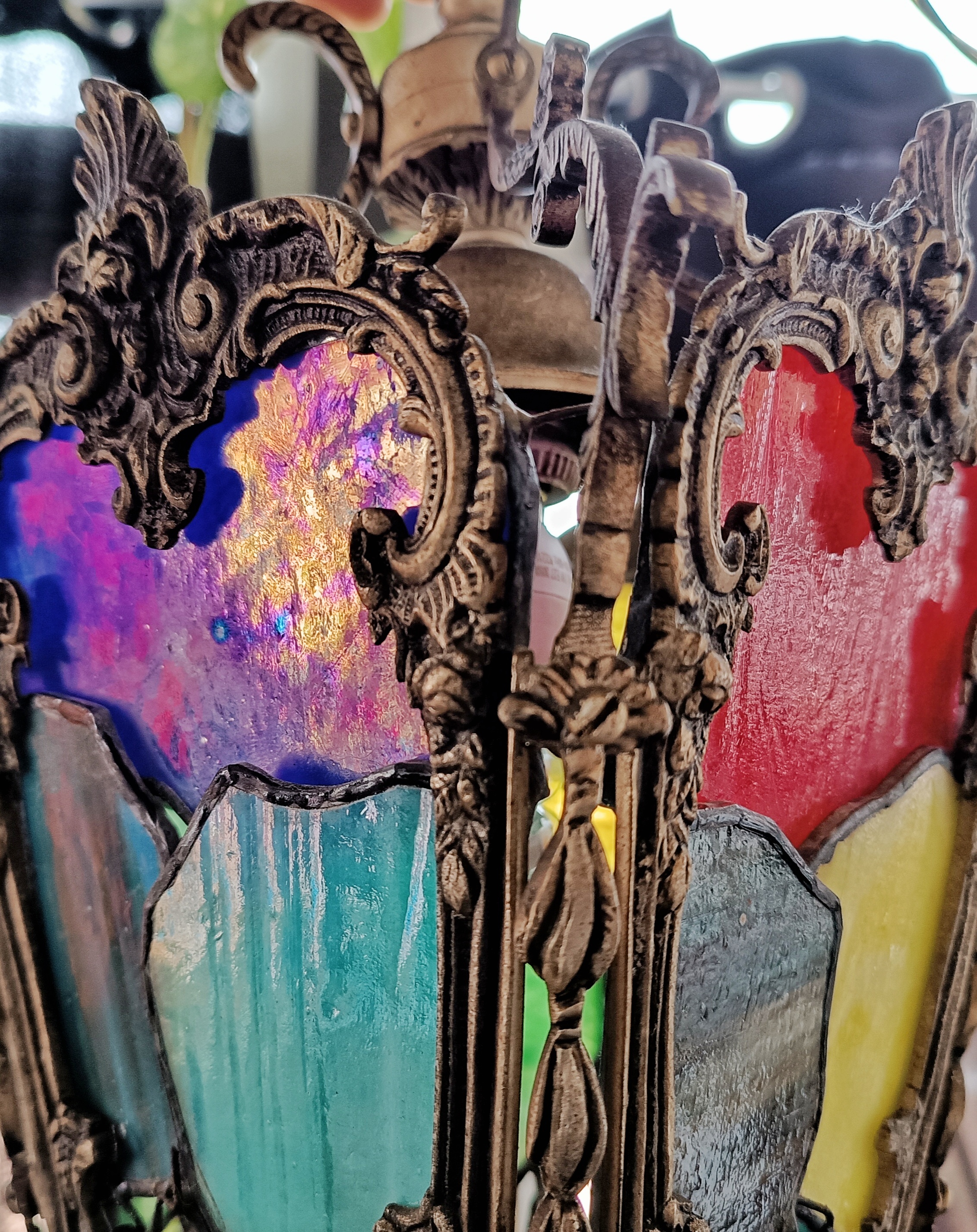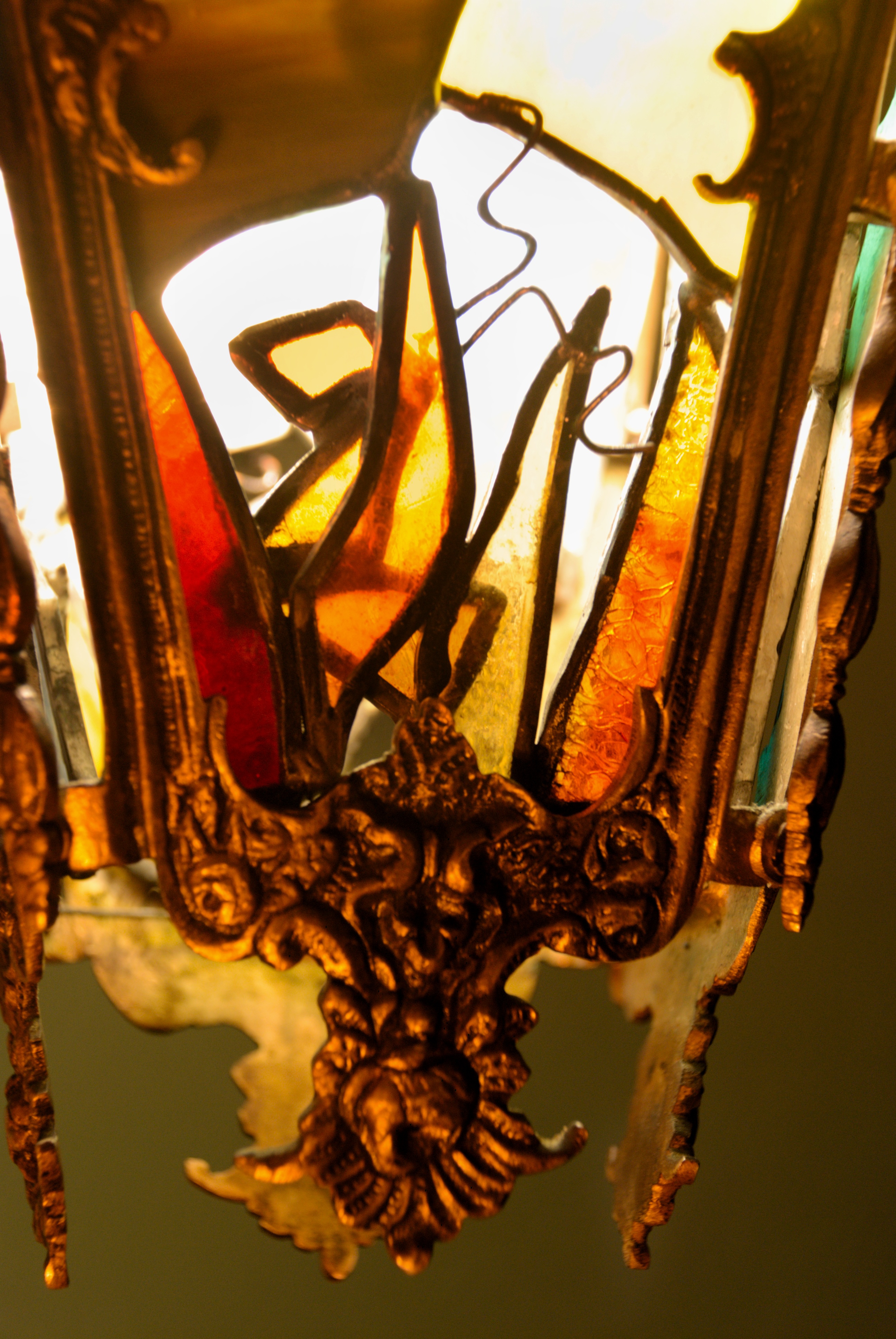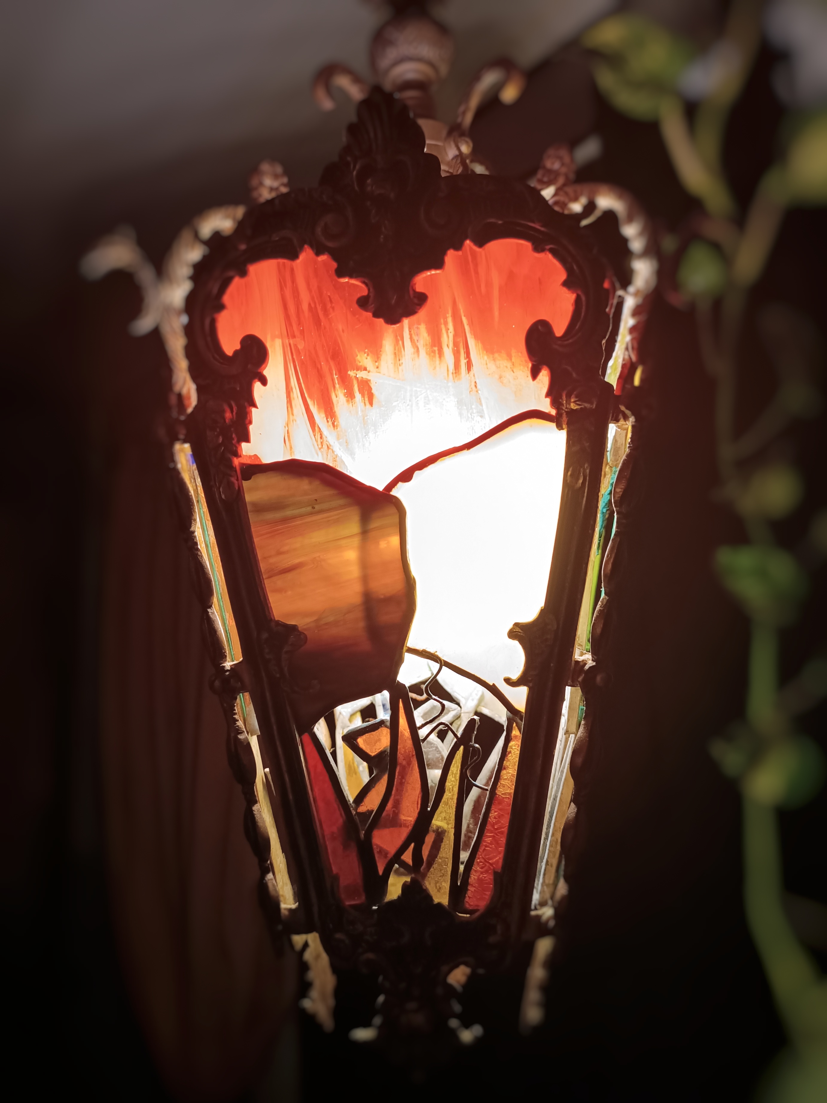 Antiguo farol de bronce embellecido para crear una obra única de vitral que ilustra la silueta de un ciervo a lo largo de las cuatro estaciones, inmerso en un entorno natural que cobra vida.