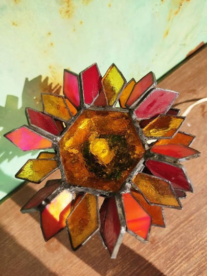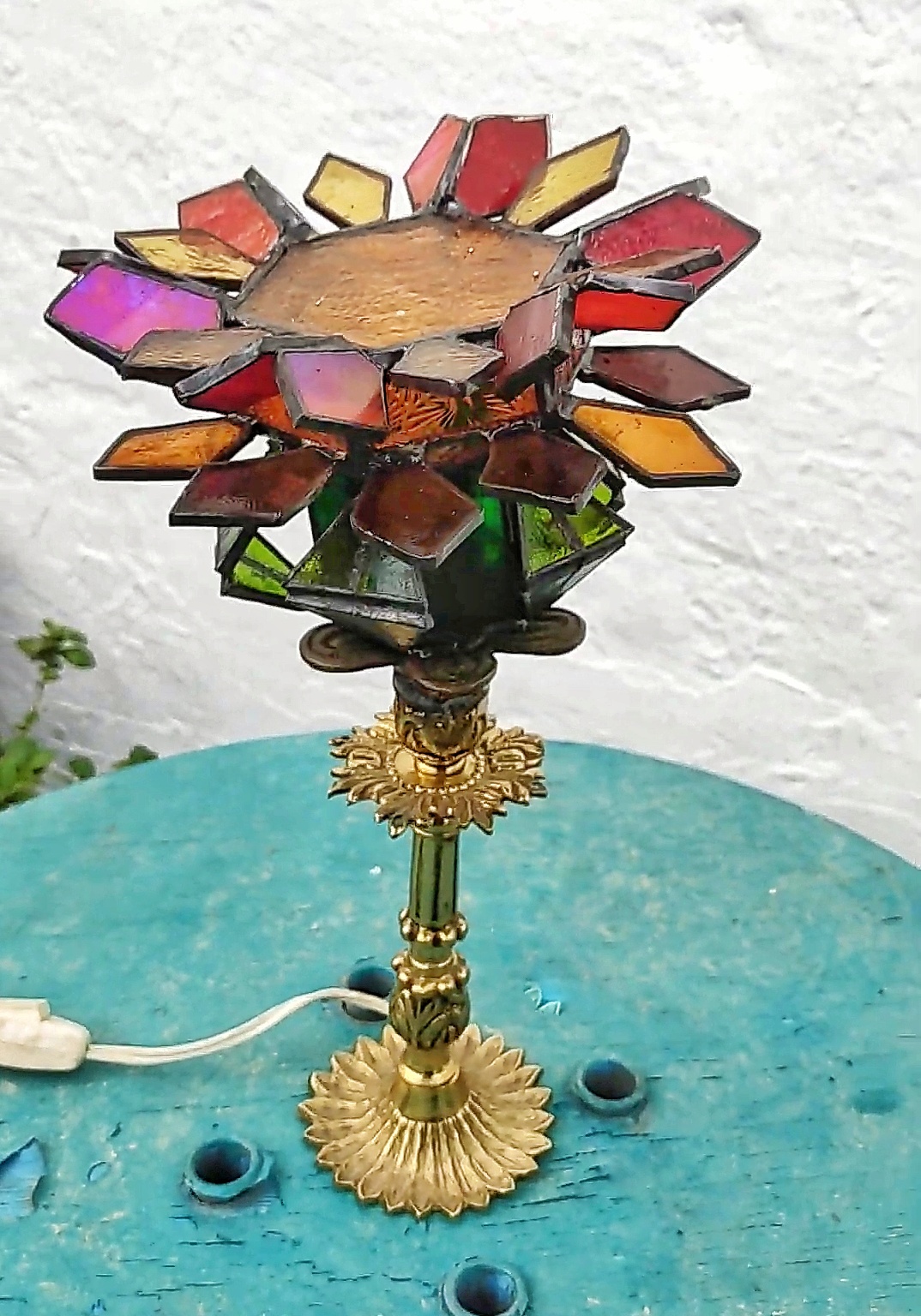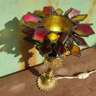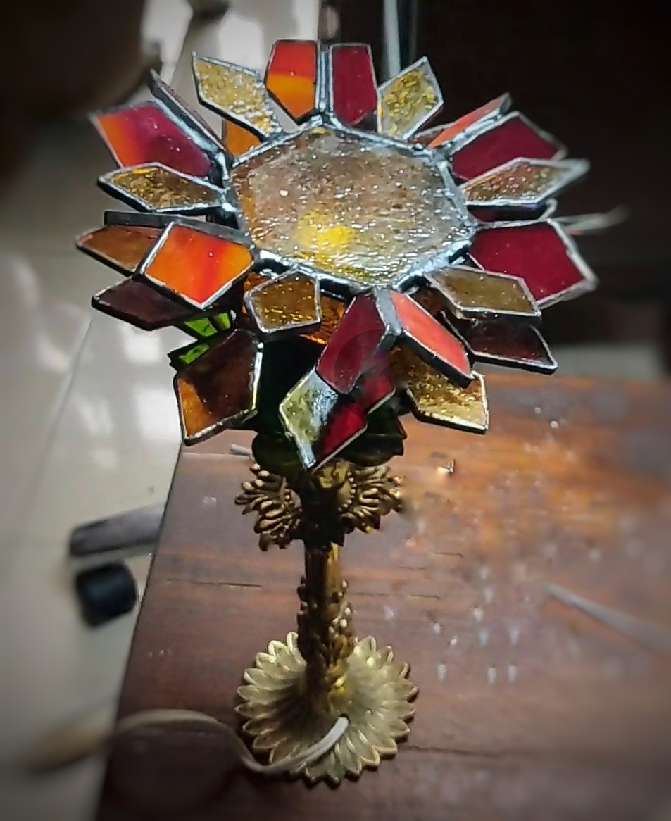 Su estructura floral, inspirada en la forma de un girasol, se fusiona con una base ornamentada de bronce antiguo que sirve como soporte.