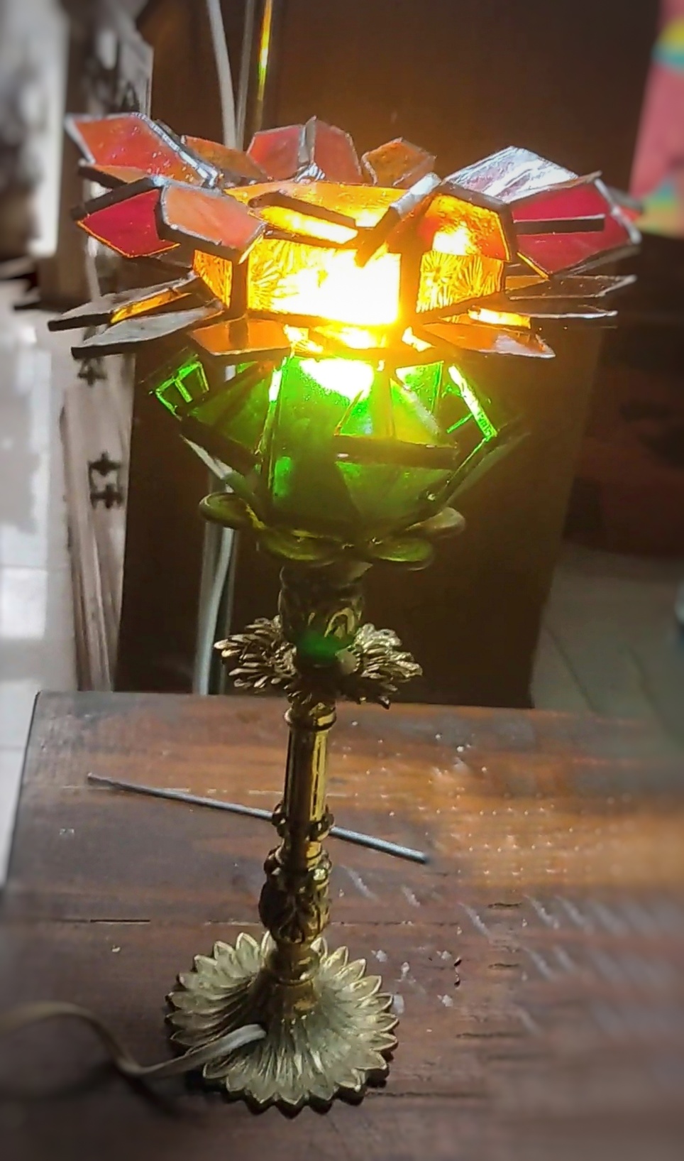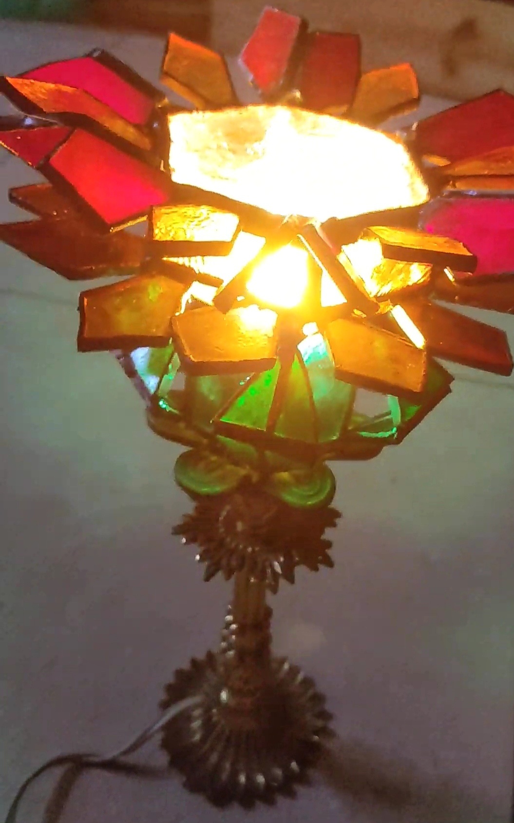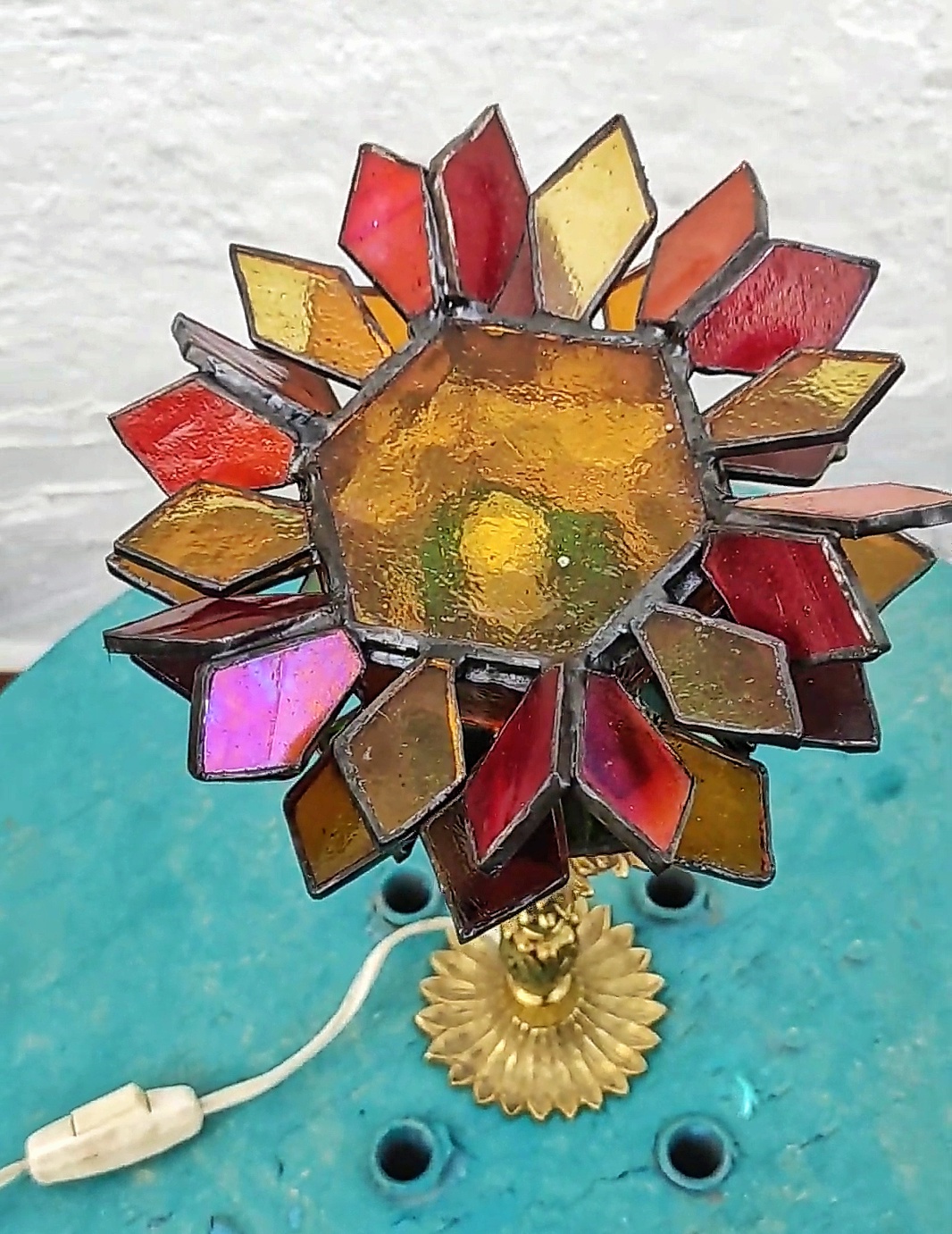 Su estructura floral, inspirada en la forma de un girasol, se fusiona con una base ornamentada de bronce antiguo que sirve como soporte.