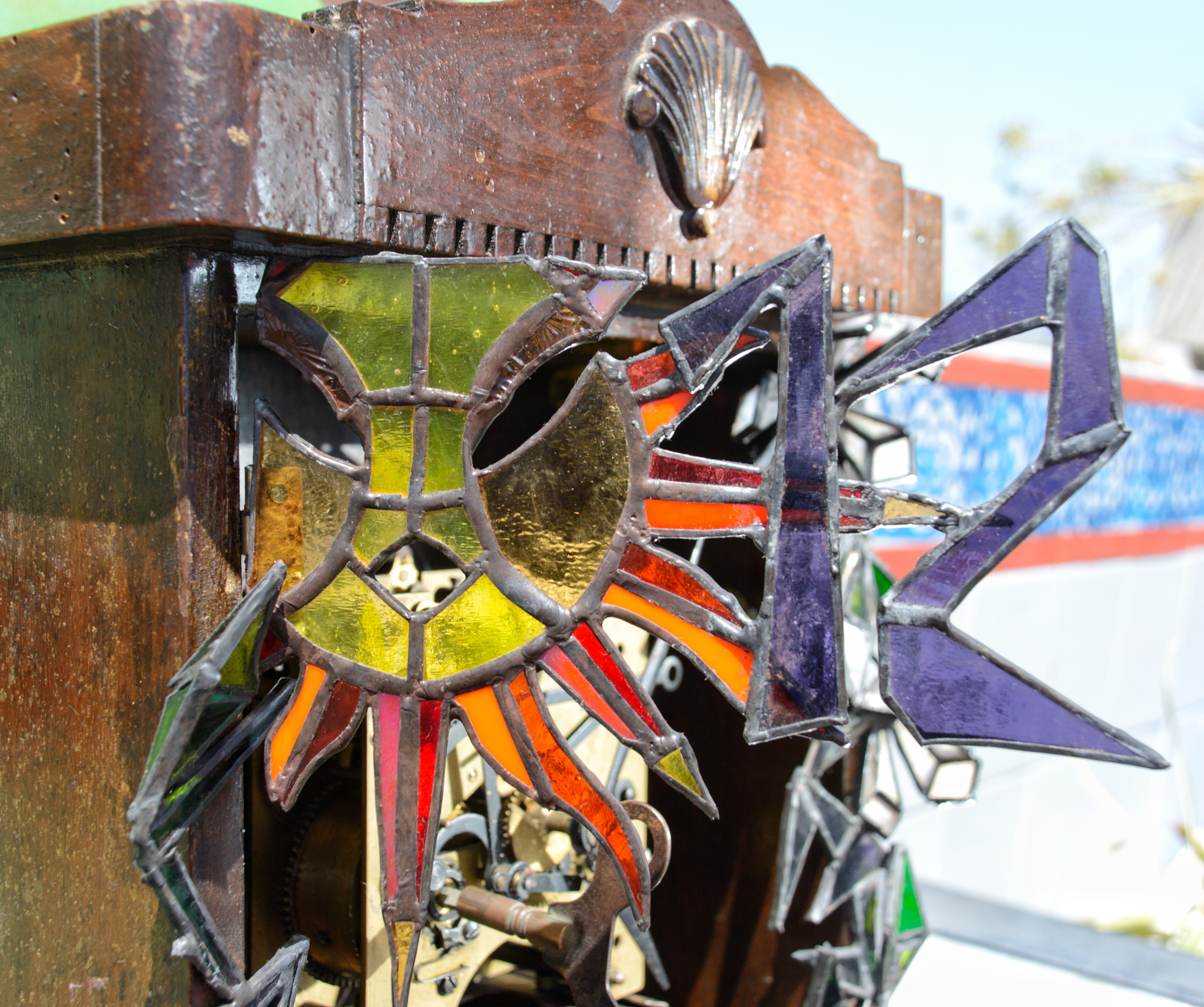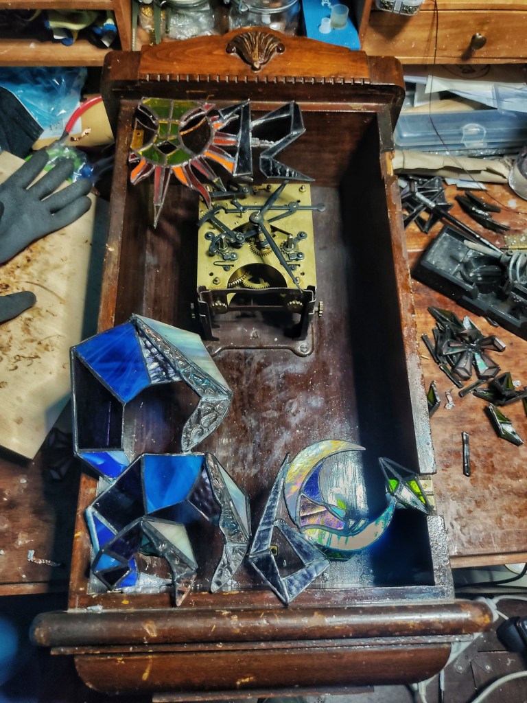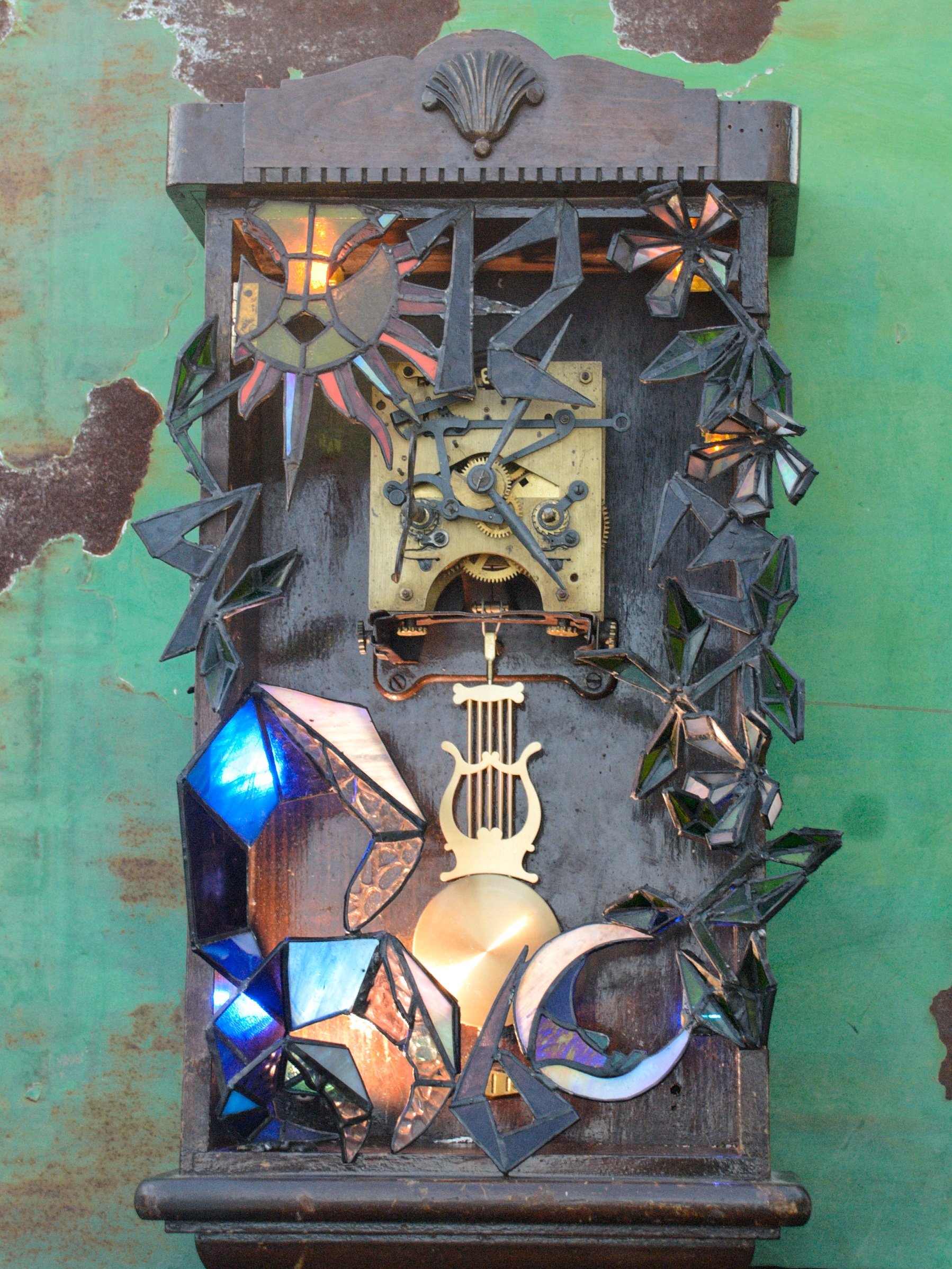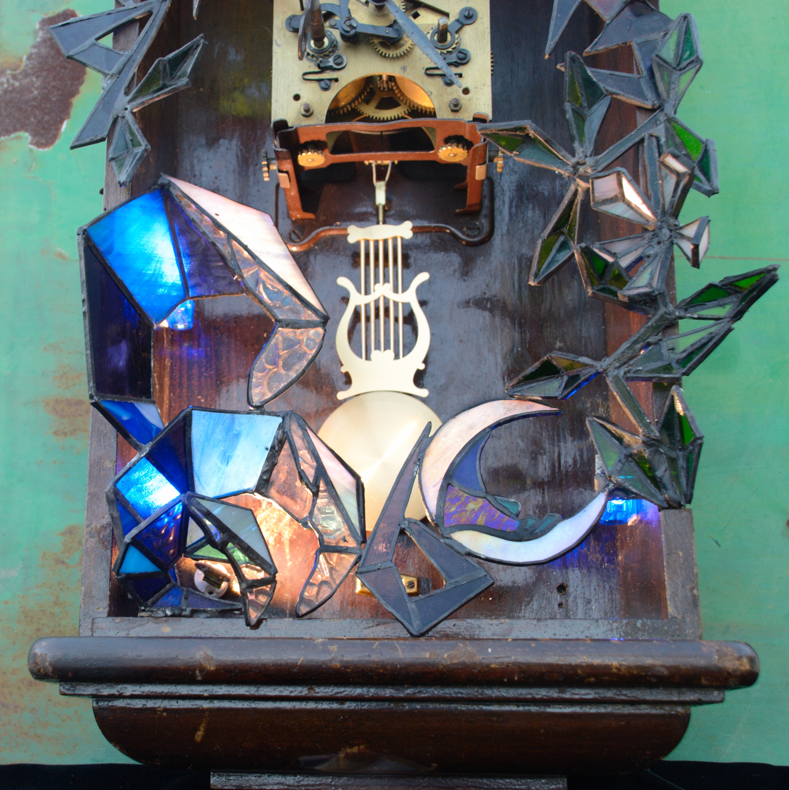 Reutilizamos un reloj de péndulo antiguo para crear esta exclusiva lámpara que combina distintas creaciones de vidrieras decoradas al estilo Tiffany geométrico.