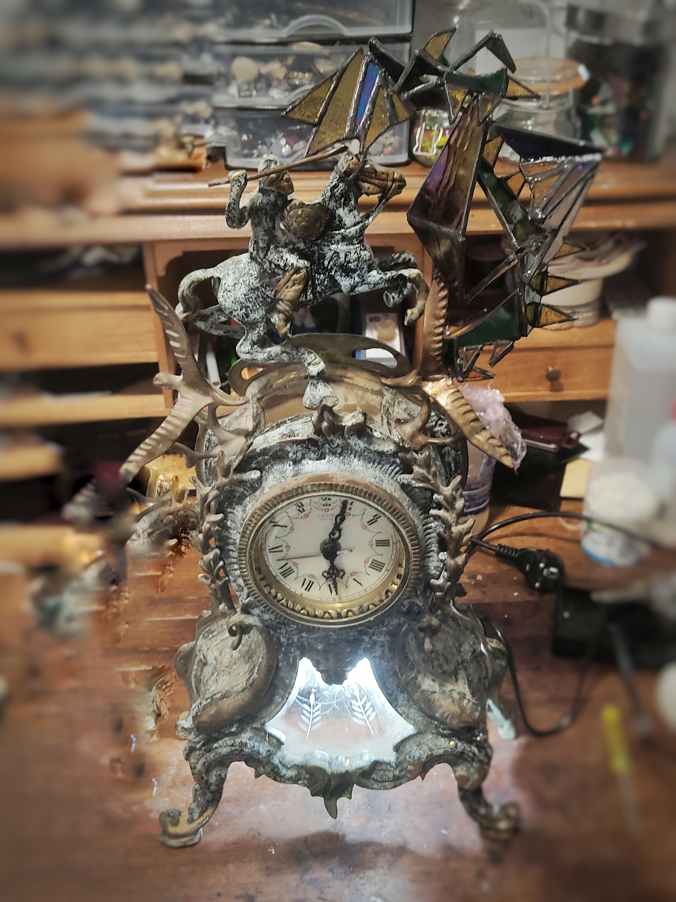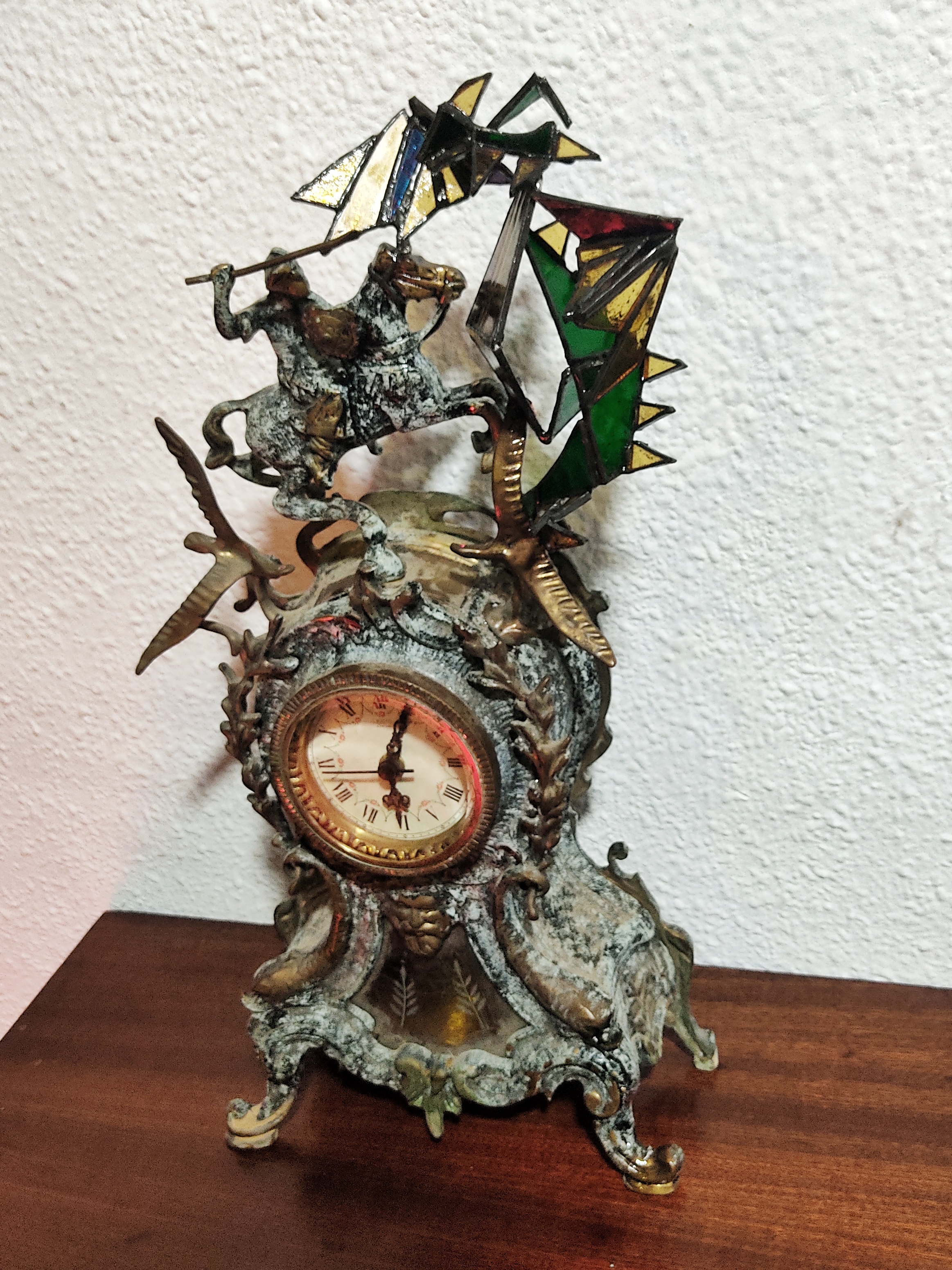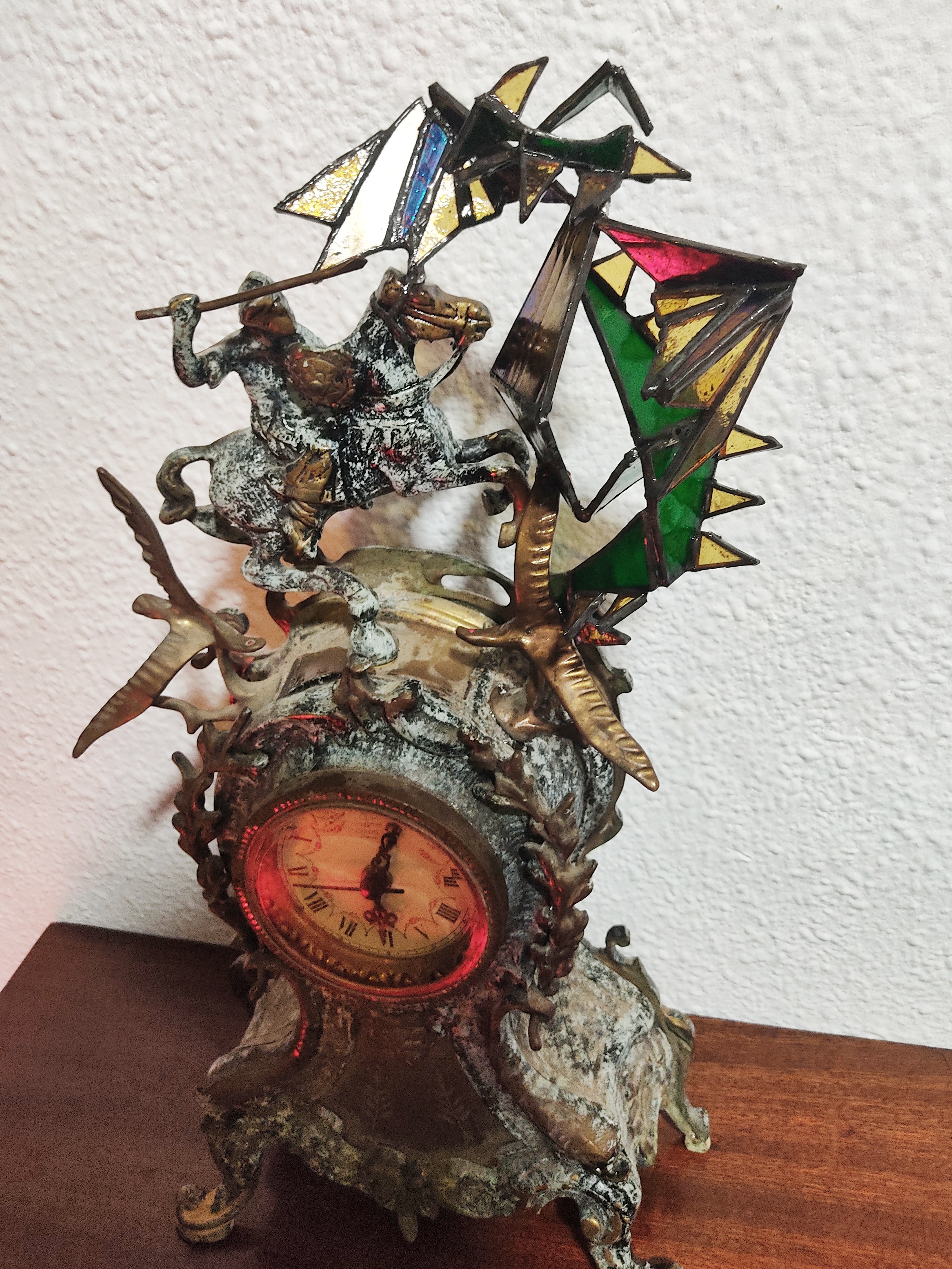 Redecoramos un reloj de bronce antiguo, inspirándonos en la leyenda de Sant Jordi. Aprovechamos el escenario de un caballero en su corcel, para adaptar la figura de un dragón de vidrio.