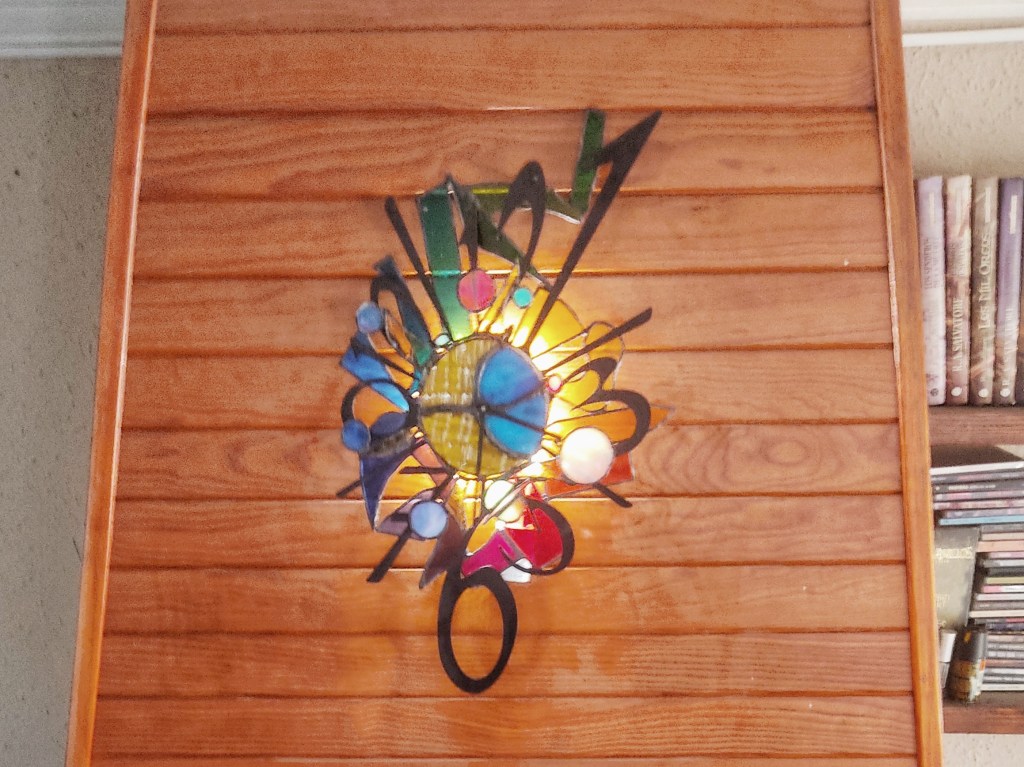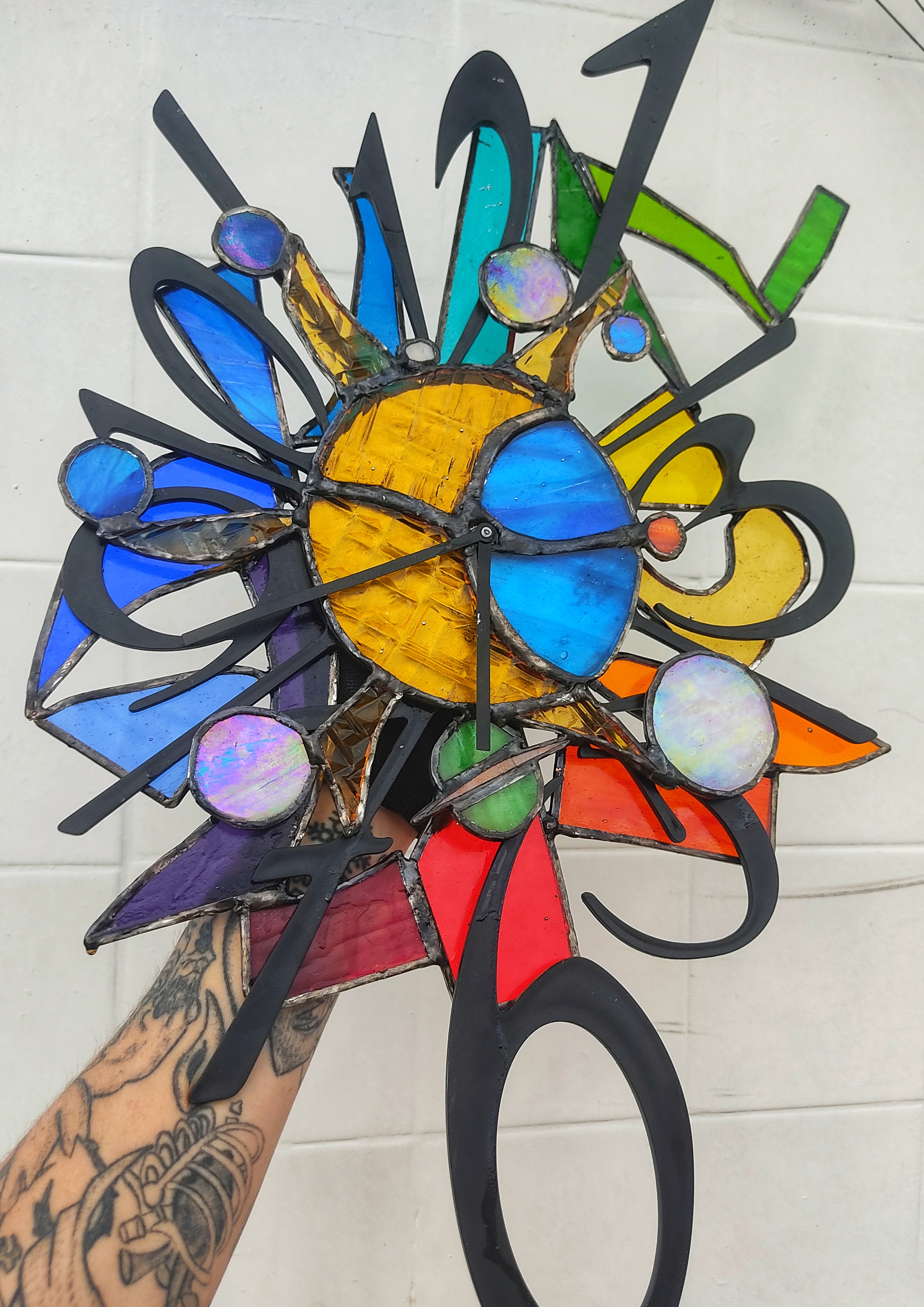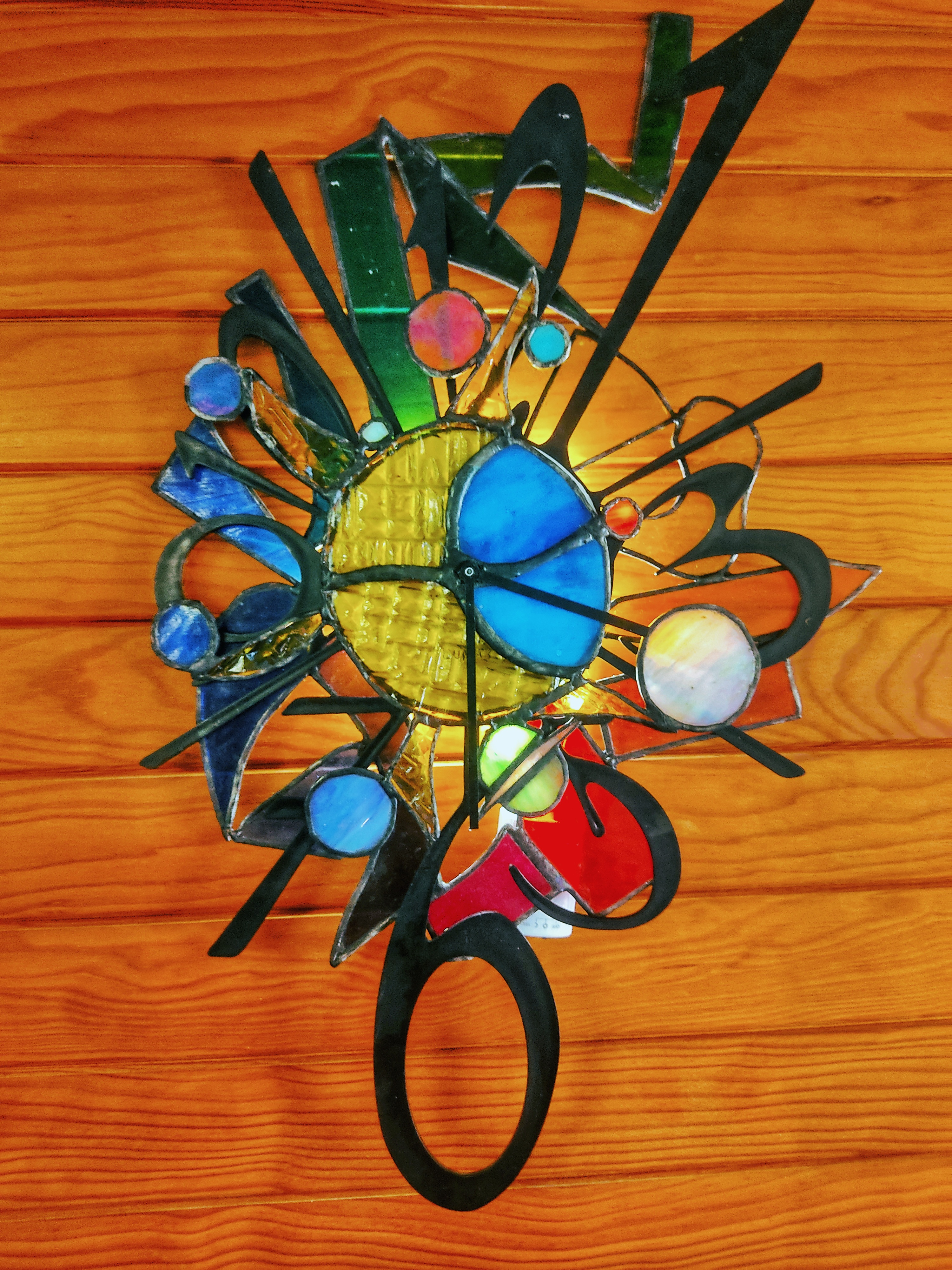 Partiendo de una base de reloj recuperada, diseñamos una estructura de vitrales distribuida en tres dimensiones, que además sirve como una encantadora luz ambiental, gracias a su sistema de retroiluminación LED.