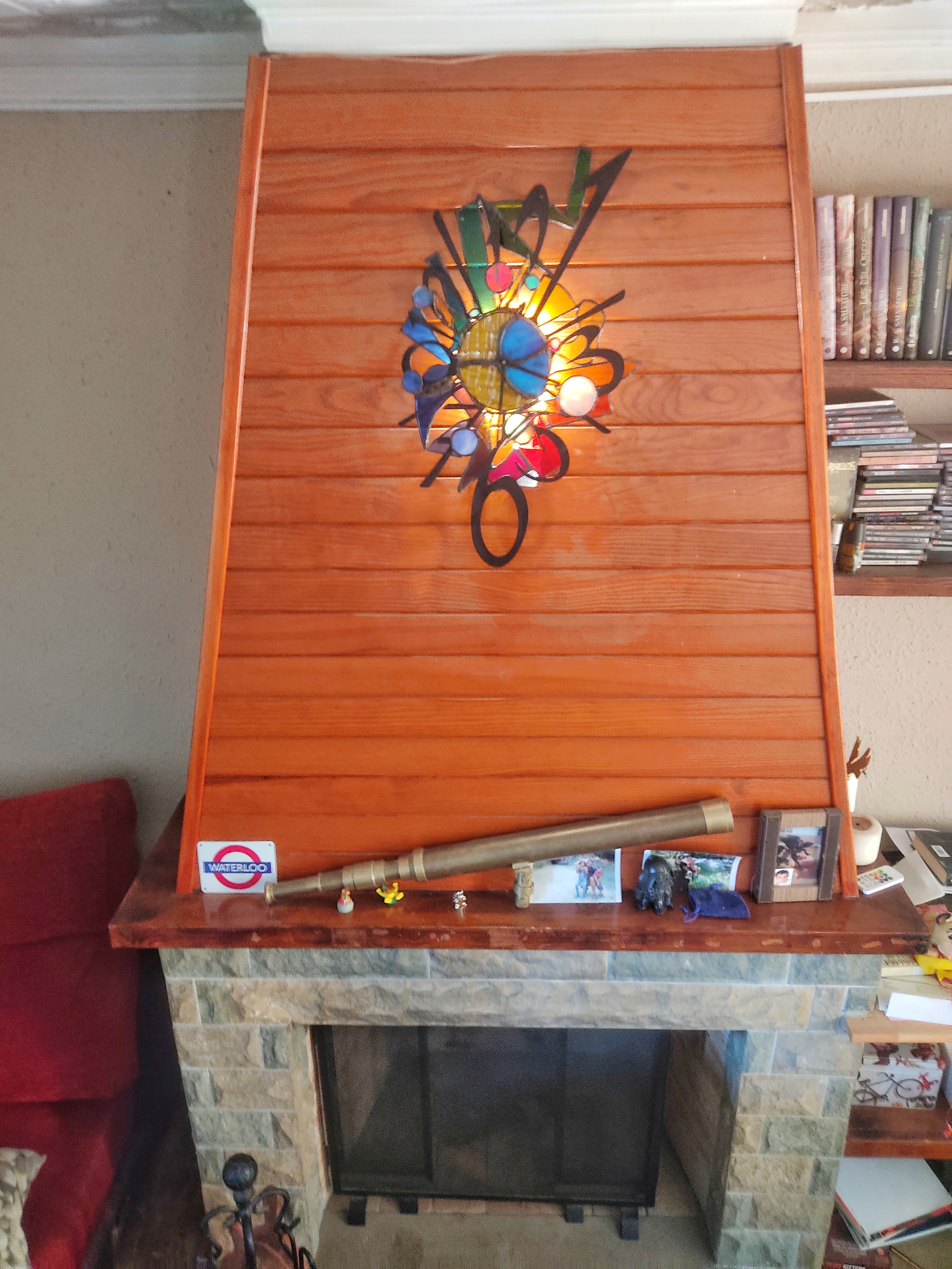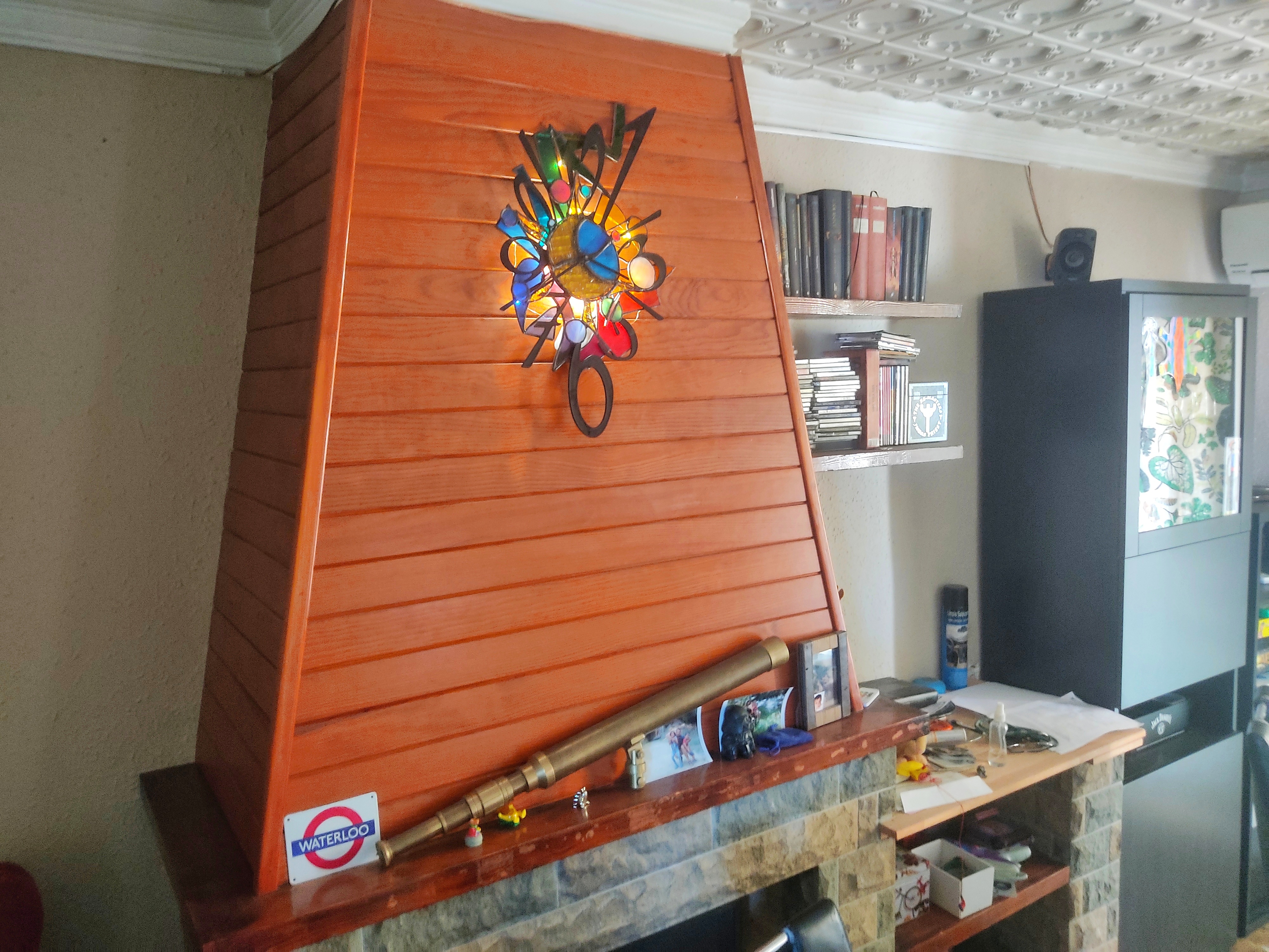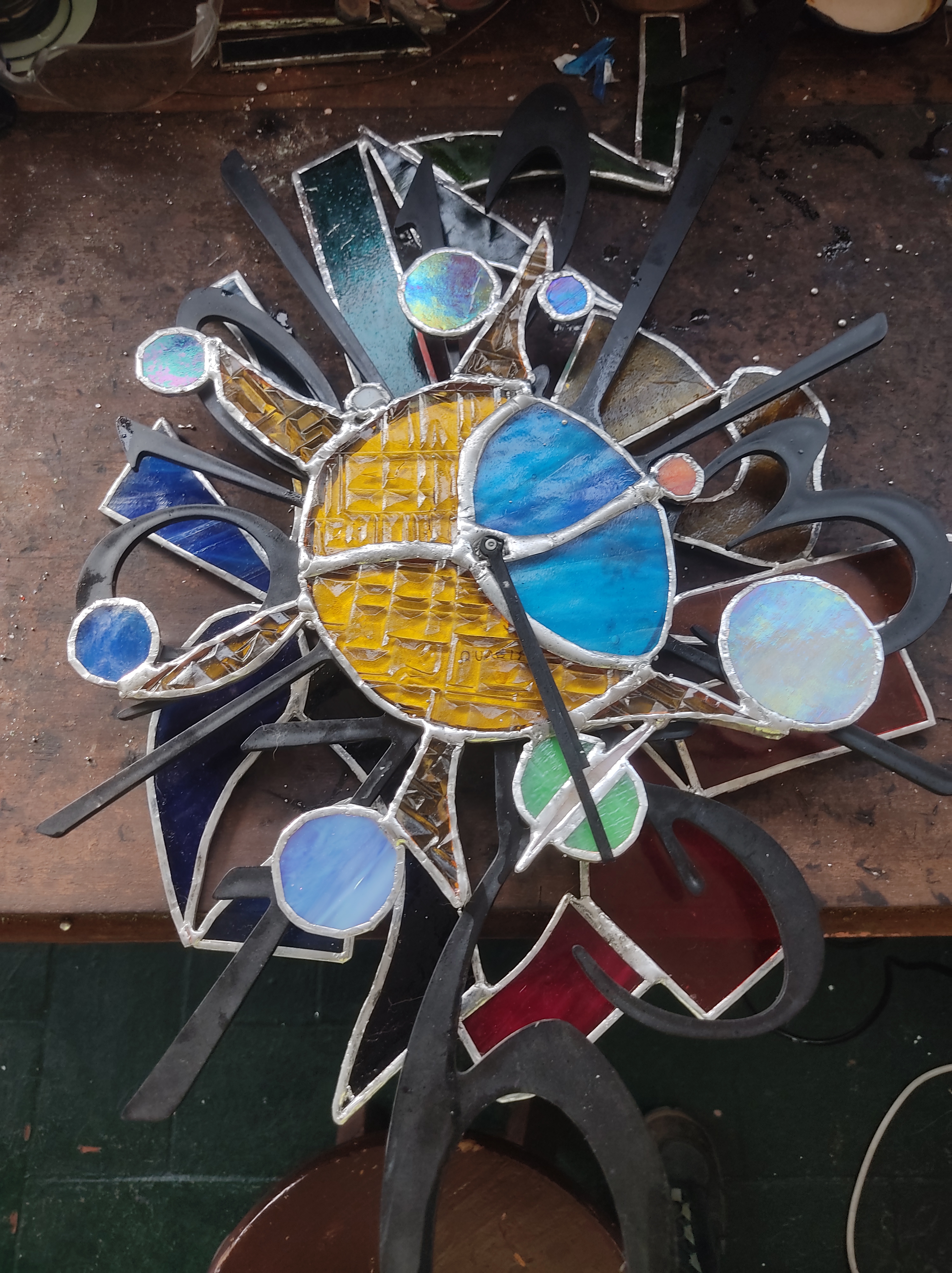 En la capa más distante, configuramos un círculo abstracto compuesto por piezas de vidrio reciclado, meticulosamente ensambladas para destacar sus vibrantes tonalidades. Incorporamos un mecanismo manual que nos permite rotar este círculo de colores, ajustándolos según el momento del día: tonos cálidos para las horas diurnas y tonos fríos para las nocturnas.
