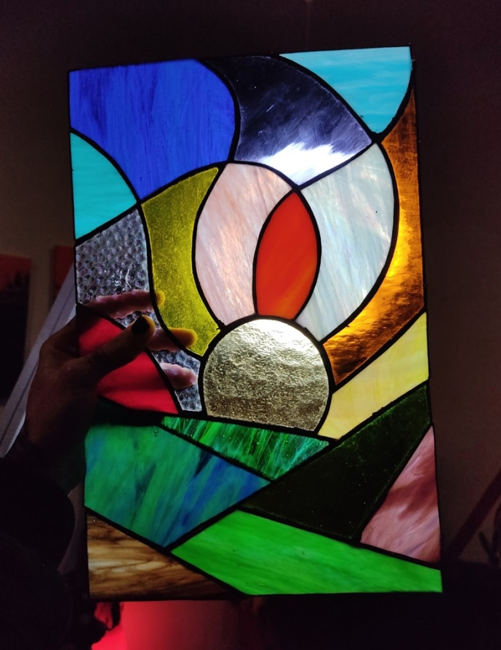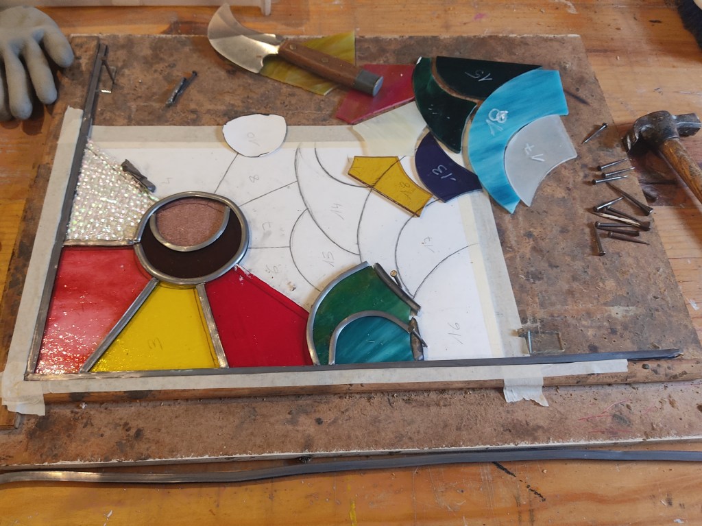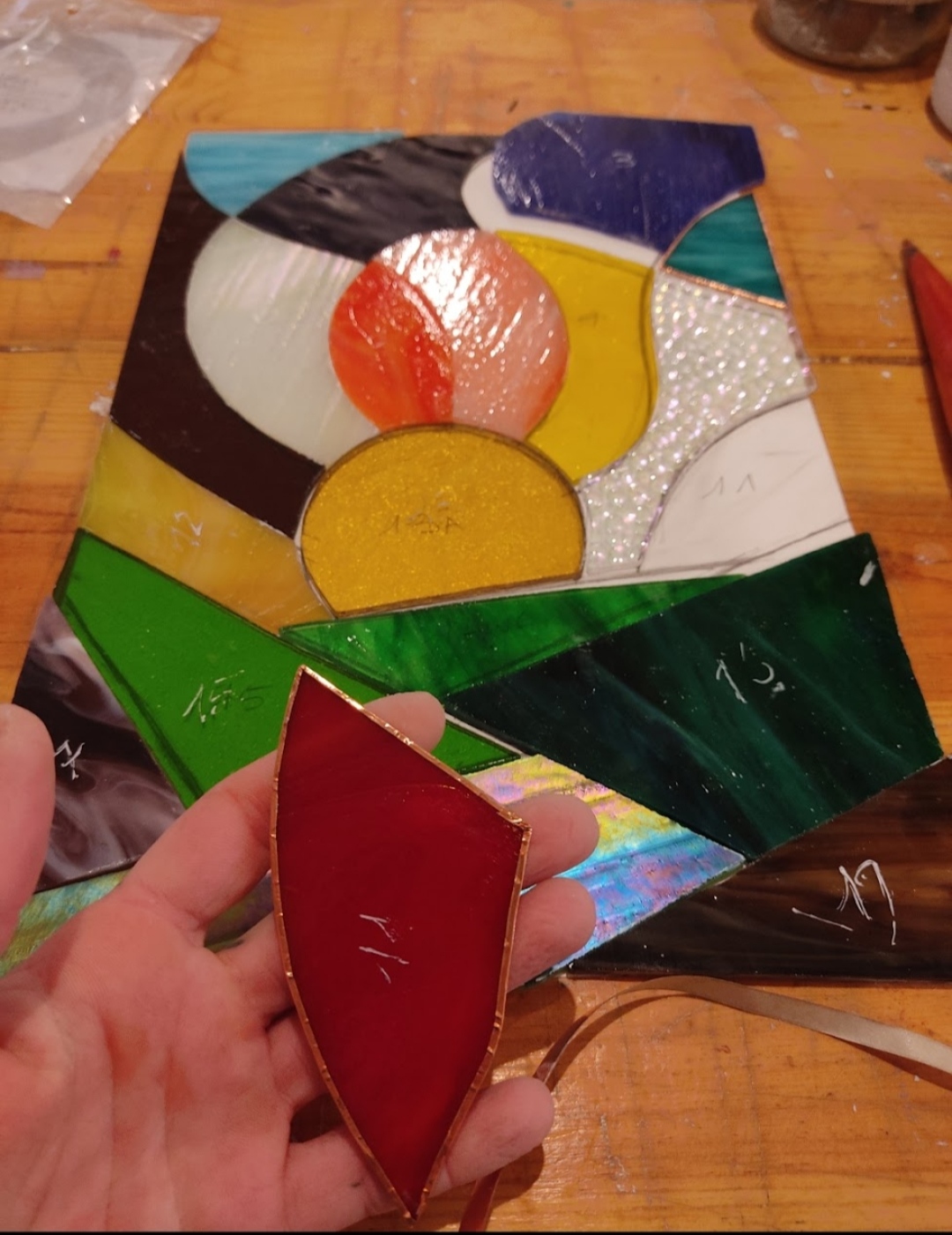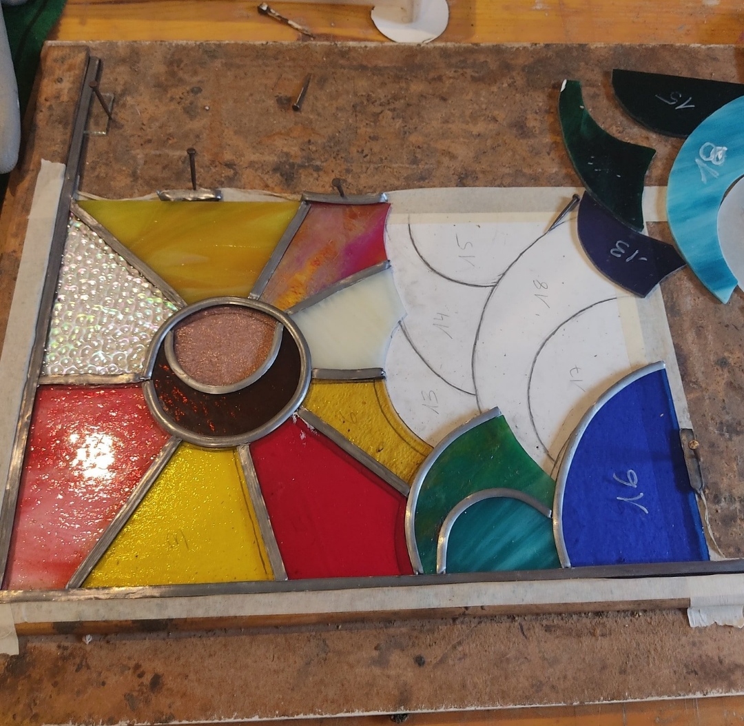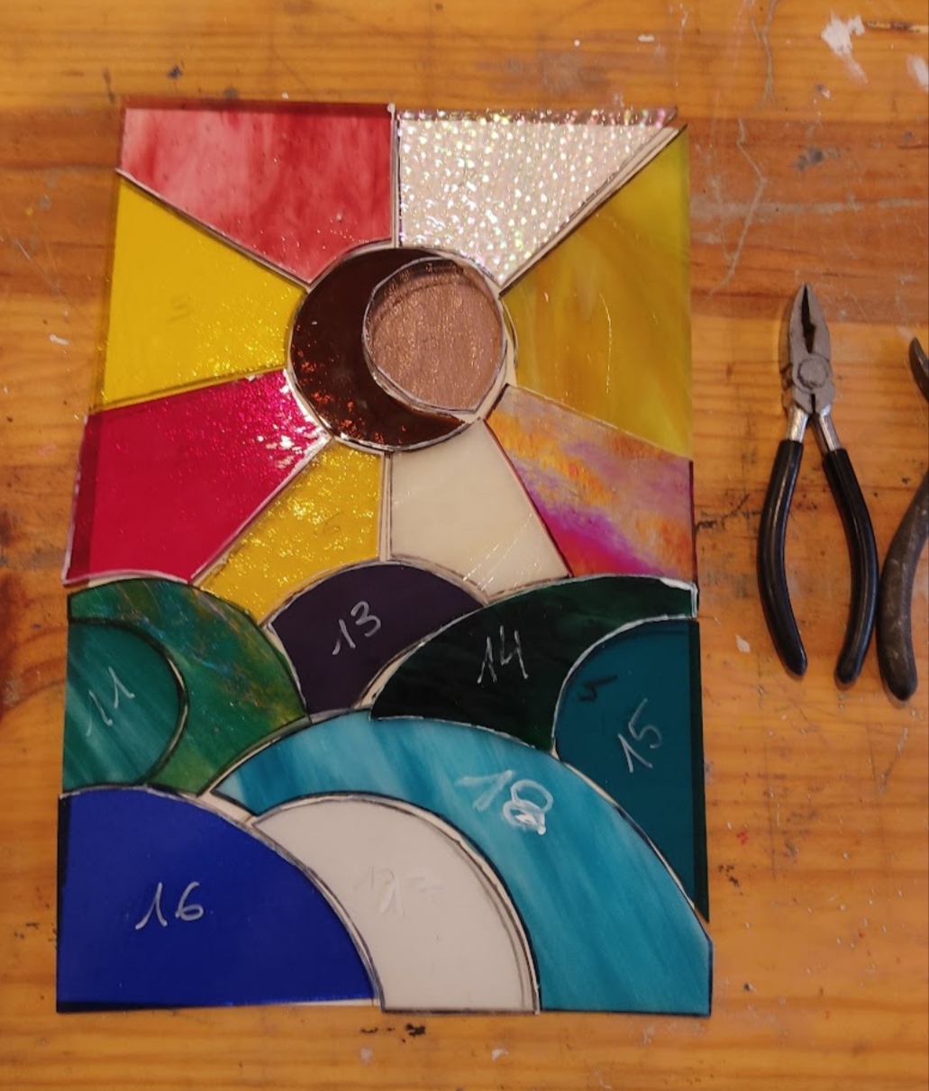 En la vidriera del sol usamos la técnica tradicional Tiffany que consiste en envolver cuidadosamente cada pieza de vidrio con cinta de cobre, posteriormente soldada.