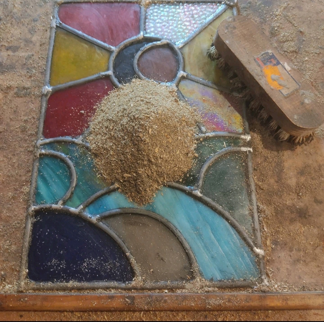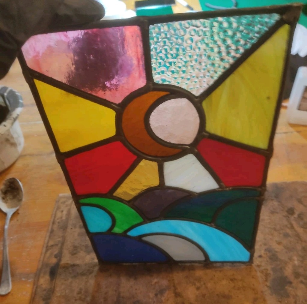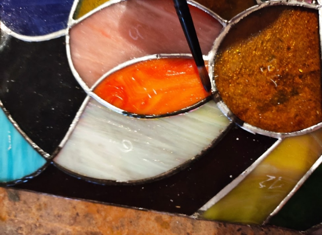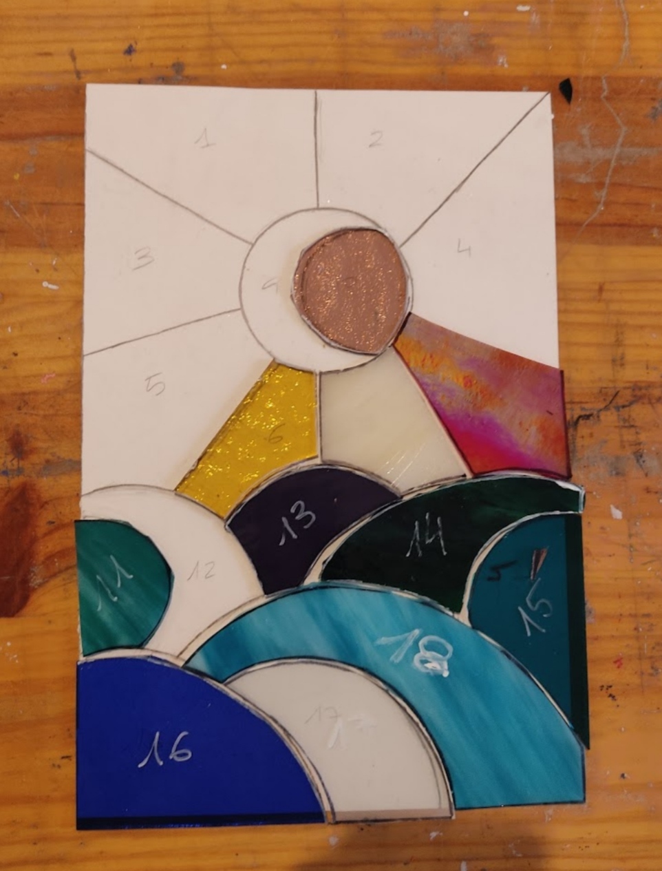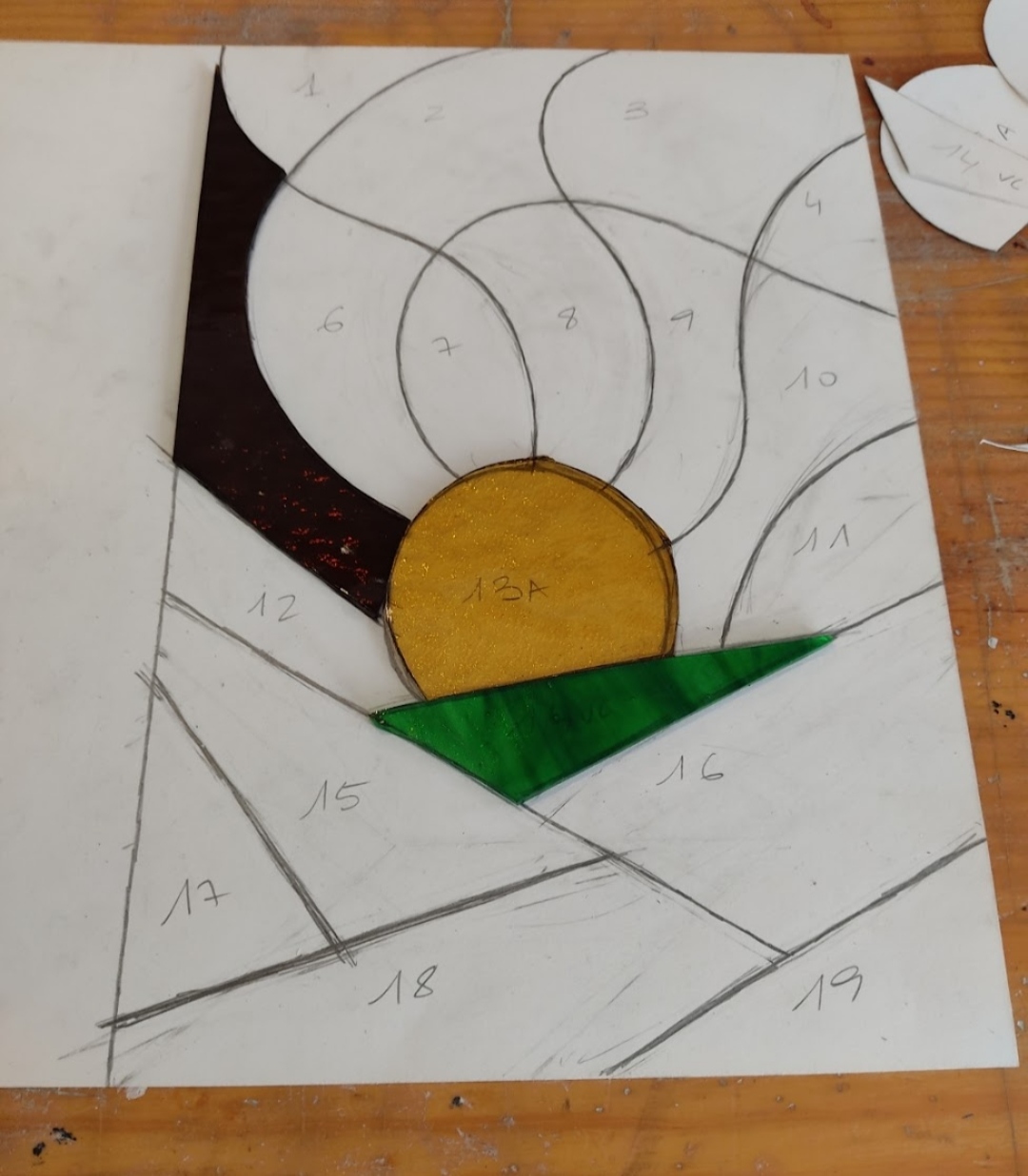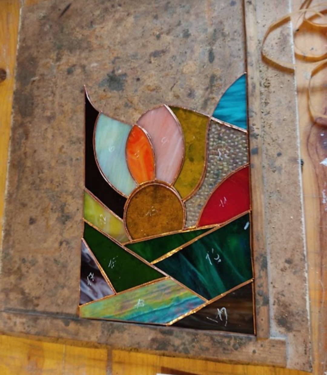 En la vidriera del sol usamos la técnica tradicional Tiffany que consiste en envolver cuidadosamente cada pieza de vidrio con cinta de cobre, posteriormente soldada.